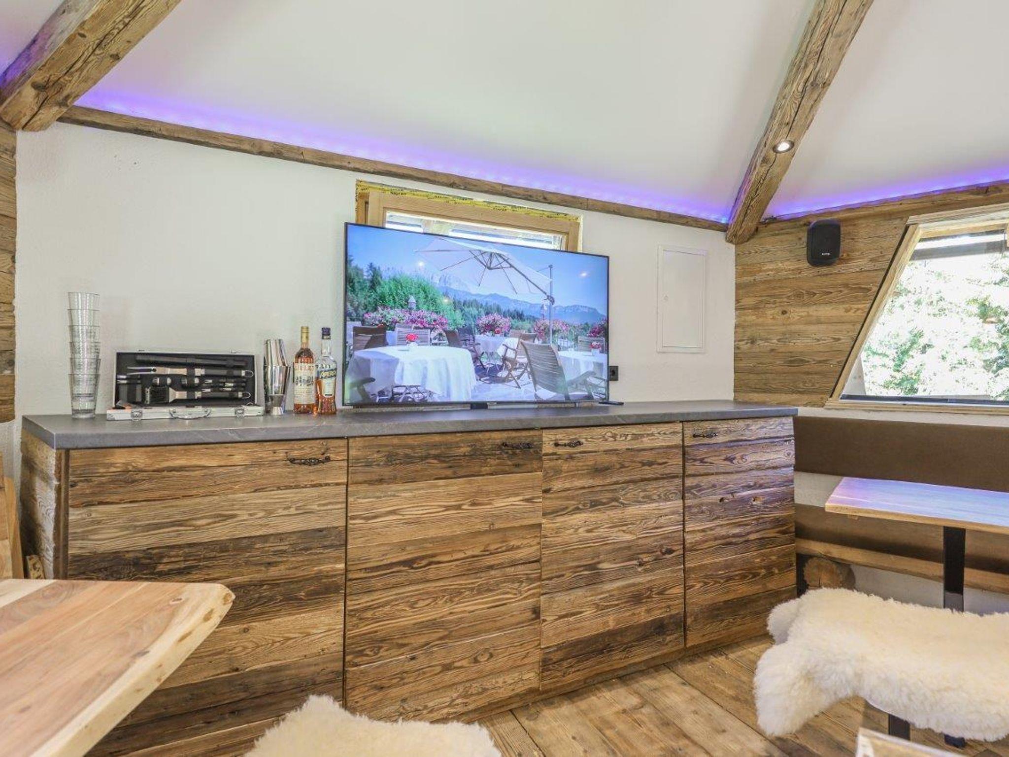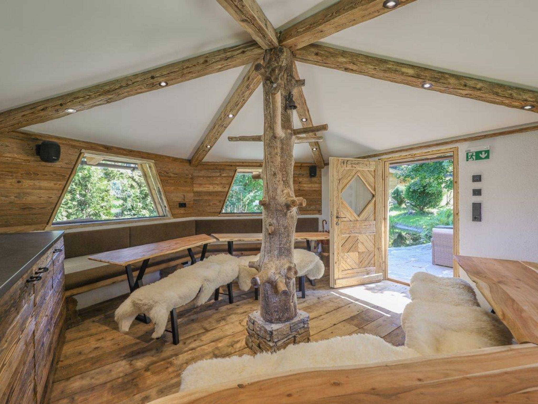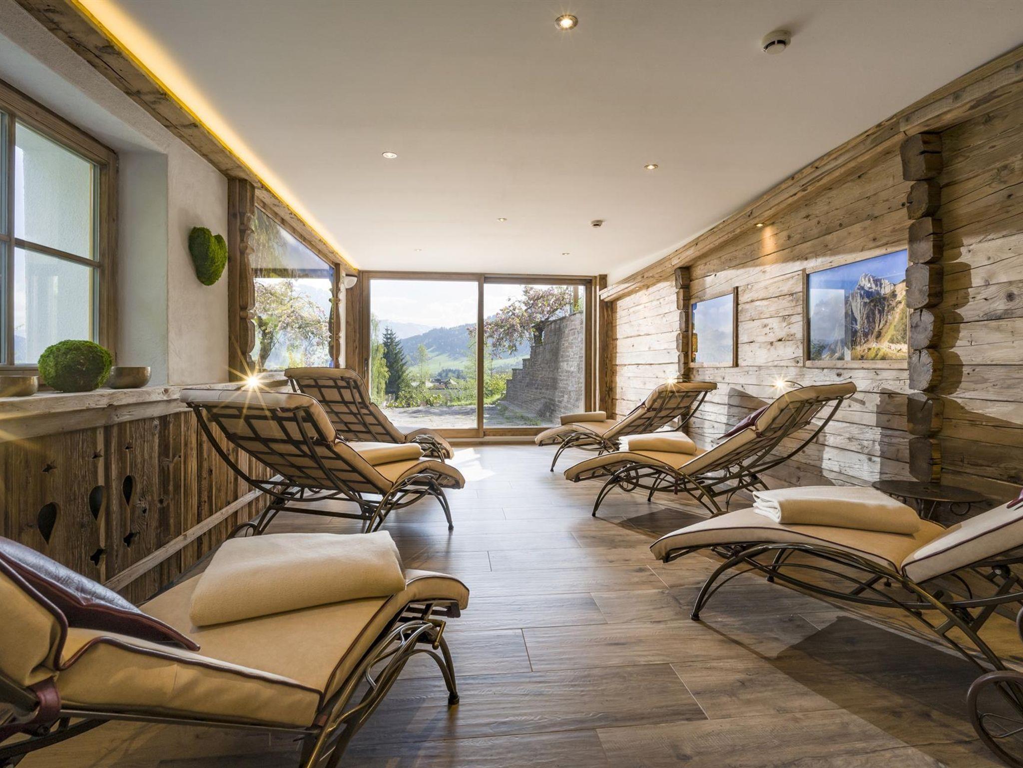 ? Wellnessbereich im Alm-Hütten-Stil: Infrarotkabine, Massagesessel, Fußmassage und Wellness-Terrasse