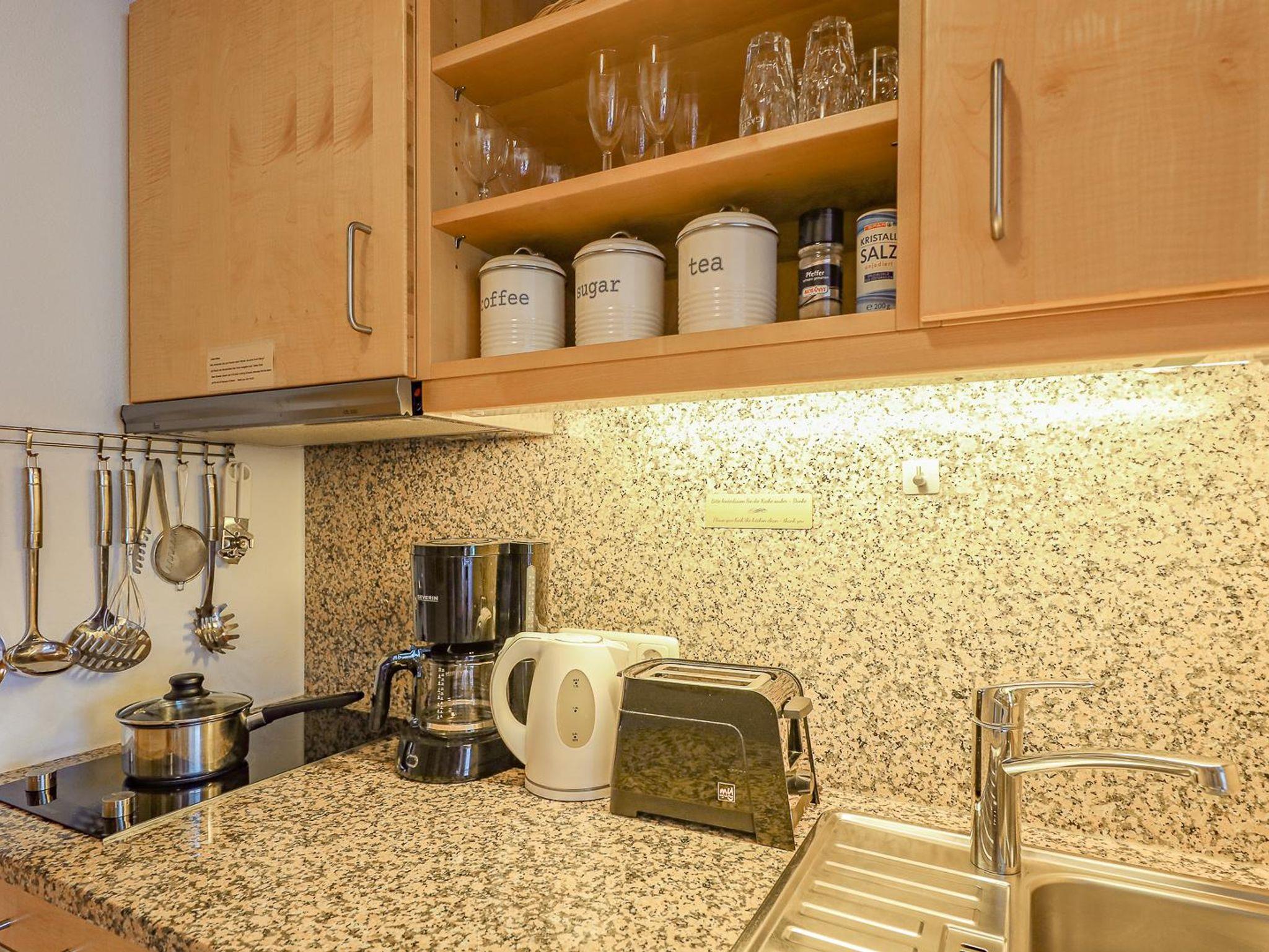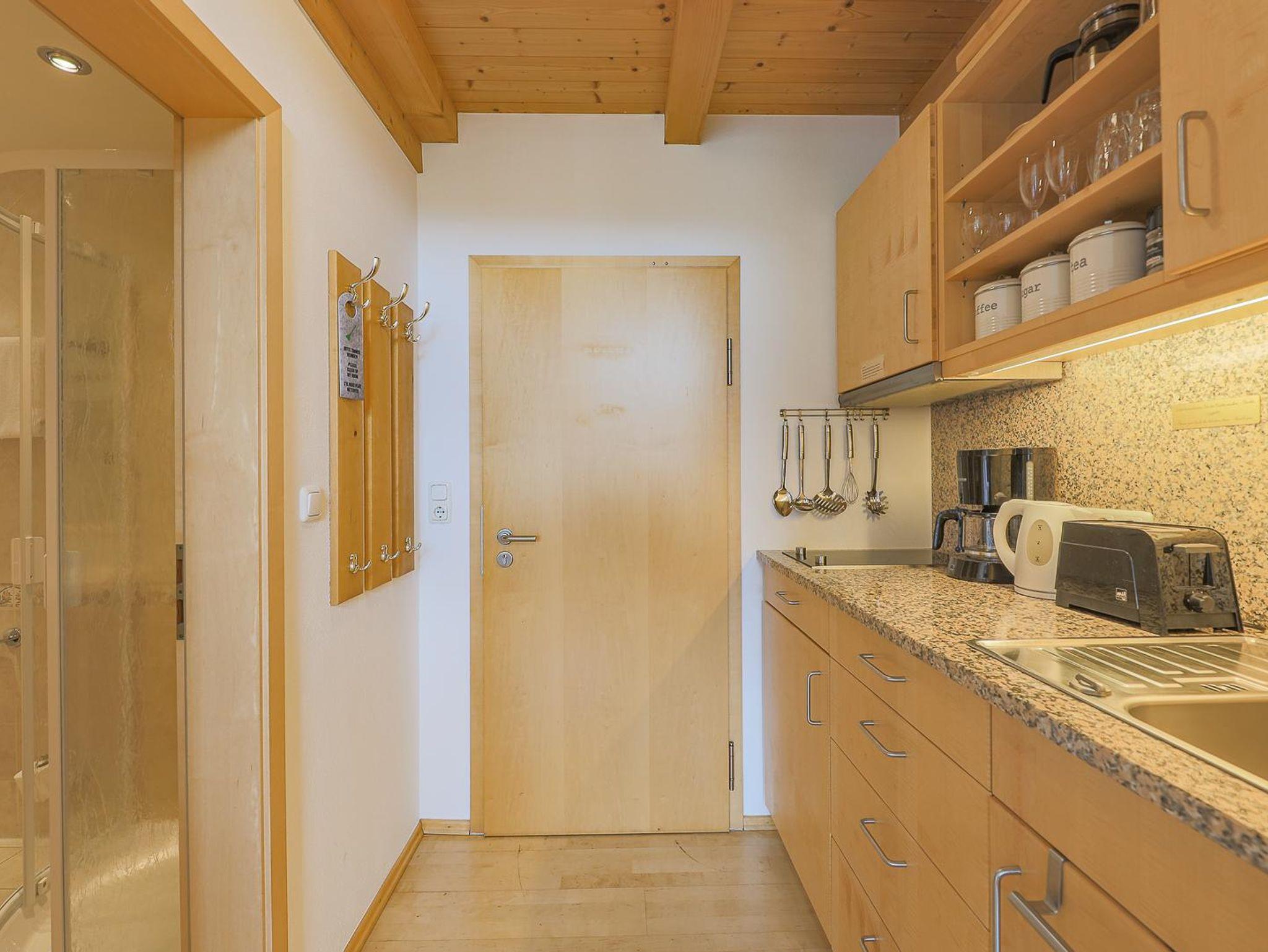 • Küchenzeile mit 2-Plattenherd, Kühlschrank, Spüle, Kaffeemaschine, ...