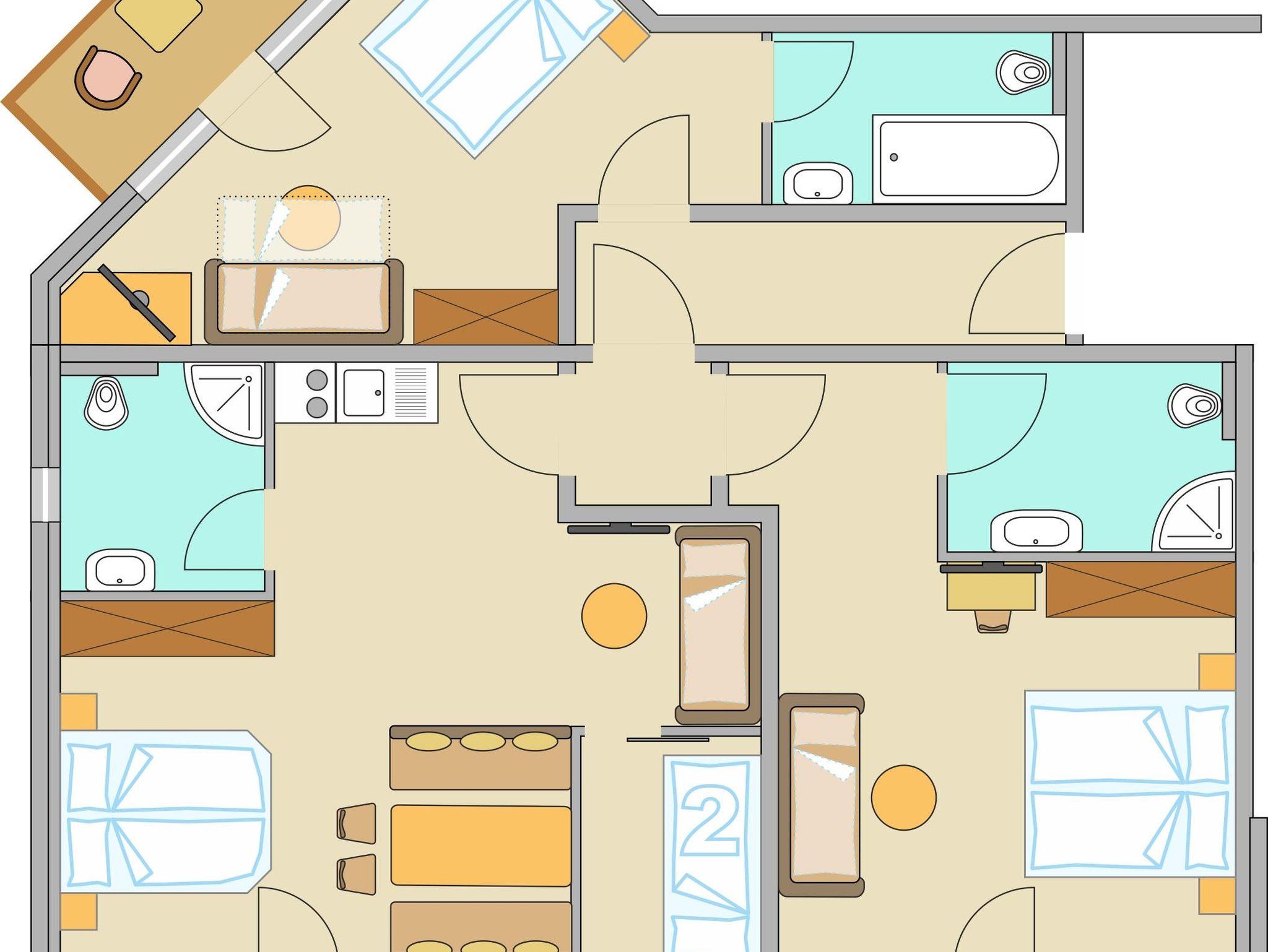 • 2 Bäder mit Du/WC, 1 Bad mit Badewanne/WC, Föhn
