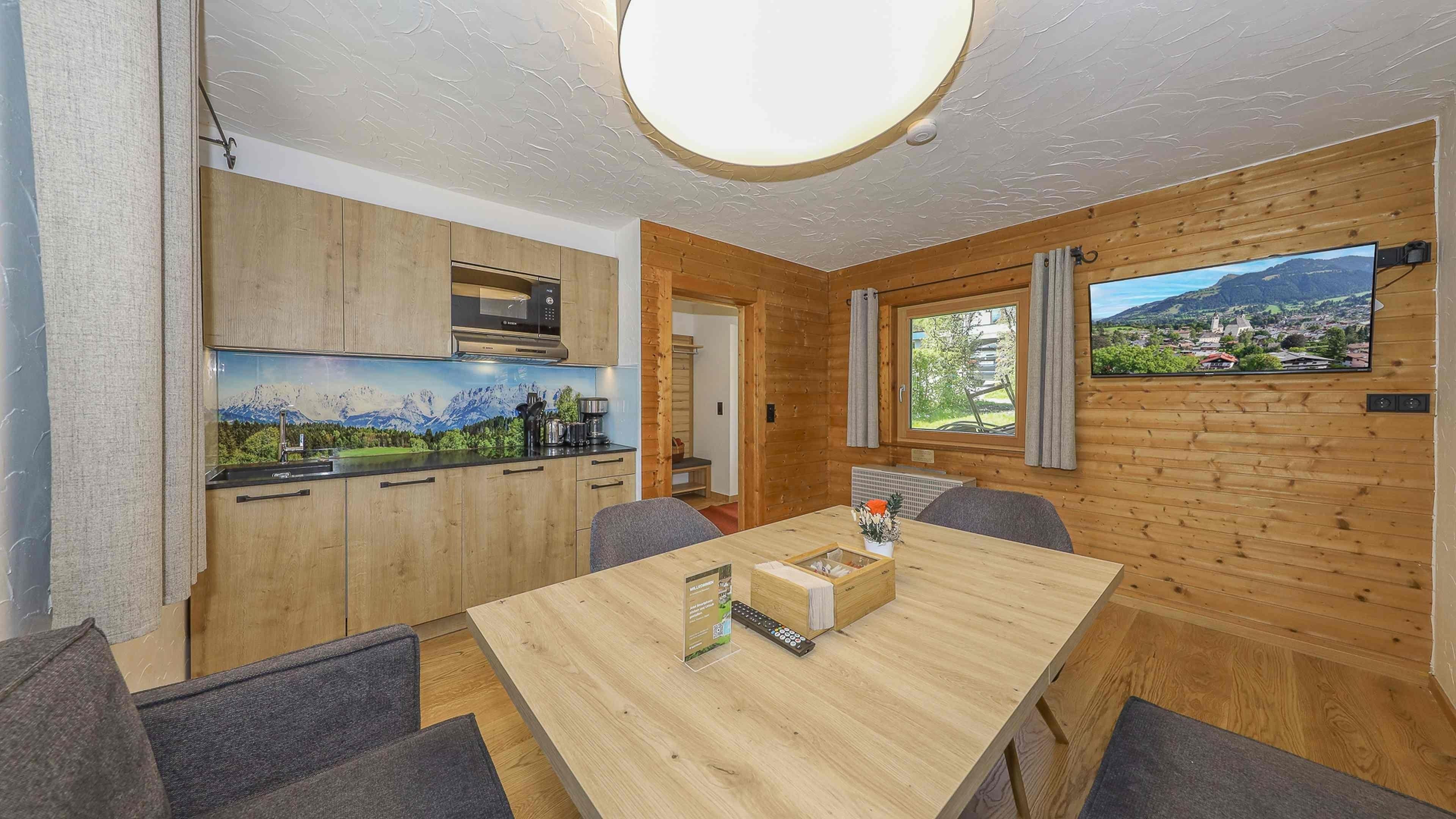 Dieses Apartment befindet sich entweder im Hotel mit fantastischer Aussicht auf die umliegende Landschaft oder in einem Chalet im Hotelgarten. Die Wohneinheit umfasst Holzmöbel, einen Flachbild-Smart-TV, eine komplett ausgestattete Küchenzeile, ein Bad sowie einen Sitzbereich. Die Bettenart in den Schlafzimmern unterscheidet sich je nach Apartment.