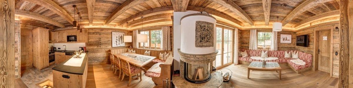 Das Herzstück jedes Hüttenteils ist die große Wohn-Essküche mit traditionellem Kachelofen – perfekt für gesellige Abende nach einem Skitag oder einer Wanderung.