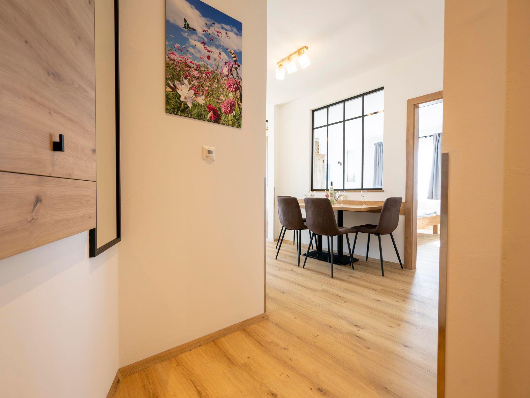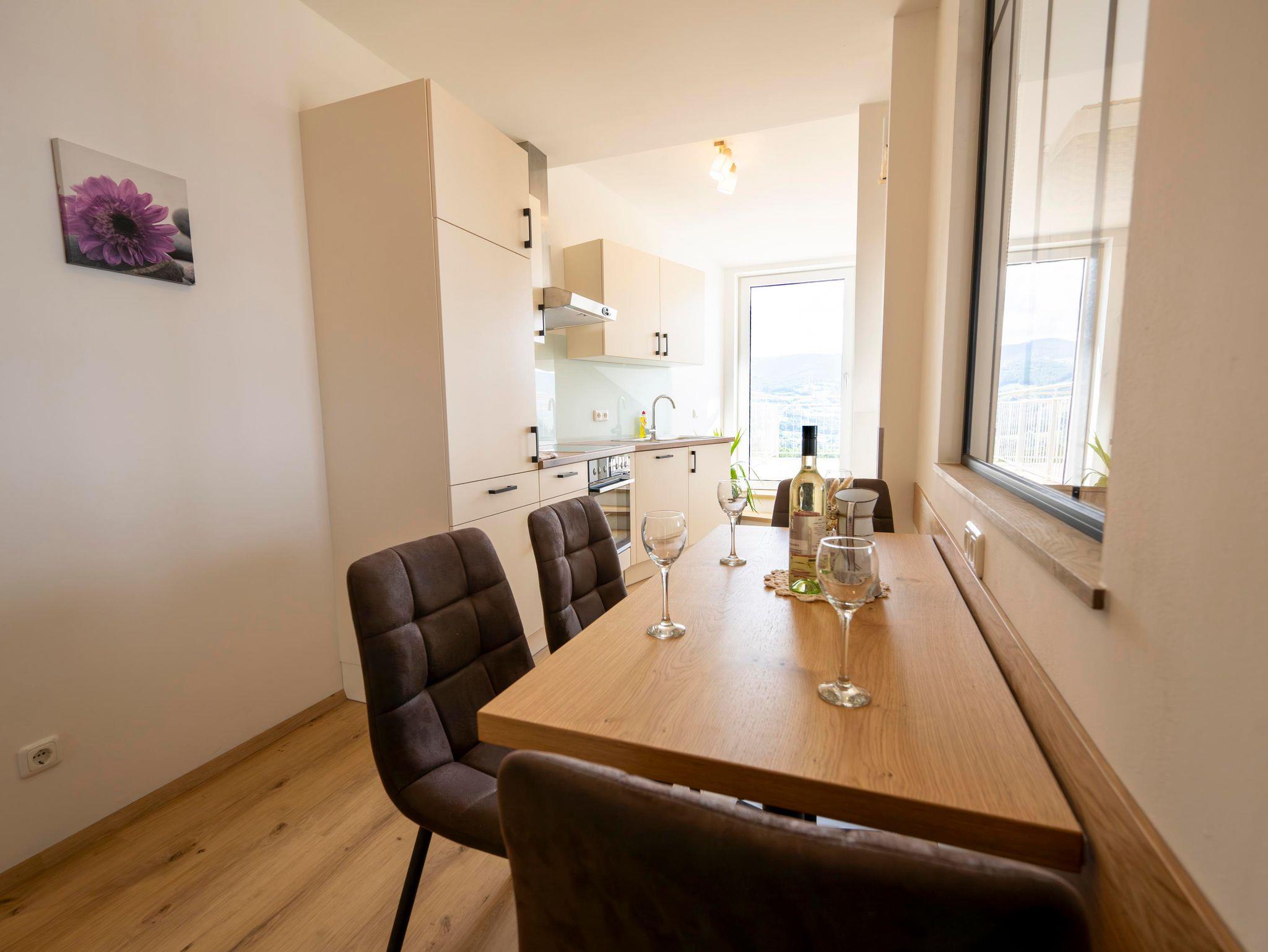 Die Ferienwohnung (ca.55m2) befindet sich im 1. Stock und verfügt über 2 Schlafzimmer, ein Badezimmer, Wc, Küche mit Essbereich und einen Balkon und Terrasse mit herrlichen Blick übers Pöllauer Tal.