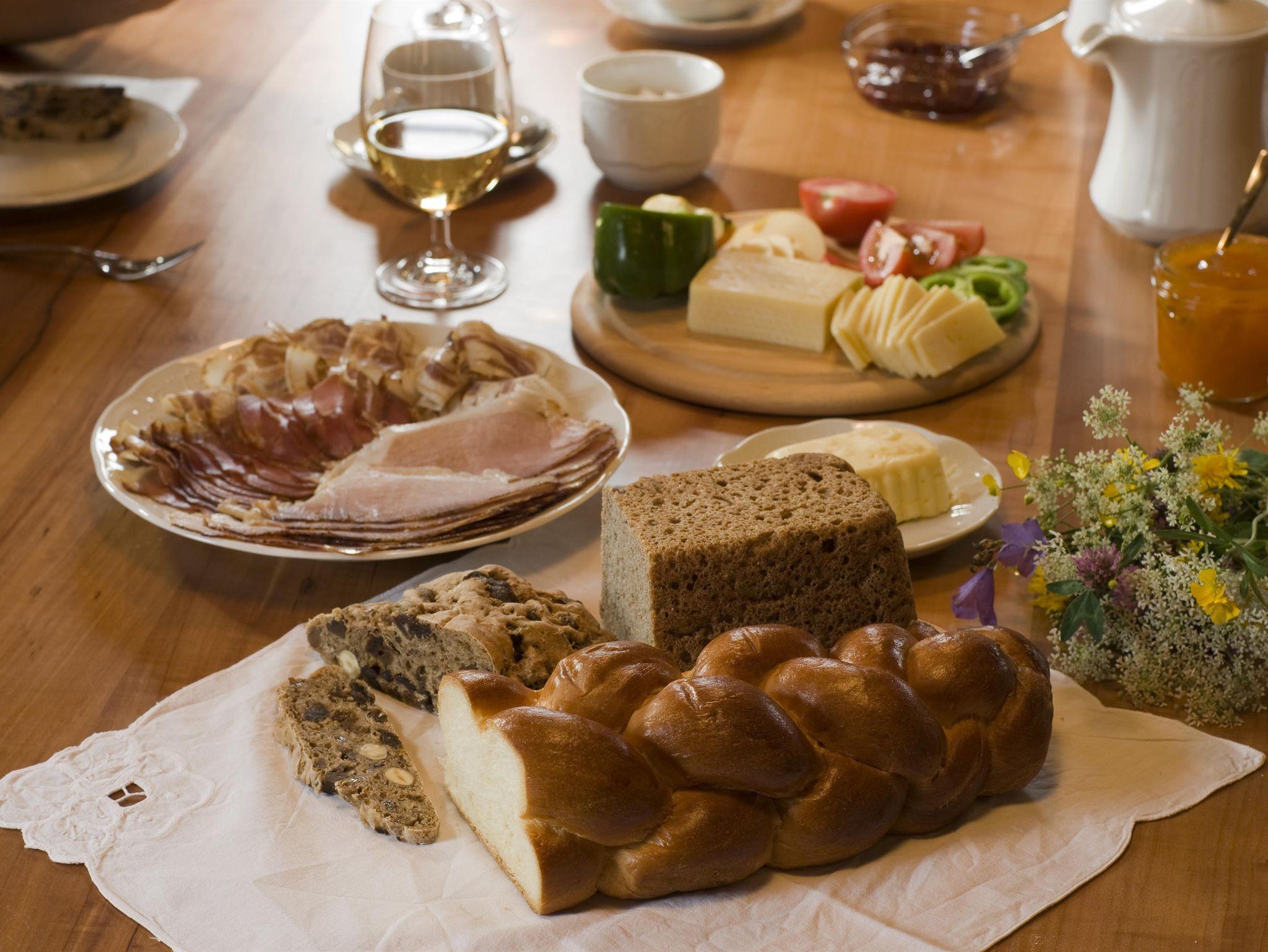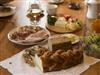Hirschbirnen - Jogltisch mit Eckbank und Kreuzstichvorhänge in Naturleinen.