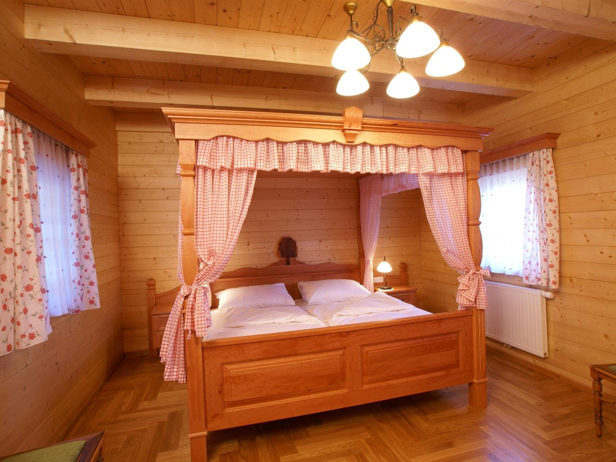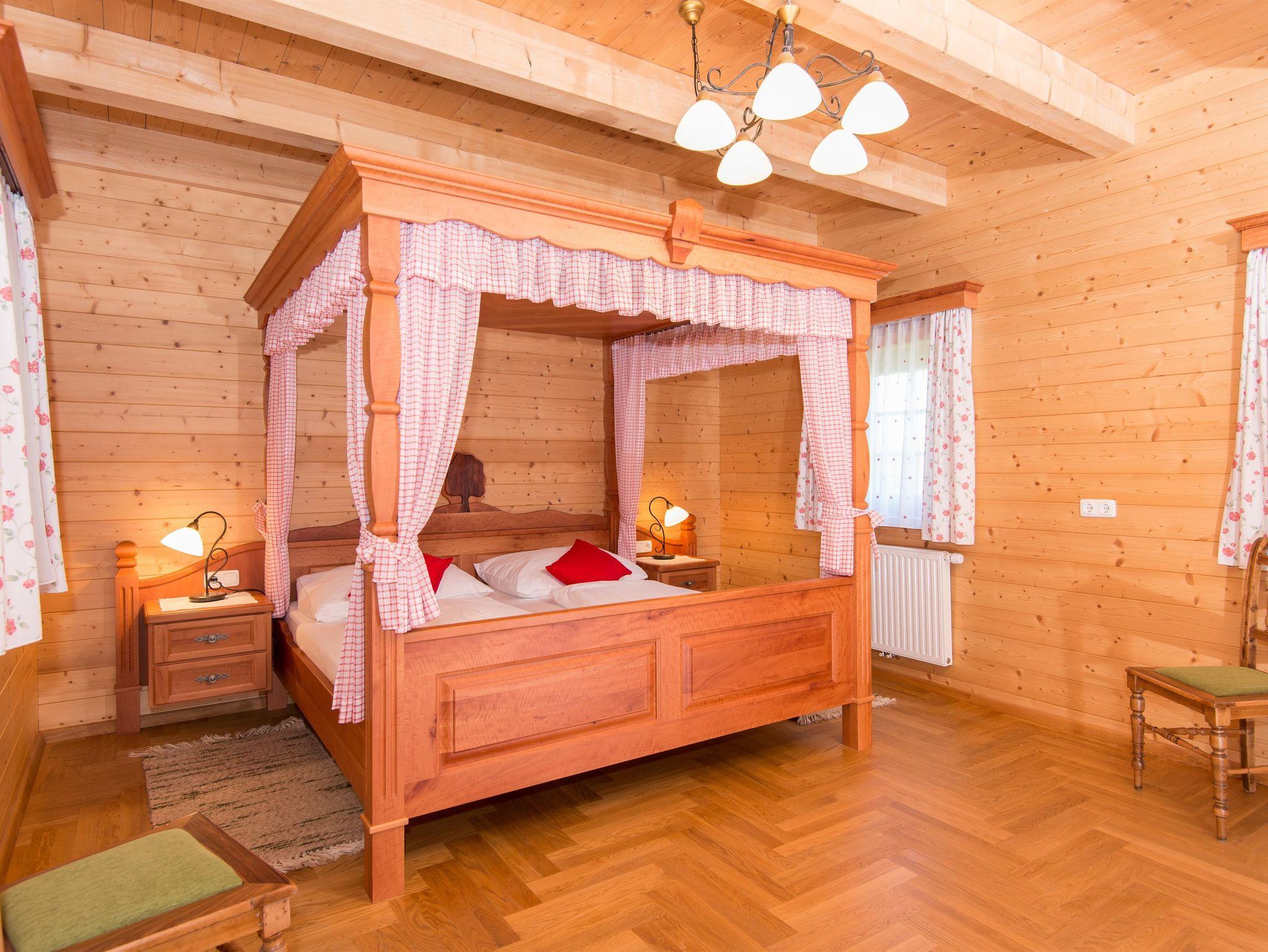 Großes Schlafzimmer mit Hirschbirnen-Himmelbett 200 x 200.
