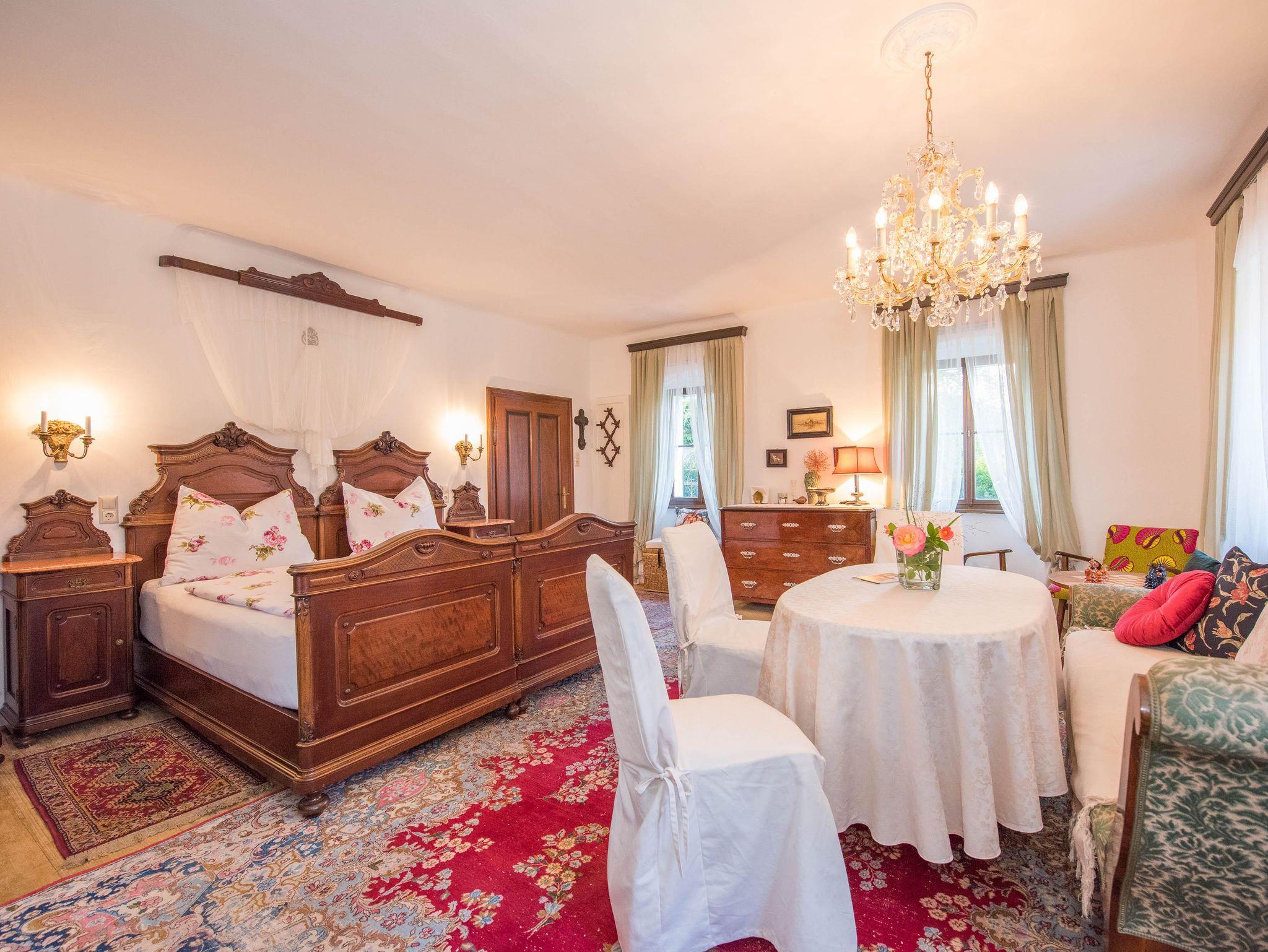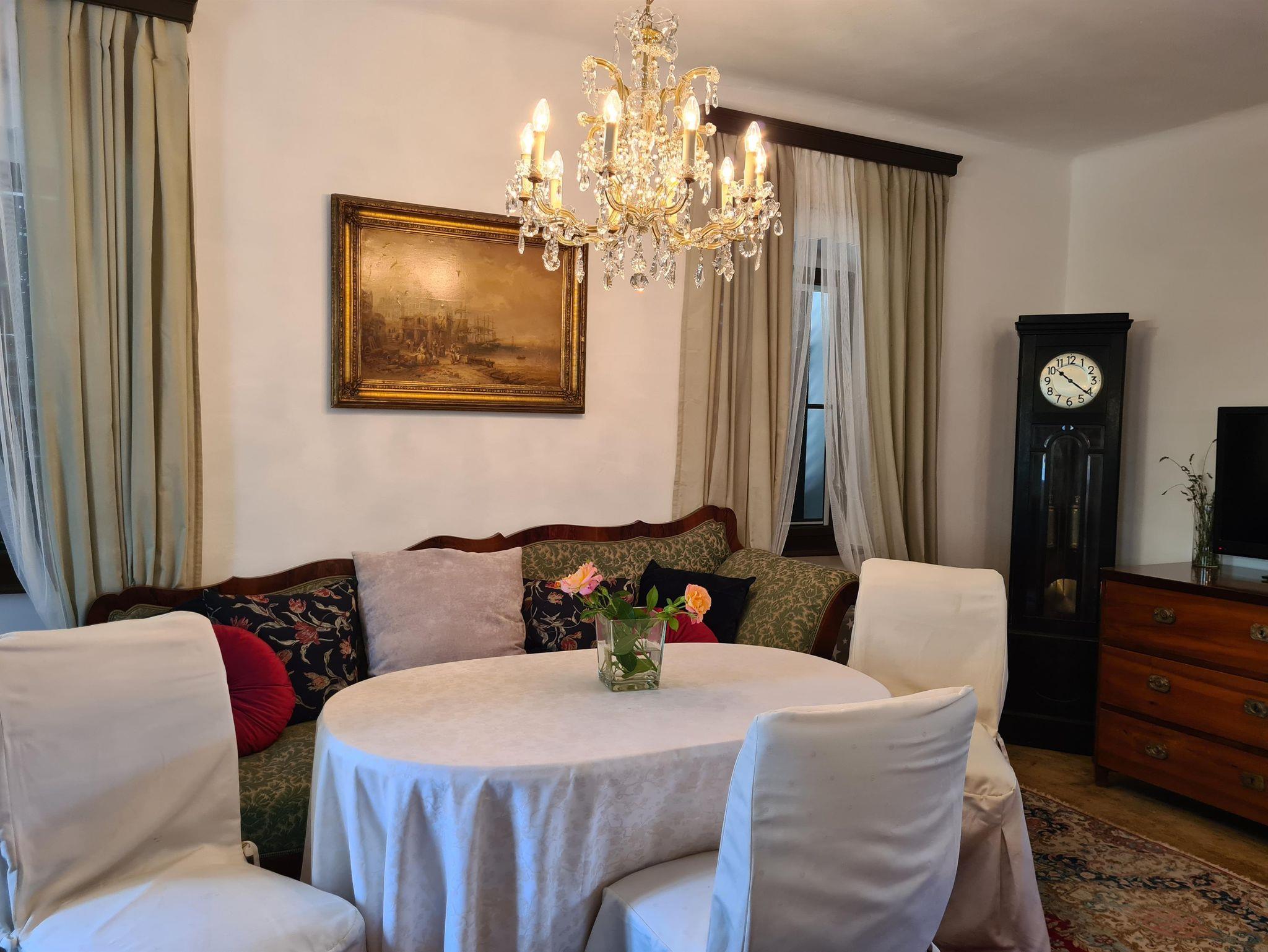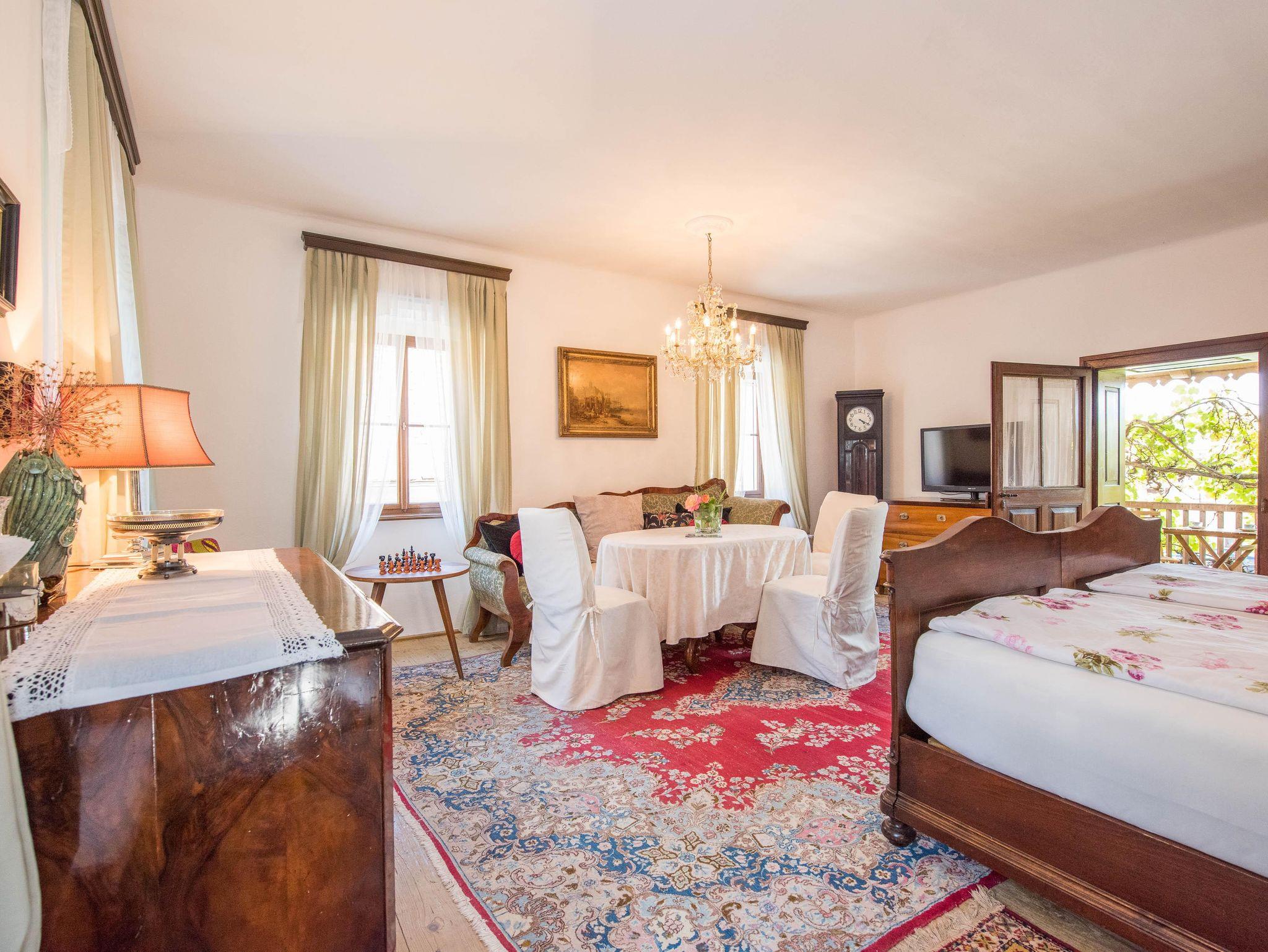 des Naturparks Pöllauer Tal. Ein altes Bürgerhaus, das liebevoll restauriert und stilvoll eingerichtet wurde. Direkt im beschaulichen Ort Pöllau, neben der romantischen alten Schlossmauer, unterm Lindenbaum steht es seit dem Jahre 1593. Hier im Garten auf der grünen Wiese genießen vor dem Haus die Morgensonne. Nur wenige Gehminuten entfernt befinden sich der Schlosspark, das Freibad sowie ein Fitnessparcours.