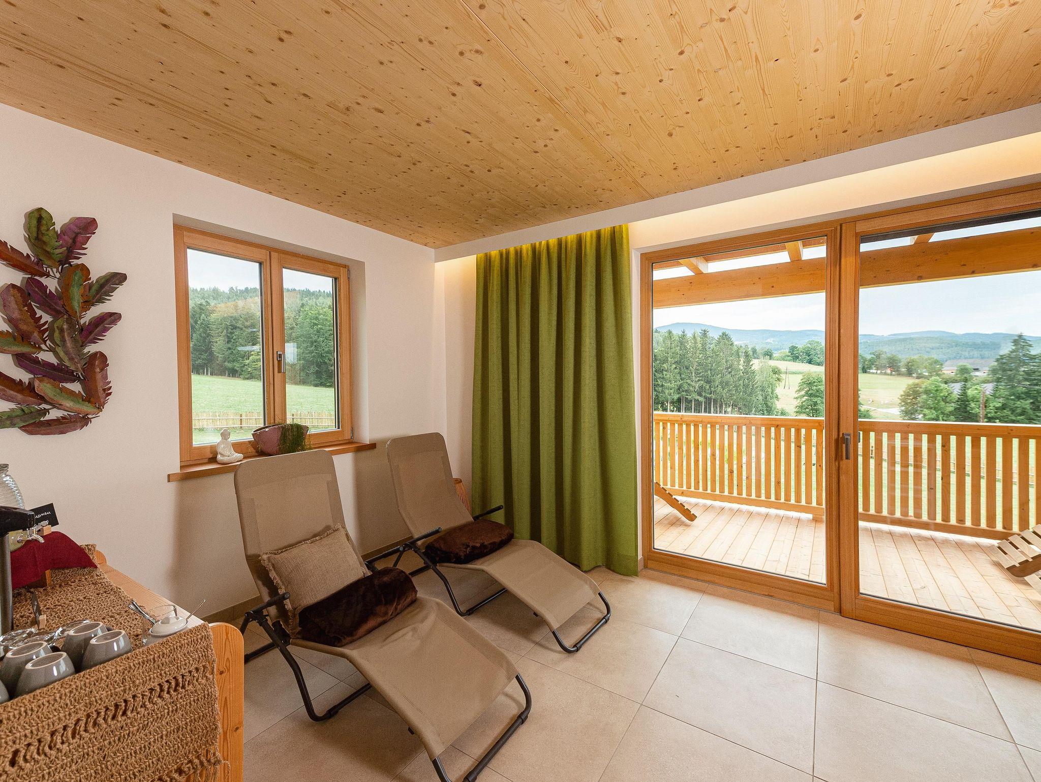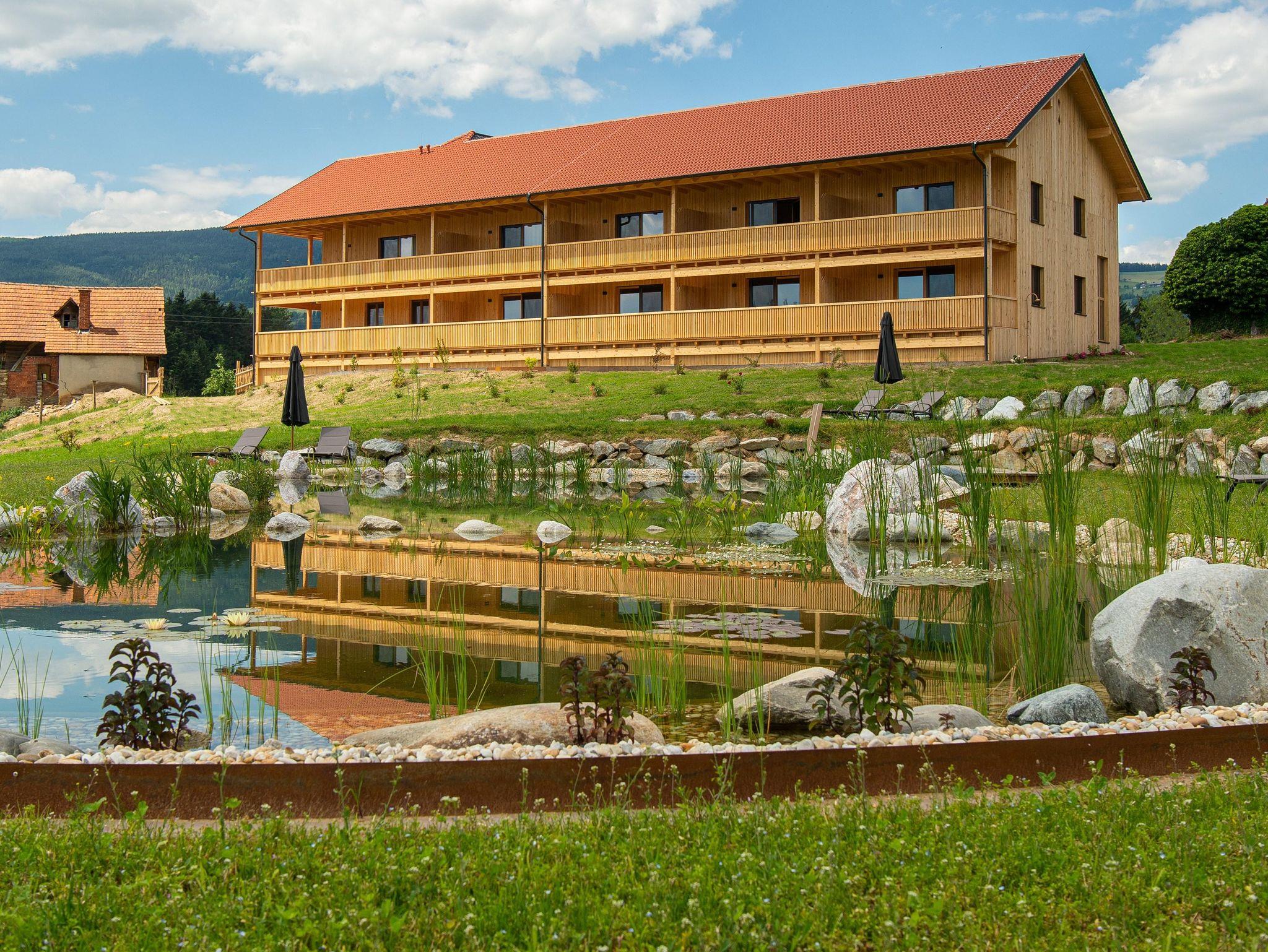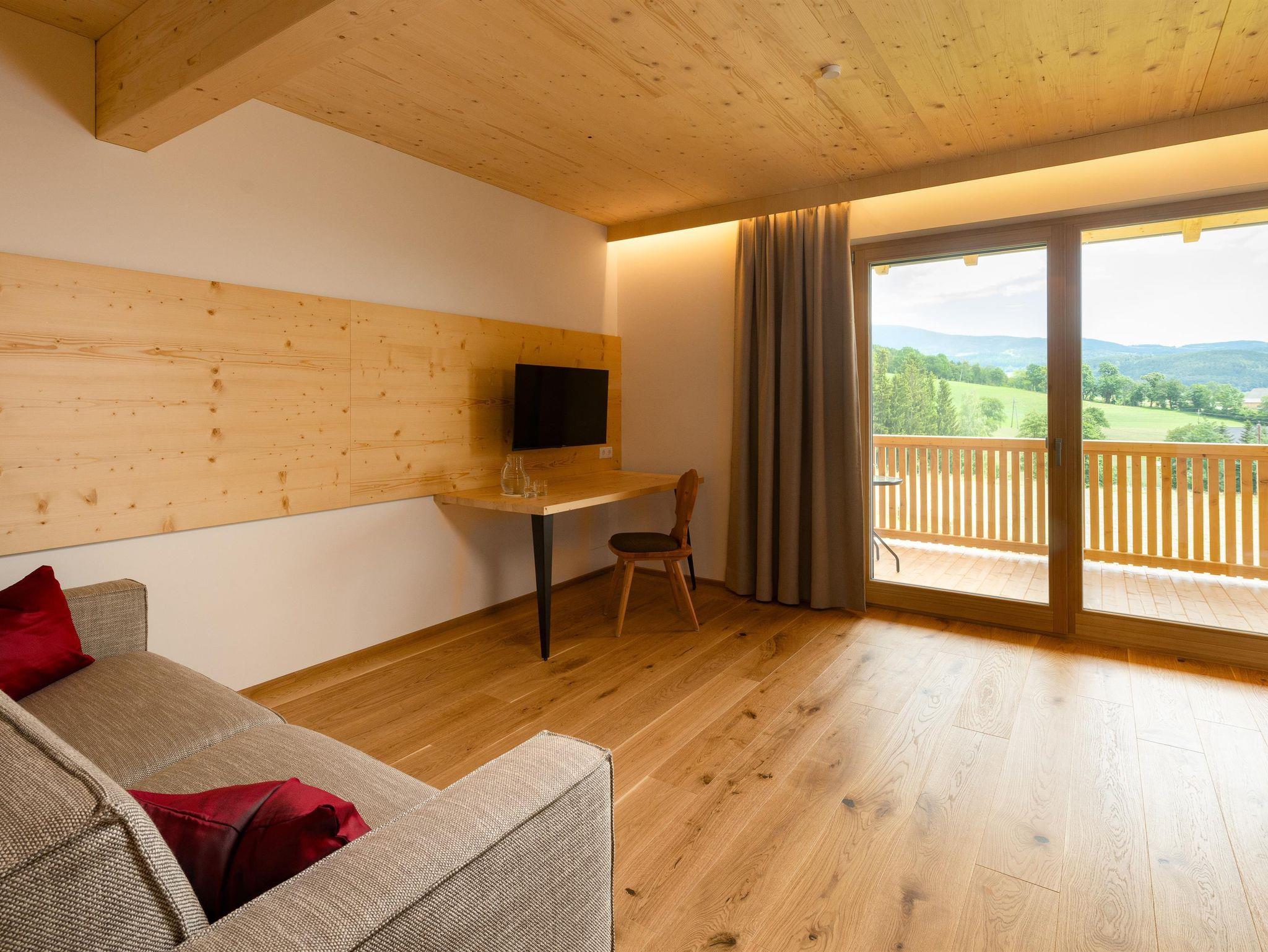Deluxe ist ein gemütliches Doppelzimmer in unserem neuen Holzhaus. Vom großzügigen Balkon haben Sie einen wundervollen Blick auf unseren Naturteich und die umliegende Berglandschaft. Vom Zimmer können Sie den Sonnenaufgang und sehr oft auch Wildwechsel beobachten.
