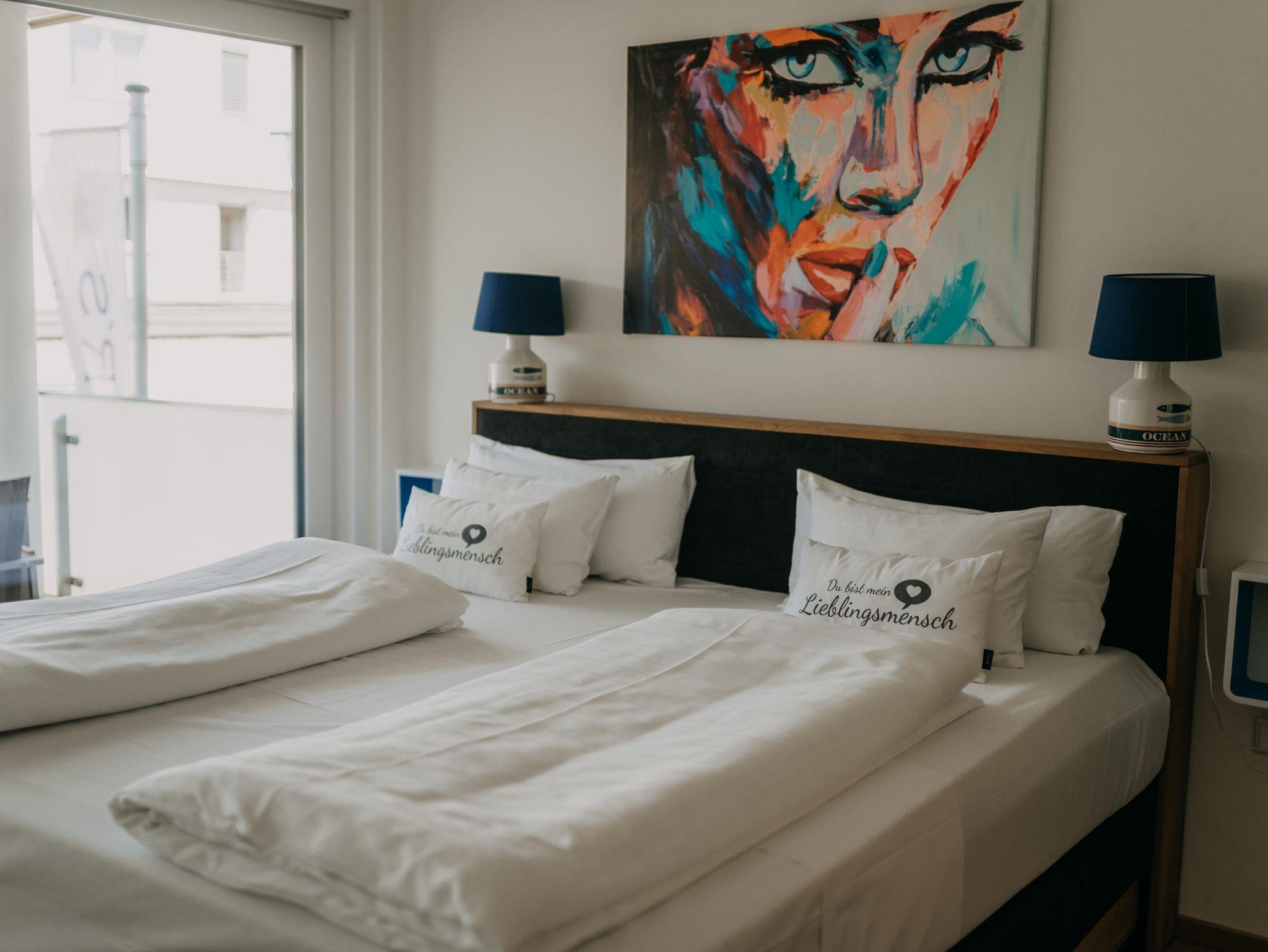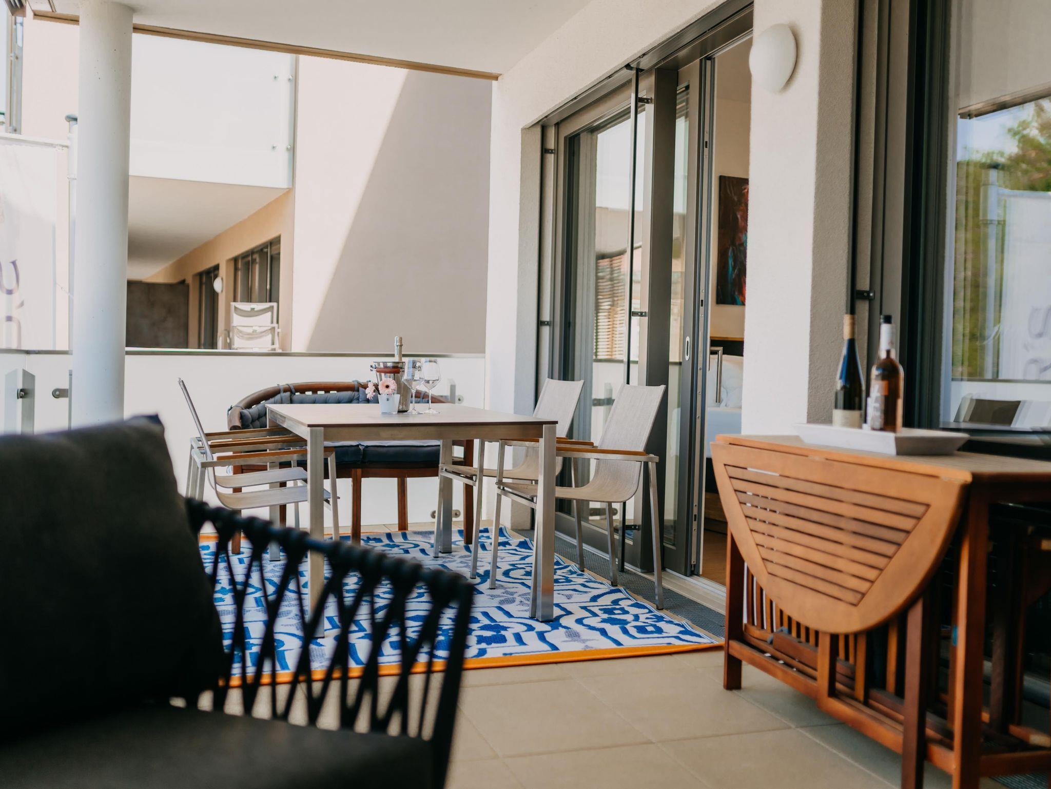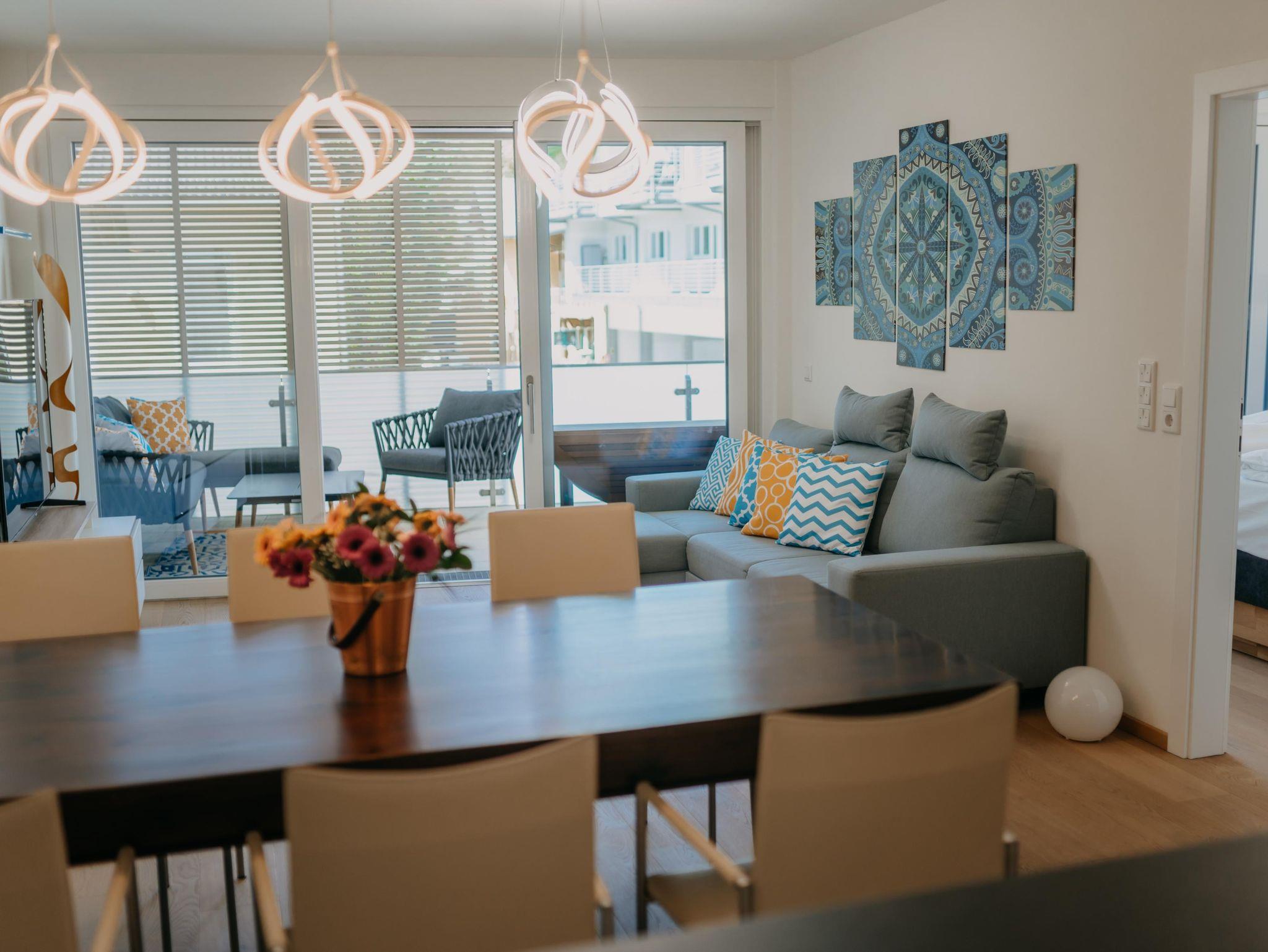 Das Apartment verfügt über 2 Schlafzimmer mit einem Doppelbett und einem extra großen Etagenbett (140x200). Im Wohnzimmer dürfen 2 weitere Personen auf der Schlafcouch schlafen. Die Wohnung ist für bis zu 6 Personen - und somit ideal für Familien geeignet. Des weiteren verfügt das Apartment über eine voll ausgestattete Küche mit Nespresso Kaffeemaschine, Backofen und Spülmaschine. Ein absolutes Highlight ist der überdachte Außenbereich der Wohnung. Der 24 qm große Balkon bietet genügend Platz für erholsame Abende im Freien.