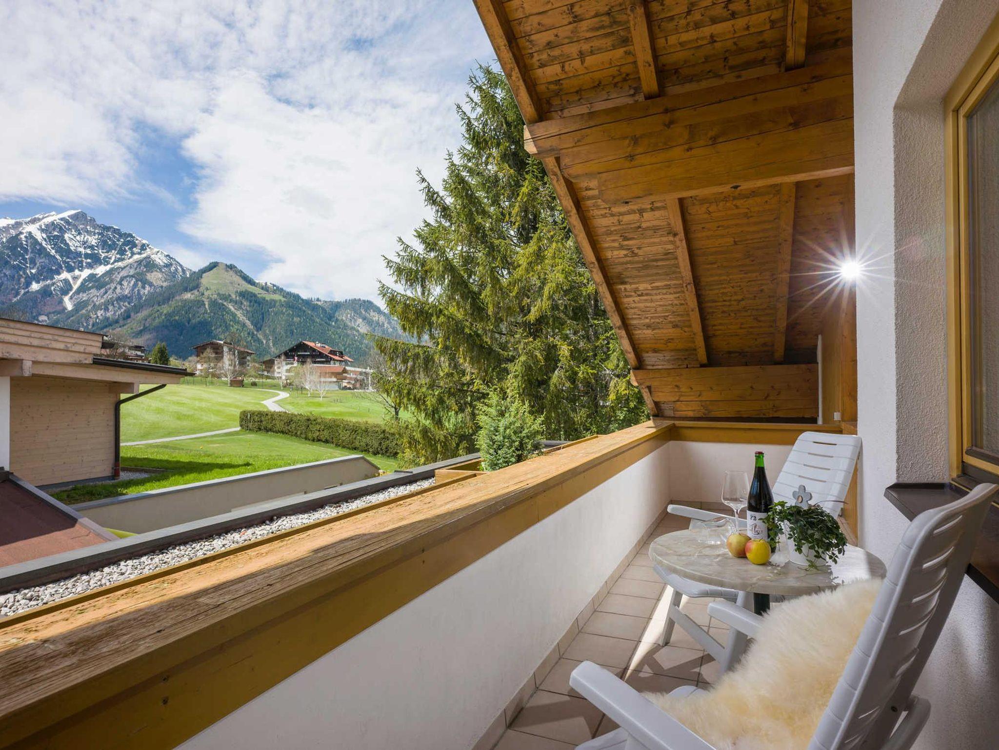 Urlaubstraum mit drei Schlafzimmern, zwei Badezimmern mit WC, Wohnbereich mit ausziehbarer Doppelcouch, Vorraum und Balkon. Von Ihrer Wohnung genießen Sie die Aussicht auf den Golfplatz und das imposante Karwendelgebirge.