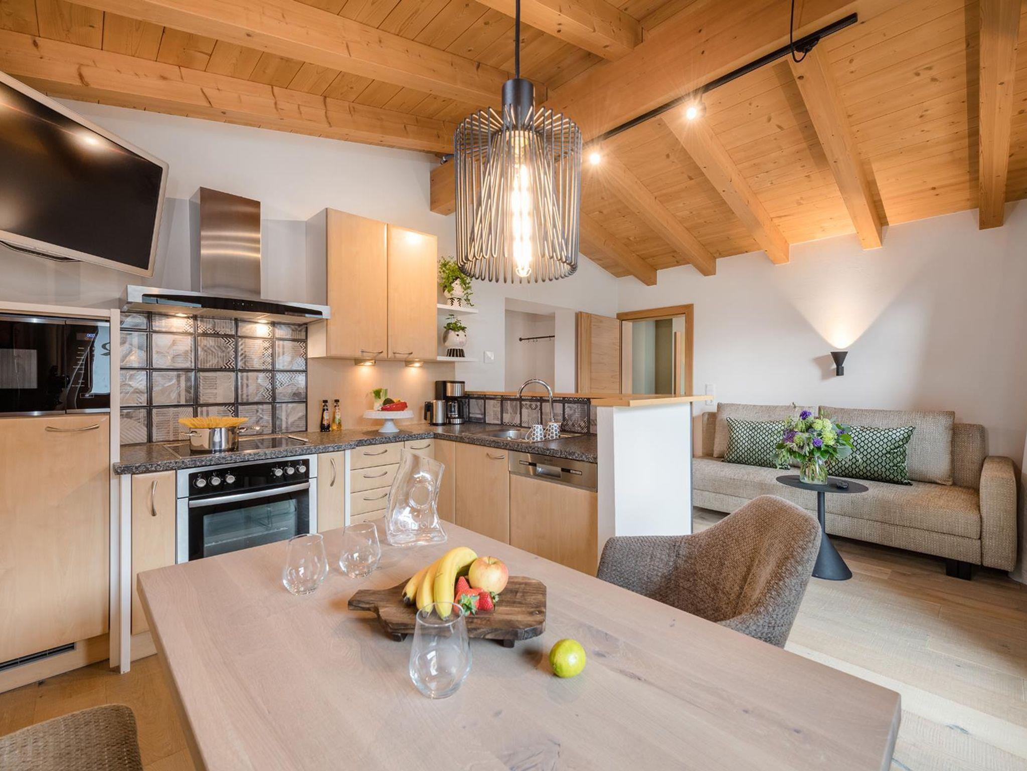 • gemütliche Wohnküche mit Wohn- und Essecke, komplett ausgestattete Küche mit 4-Platten-Cerankochfeld, Mikrowelle, Backofen, Kühlschrank mit Gefrierfach, Filterkaffeemaschine (auf Wunsch Nespresso verfügbar), Toaster, Wasserkocher, Geschirr, Besteck und Kochutensilien