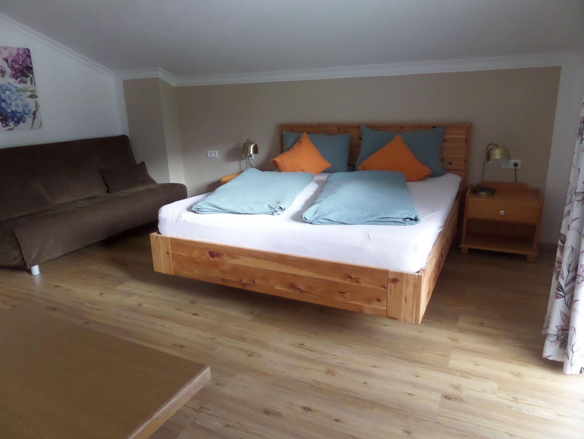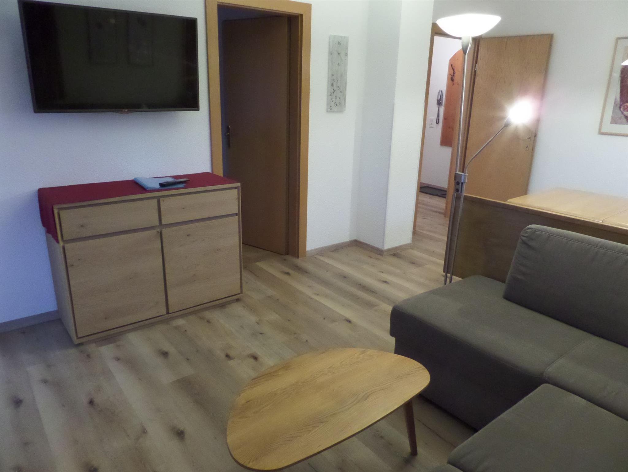 Die Wohnun bestehen aus einem Vorraum mit Kochnische, einem Wohnraum mit Esstisch und zwei Schlafzimmer. Das größere Schlafzimmer erreichen Sie über eine Inntentreppe.