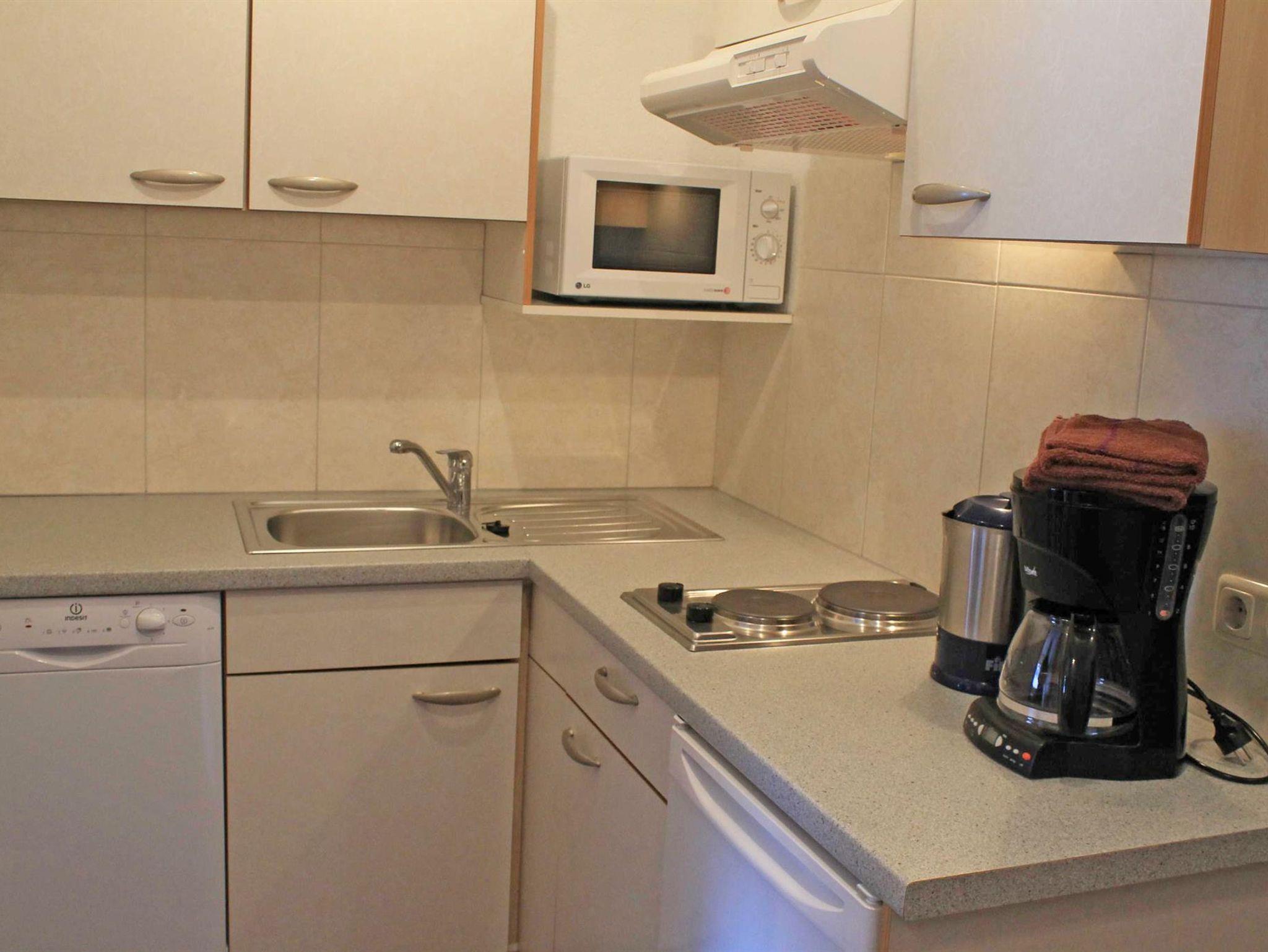 Die Küchenzeile ist mit Induktionkochfeld, Mikrowelle, Geschirrspüler, Filterkaffeemaschine, Wasserkocher, Brottoaster und Geschirr ausgestattet. Sat-TV, Radio mit CD und gratis Wifi sind vorhanden. Bettwäsche und Handtücher sowie Geschirrtücher sind vorhanden.