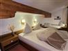 • Großer Schlafbereich mit Doppelbett und Einzelbett, charmant abgetrennt durch eine stilvolle Holzwandtäfelung.
