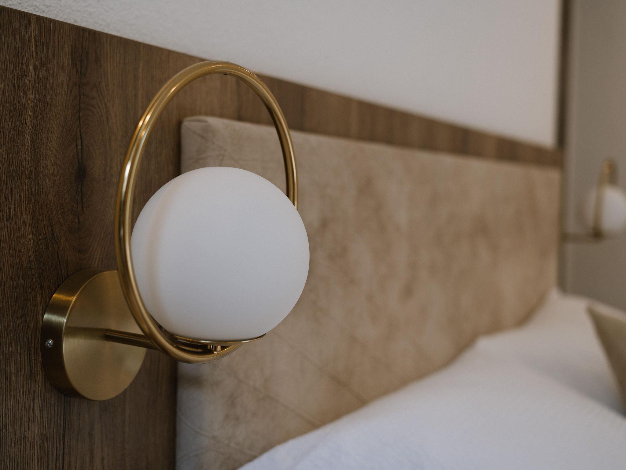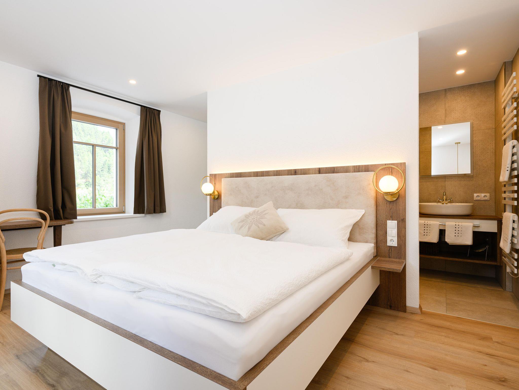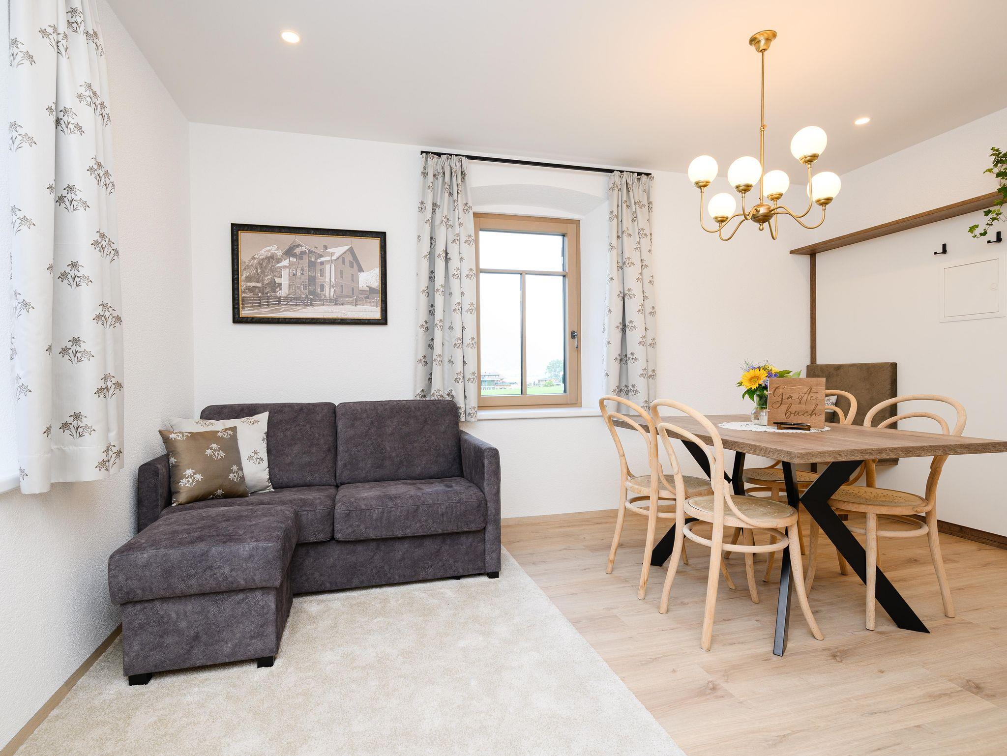 Ferienwohnung 1926 Die Ferienwohnung 1926 liegt ebenfalls im Erdgeschoß und hat 45 Quadratmeter. Sie bietet einen Wohnsalon mit Bettsofa und einen Essbereich mit offener Küche im klassischen Villen-Charakter. Im gemütlichen Schlafzimmer erwacht man mit dem traumhaften Blick auf die von den sonnengeküssten Berggipfeln. Das Badezimmer erweist einen besonderen Flair mit einer begehbaren Dusche, einem Waschtisch sowie einer separaten Toilette.