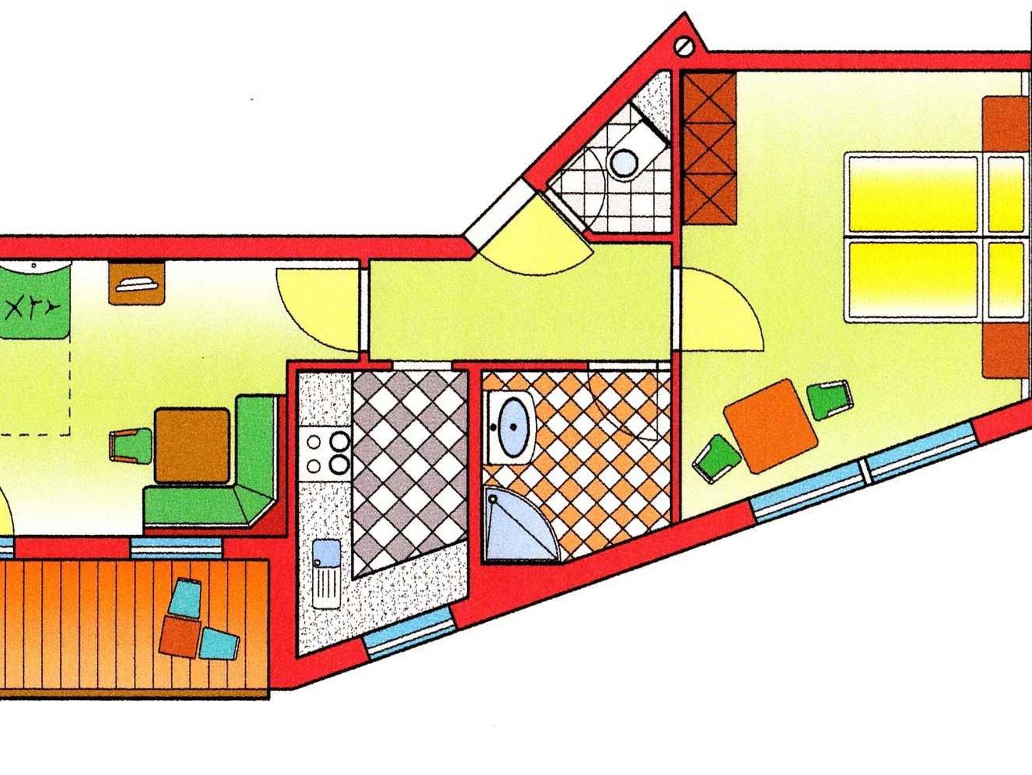 Appartement mit Balkon, Vorraum, Schlafzimmer mit kleiner Sitzecke, Wohnraum mit Esstisch und Schlafcouch., komplett ausgestattete Küche, Badezimmer mit Dusche und separatem WC.