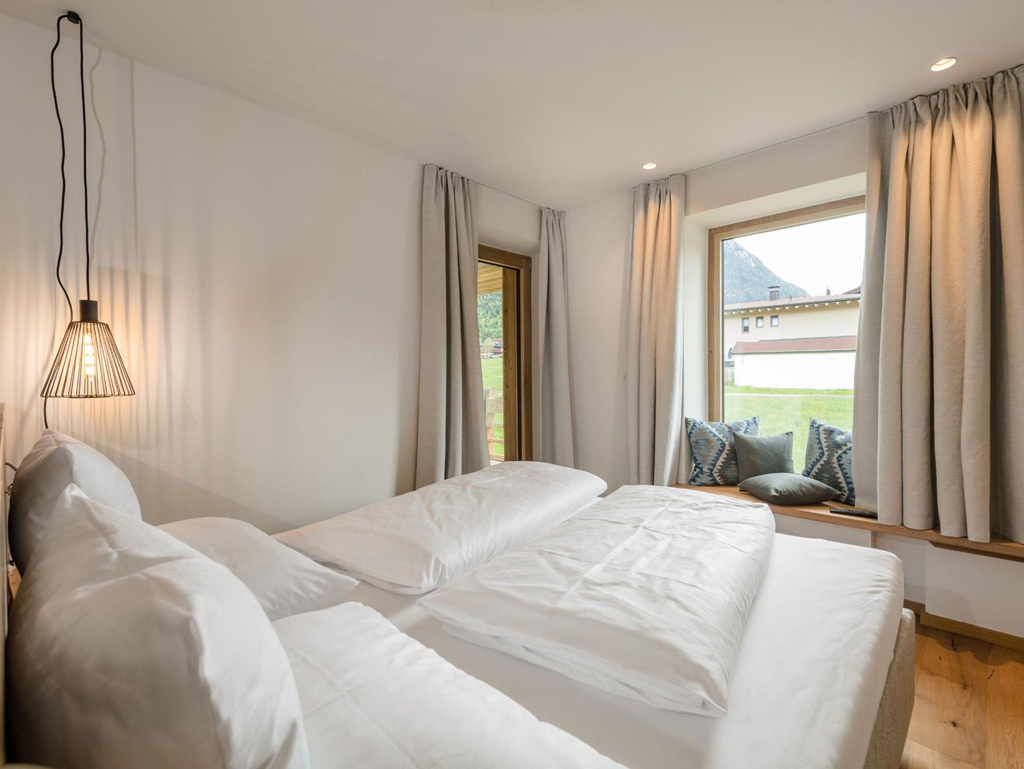 1 Schlafzimmer mit Boxspringbett, Eichenholzboden, offenem Kleiderschrank und Verdunkelungsvorhängen