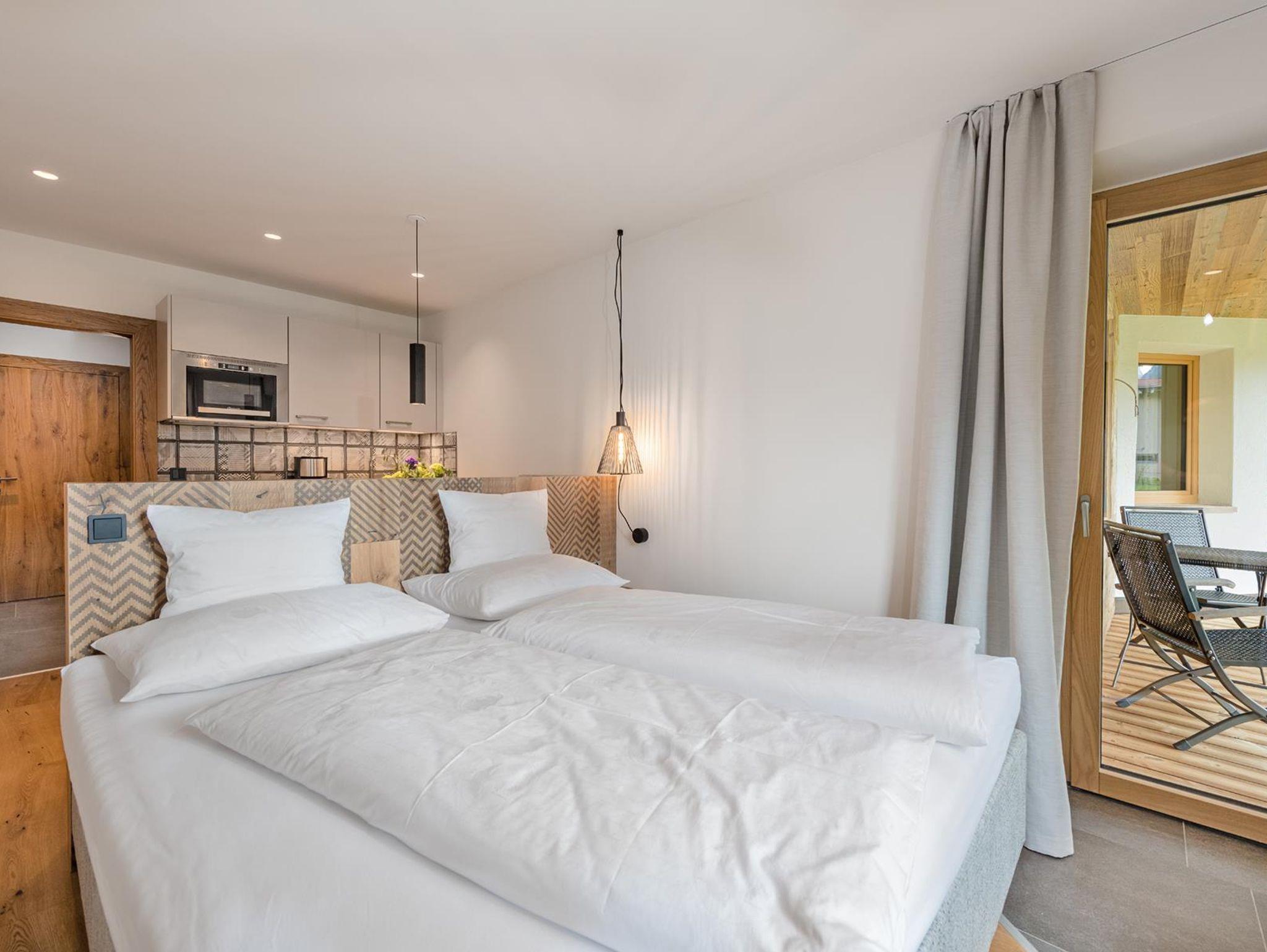 • komplett ausgestattete Miniküche mit Micro-Grillkombination, Kühlschrank mit Gefrierfach, 2-Platten-Cerankochfeld, Filterkaffeemaschine (auf Wunsch Nespresso verfügbar), Toaster, Wasserkocher, Geschirr, Besteck und Kochutensilien