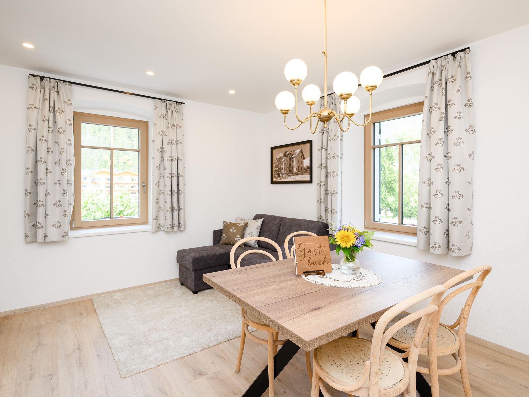 Ferienwohnung 1958 Die Ferienwohnung 1958 liegt auf erster Etage und erstreckt sich über 45 Quadratmeter mit Eingangsbereich. Sie bietet einen wunderschönen Ausblick über die Wagnerwiese zum türkisblau schimmernden Achensee. Die Ferienwohnung verfügt über ein idyllisches Schlafzimmer mit einem Eckbalkon nach Westen und großartiger Aussicht auf die rundum liegende Bergwelt. Das wunderschön proportionierte Badezimmer umfasst eine geräumige Dusche und einen Waschtisch. Die Toilette befindet sich separat. Der großzügige Wohnsalon umfasst eine elegante Villenküche mit gemütlichen Essbereich, sowie ein bequemes Sofabett zum kuscheln.