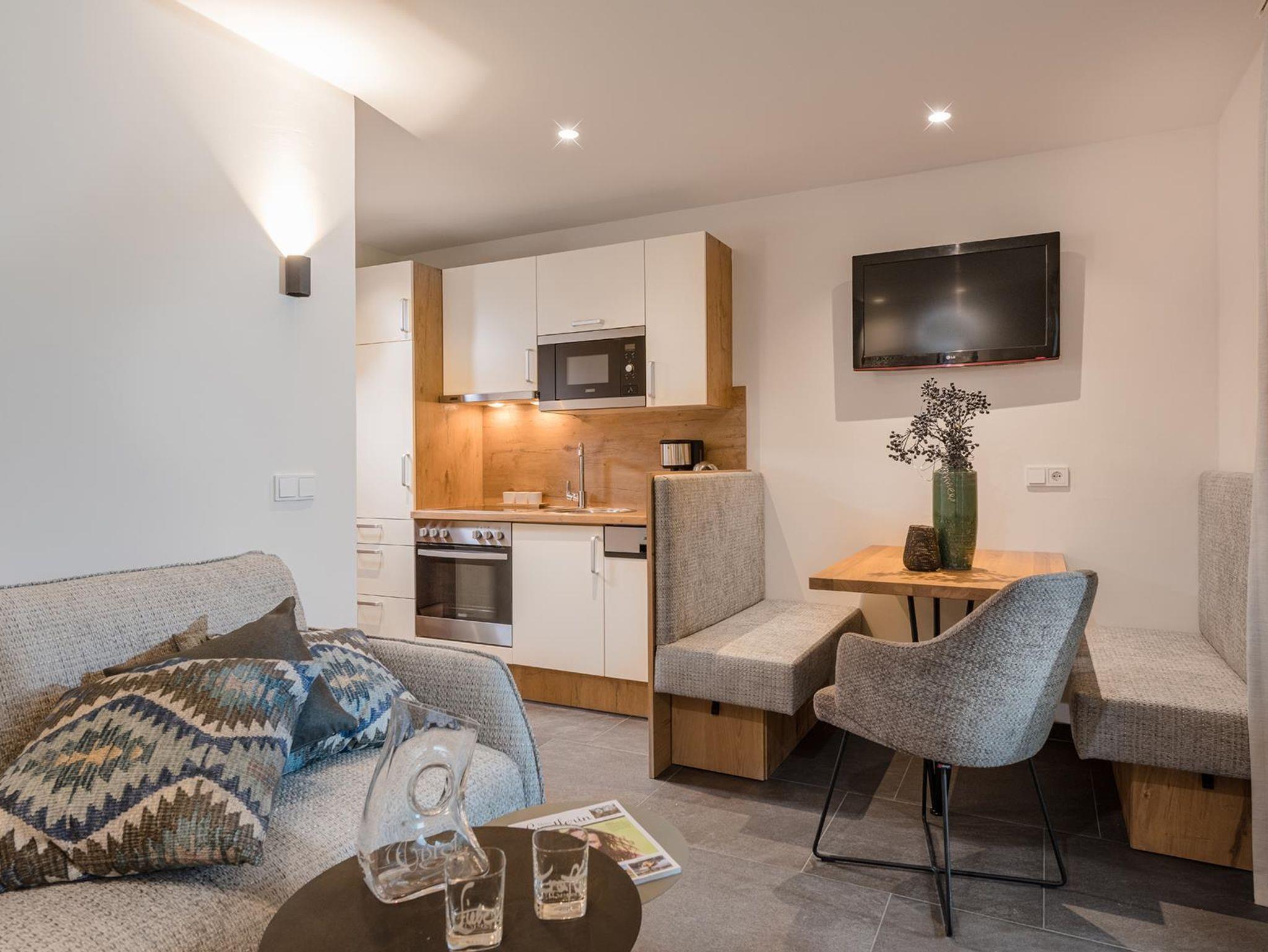 • gemütliche Wohnküche mit Wohn- und Essecke, komplett ausgestattete Küche mit 4-Platten-Cerankochfeld, Mikrowelle, Backofen, Kühlschrank mit Gefrierfach, Filterkaffeemaschine (auf Wunsch Nespresso verfügbar), Toaster, Wasserkocher, Geschirr, Besteck und Kochutensilien