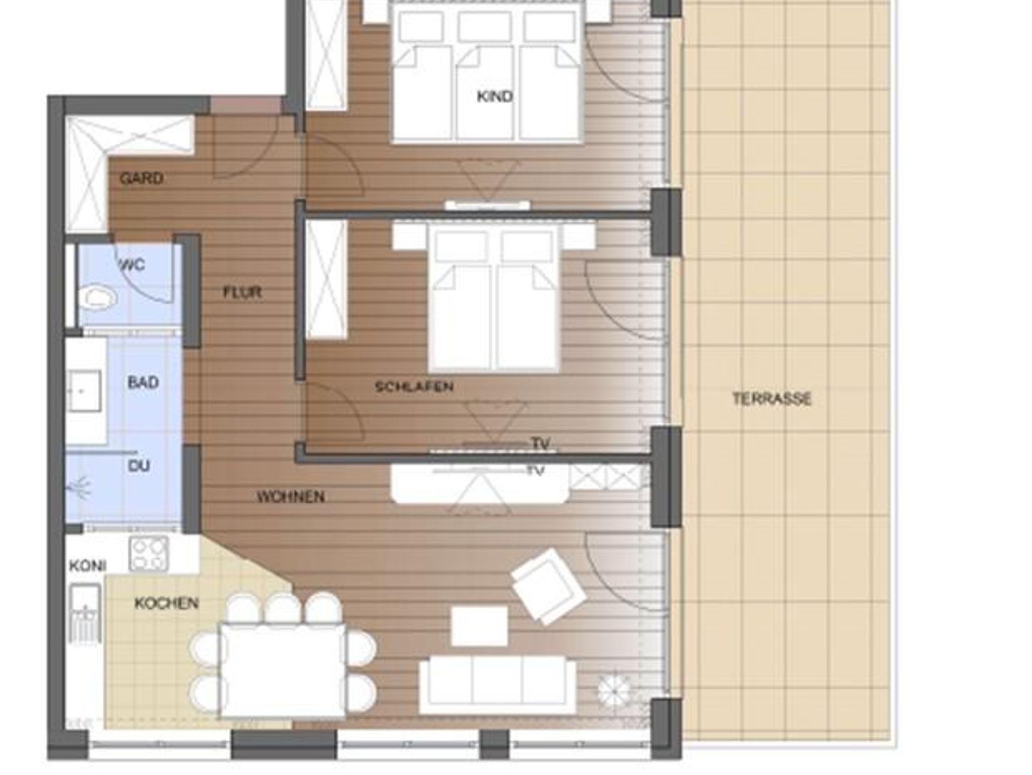 Zwei Schlafzimmer (1 DZ, 1 King Size Familien Bett Zimmer) mit Wohlfühlbetten sowie eine bequeme Doppel-Wohn-Schlafcouch bieten Platz für bis zu sieben Personen. Der gemütliche Wohnraum und die Terrasse laden ein zum Genießen und verweilen.