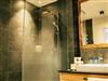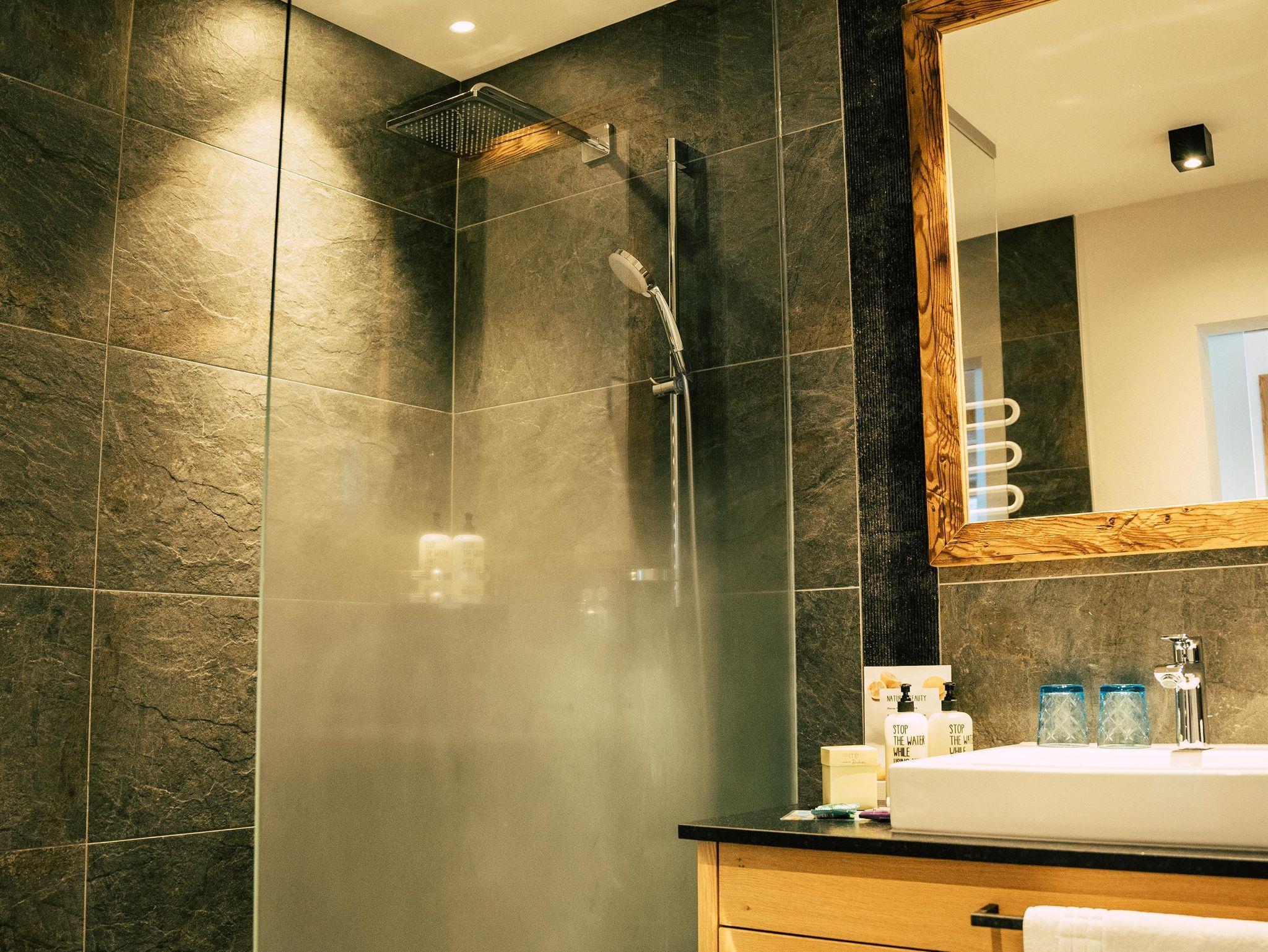 Bad mit begehbarer Dusche, Handtuchtrockner, Kosmetikspiegel, Fön, WC, flauschige