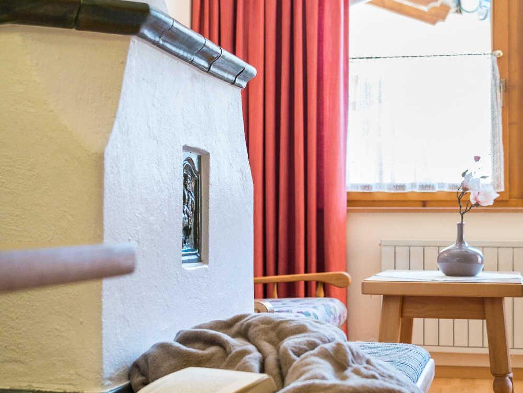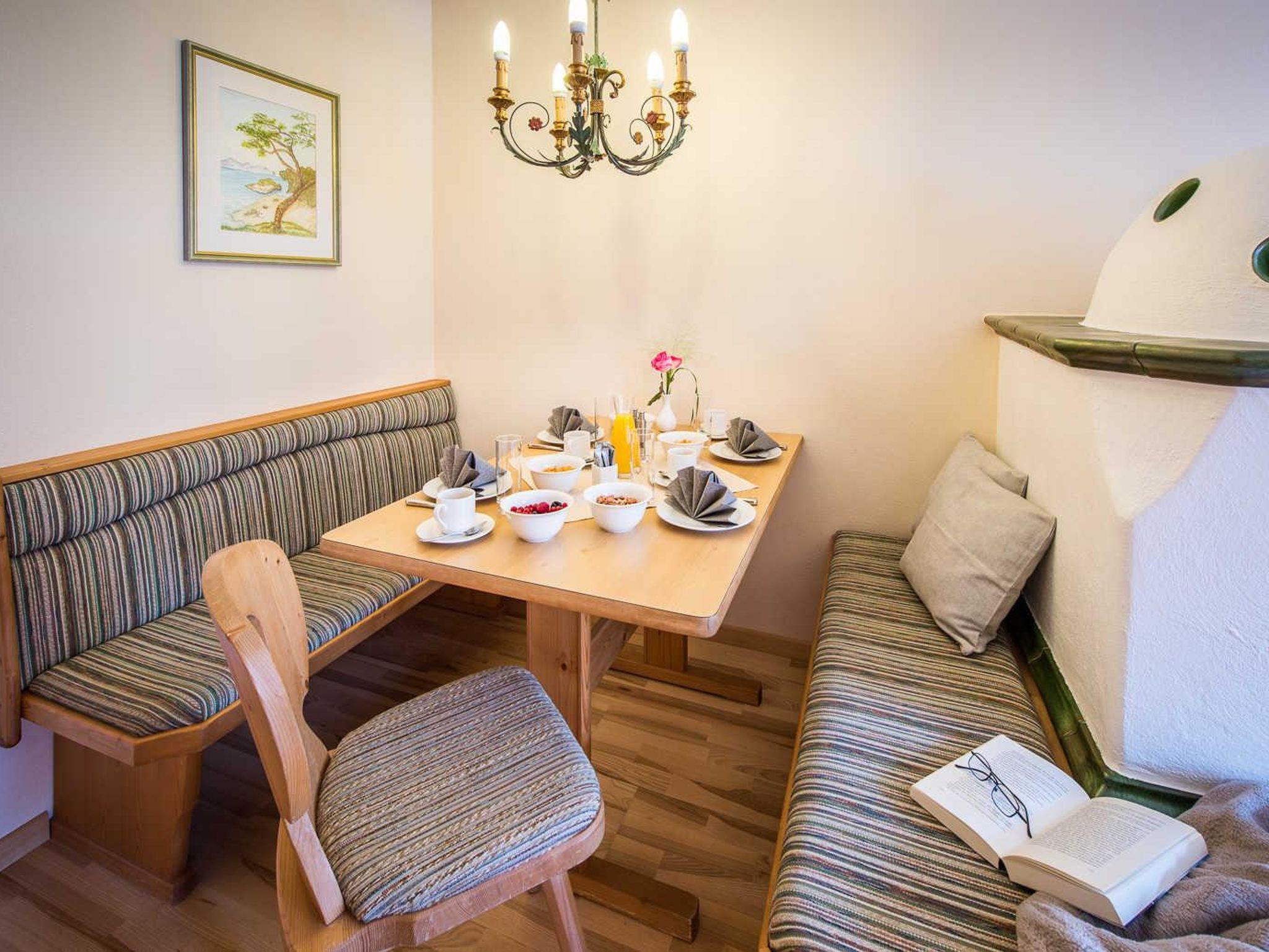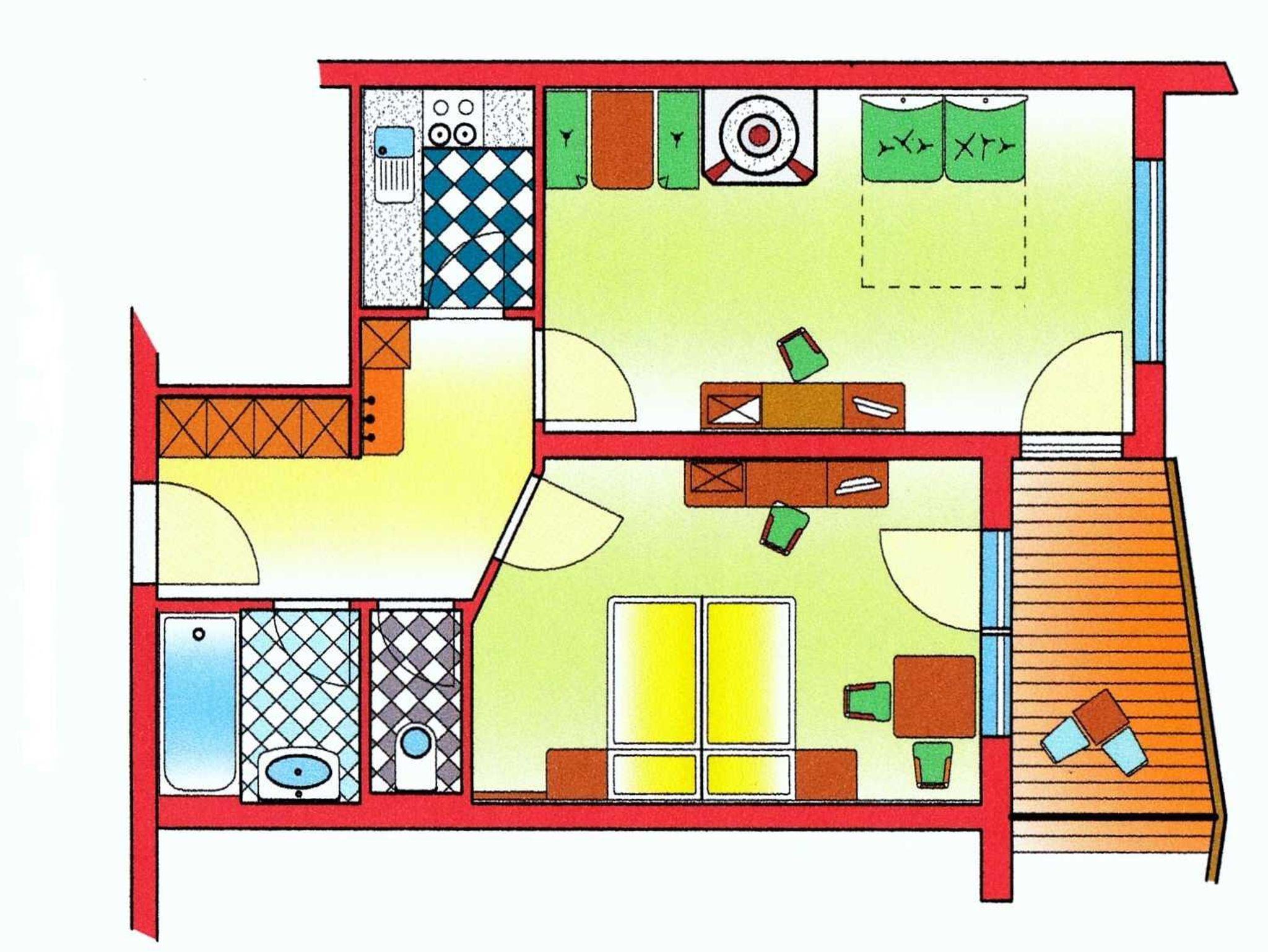 Appartement mit Balkon oder Terrasse, Vorraum mit Garderobe, Schlafzimmer mit Sitzecke, Wohnraum mit Esstisch, Kachelofen, Schlafcouch, komplett ausgestattete Küche. Badezimmer mit Duschbadewanne ode Dusche. Separates WC.