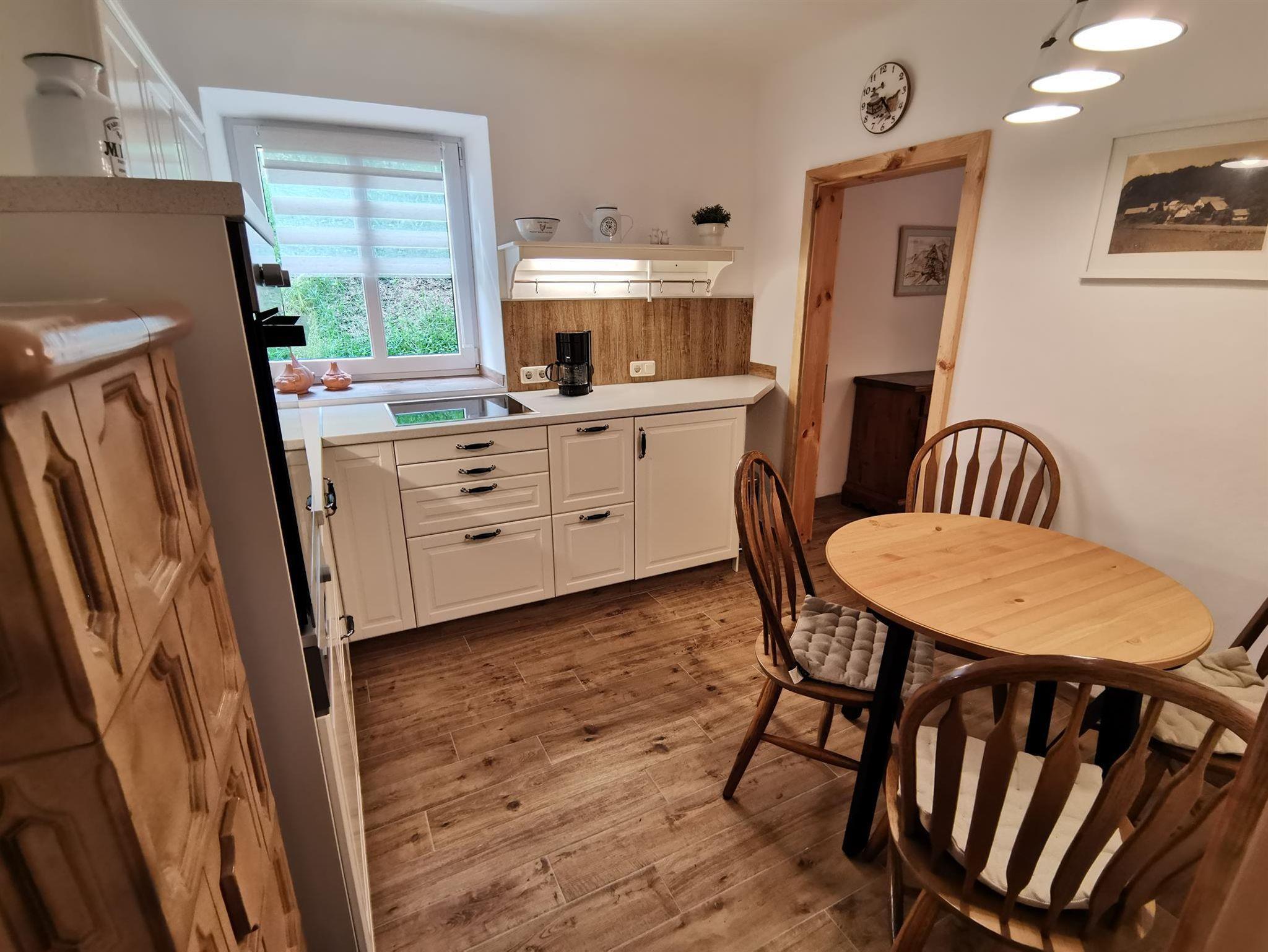 Liebevoll renoviert bietet die Wohnung im urigen Landhausstil einen Ort, an dem man sich wohlfühlen und entspannen kann. Mit 2 Schlafzimmern, einem Bad mit Dusche und eigener Waschmaschine, getrenntem WC sowie einer voll ausgestatteten Küche bietet die Wohnung genügend Platz für 2 bis 4 Personen. 2 Kachelöfen sorgen für wohlige Wärme (Brennholz steht genügend zur Verfügung). Die eigene Terrasse mit Sitzgarnitur ist ebenfalls mit dabei.
