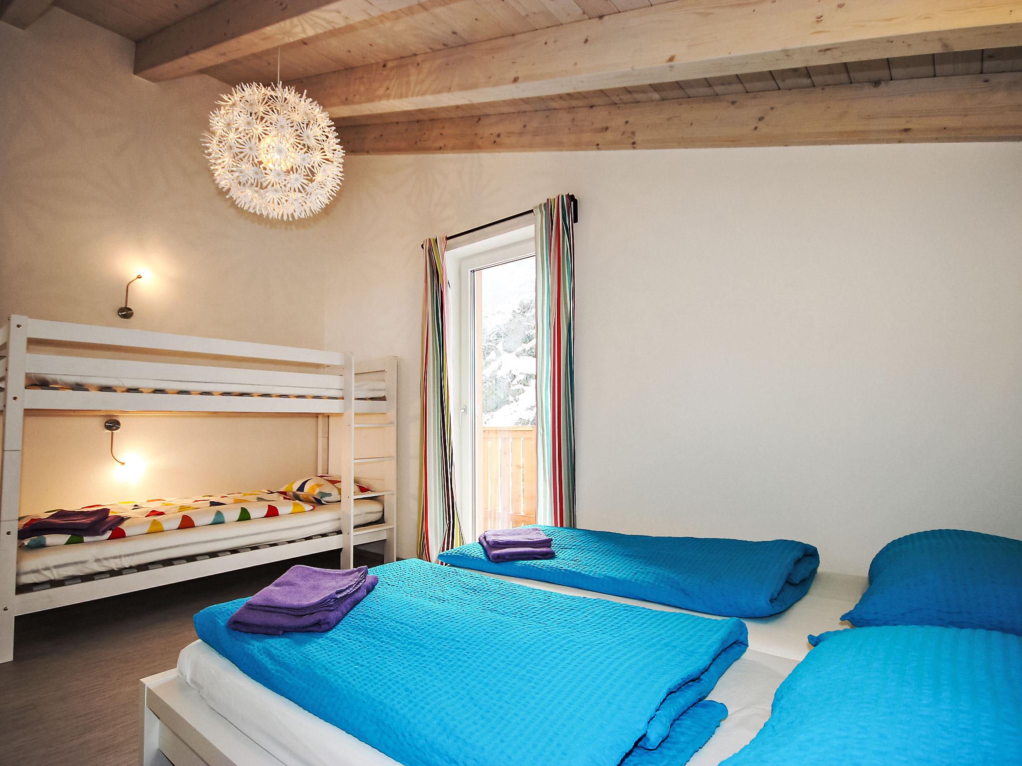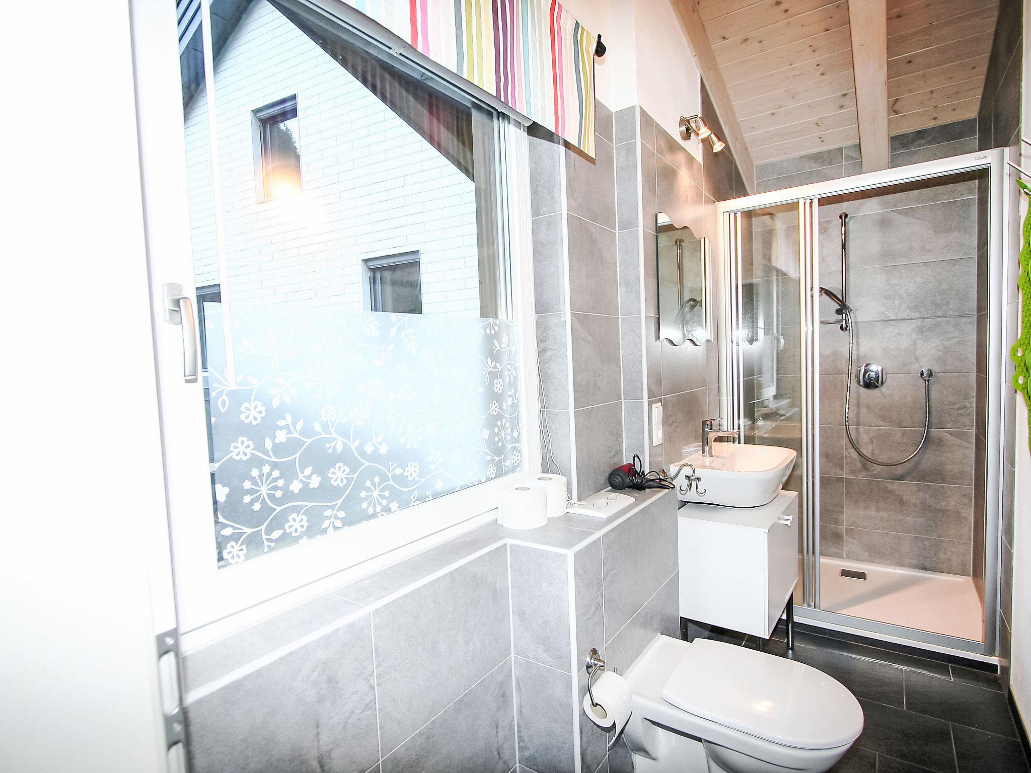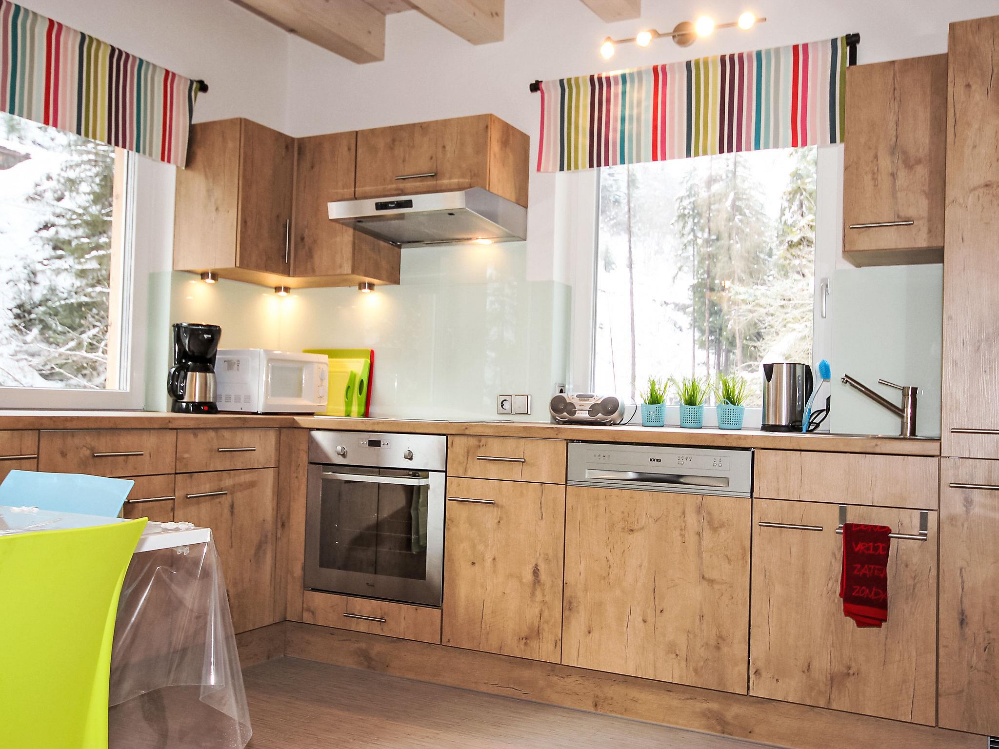 4-room chalet 85 m2. Cosy and wooden furniture furnishings: 1 small double bedroom with 1 pull-out bed (2 pers.), satellite TV (flat screen). Kitchen-/living room (oven, dishwasher, 4 induction hot plates, microwave, electric coffee machine) with dining nook. Bath/WC. Upper floor: 1 room with 1 x 2 bunk beds, 1 double bed and satellite TV (flat screen). 1 double bedroom. Shower/WC. Floor heating. Small balcony, terrace. Terrace furniture, barbecue. Facilities: hair dryer. Internet (WiFi, free). Please note: non-smokers only. Smoke alarm.