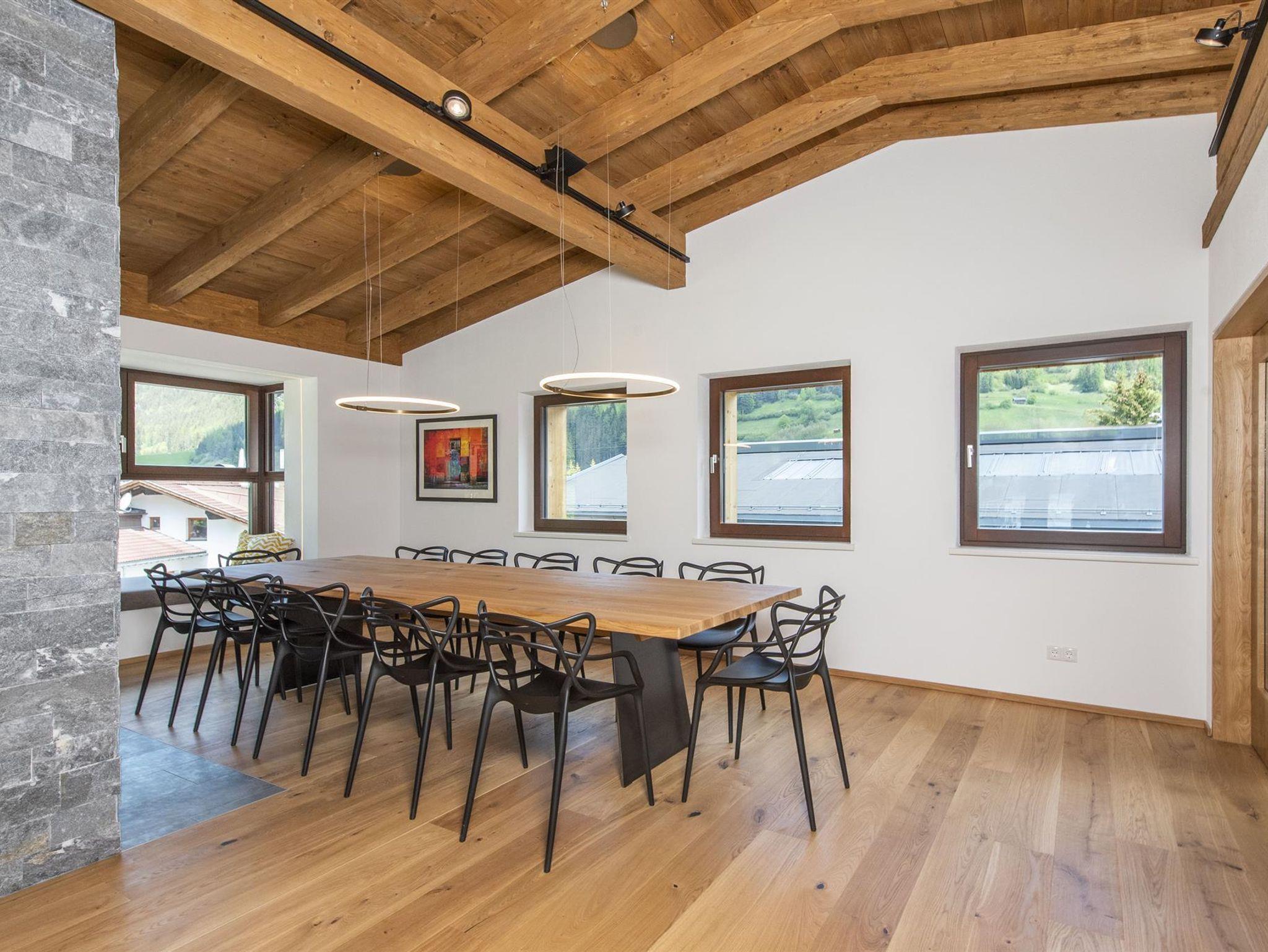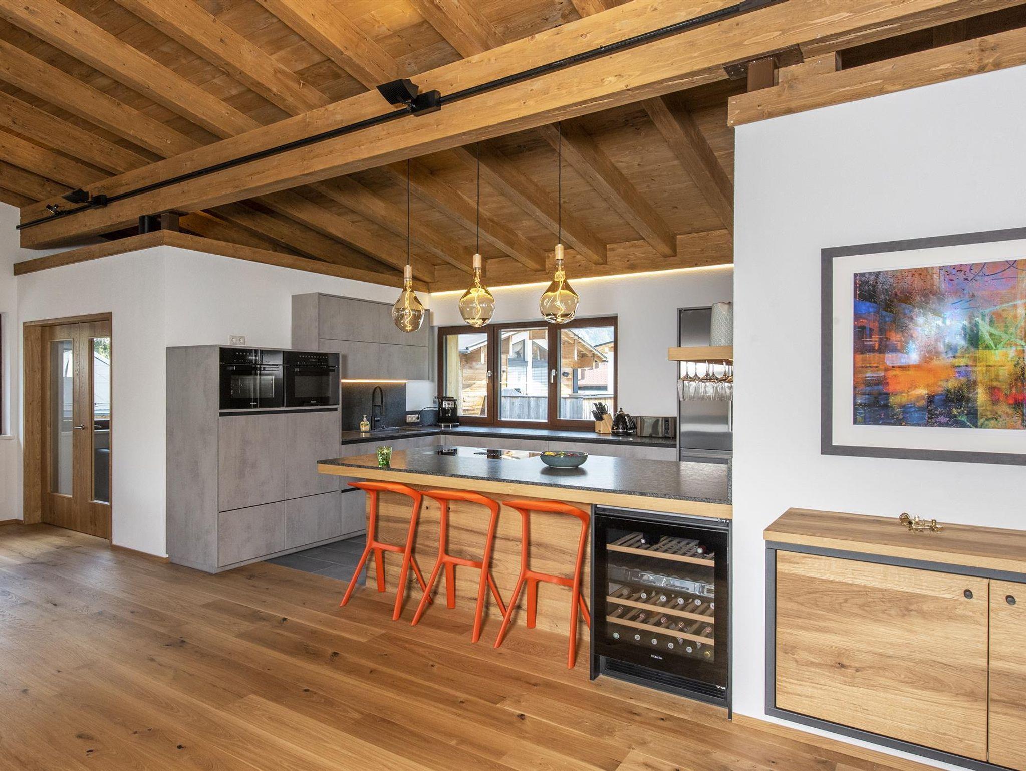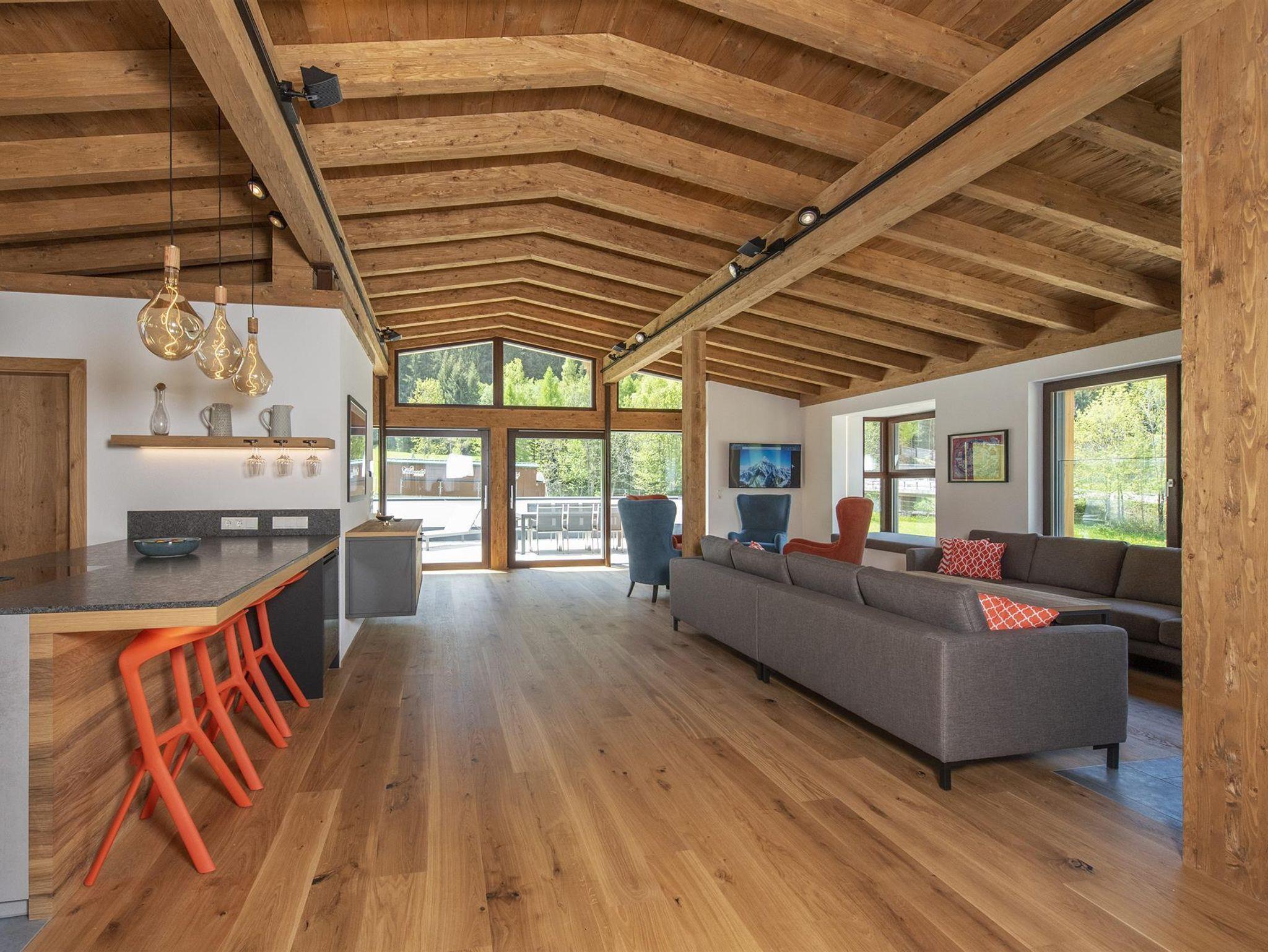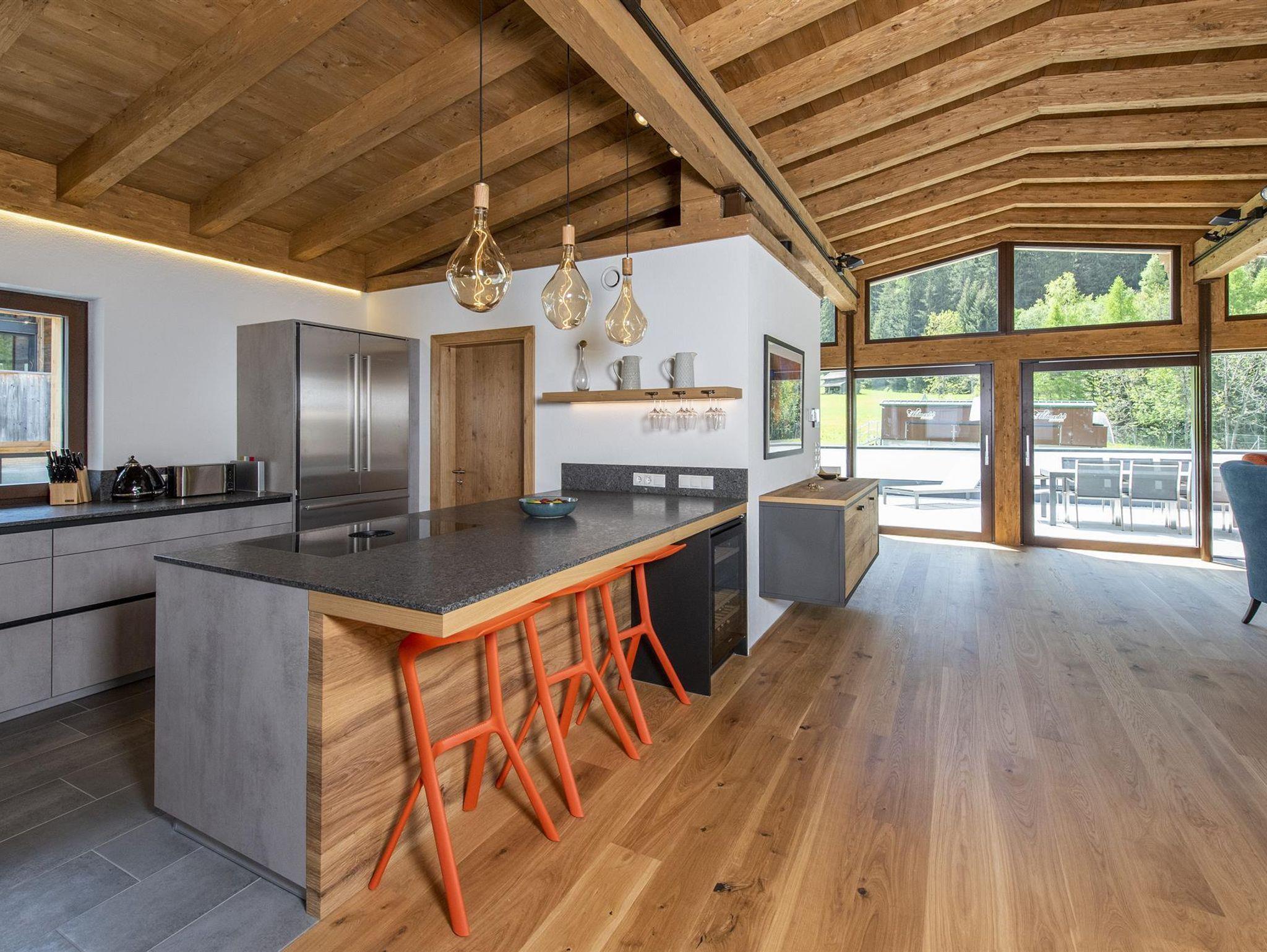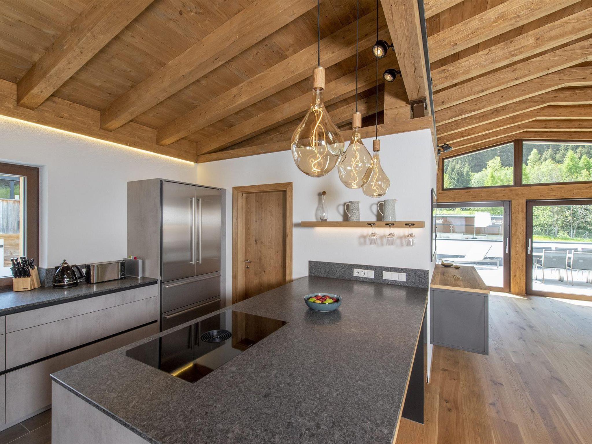 Der spektakuläre offene Wohn- und Essbereich ist schön hell und verfügt über einen offenen Kamin, einen Essbereich für 14 Personen, viele gemütliche Sitzmöglichkeiten, um die Erlebnisse des Tages mit Freunden und Familie zu teilen. Weiters sind hervorstehende Fenstersitze perfekt positioniert, um den atemberaubenden Ausblick zu genießen. Der Wohnbereich schließt an eine große Terrasse an, die einen ungestörten Blick auf den Berg Hoher Riffler bietet. Zusätzlich ist auch eine Bibliothek nebem dem Essbereich angesiedelt, um einen ruhigen und gemütlichen Rückzugsort zu bieten. Die state of the art Küche ist voll ausgestattet mit allem was Sie brauchen. Dazu zählen 2 Geschirrspüler, Induktionsherd, ein großer Kühl- und Gefrierschrank, eine Kaffemaschine, Barhocker und eine Speisekammer mit zusätzlichem Kühlschrank.