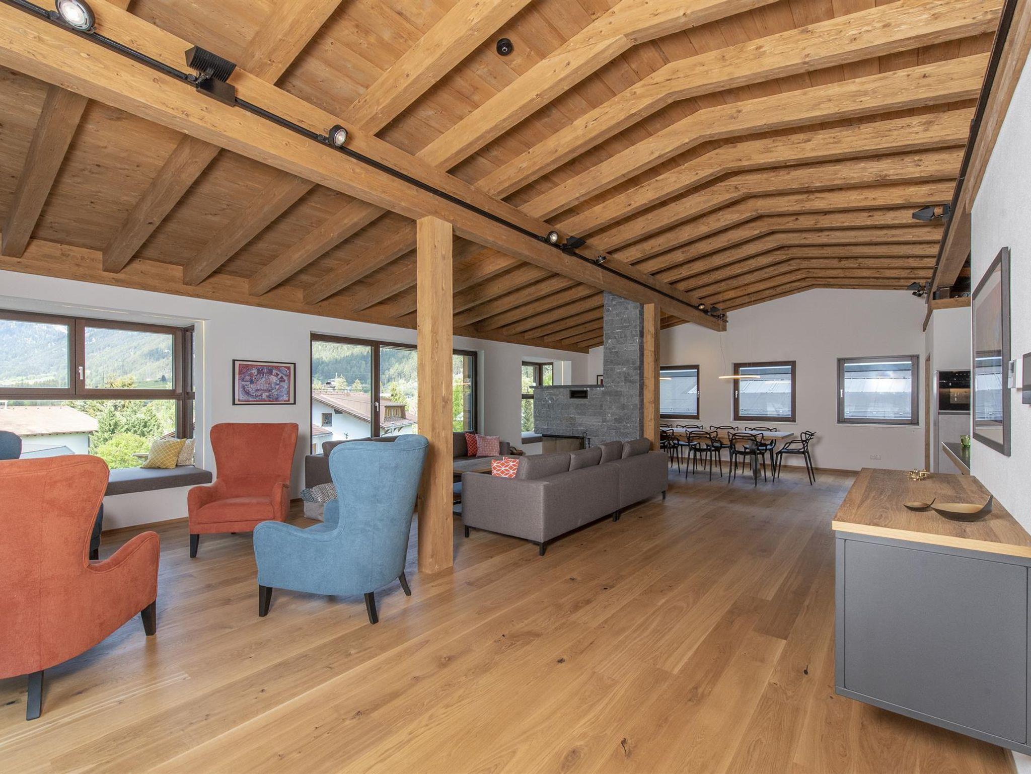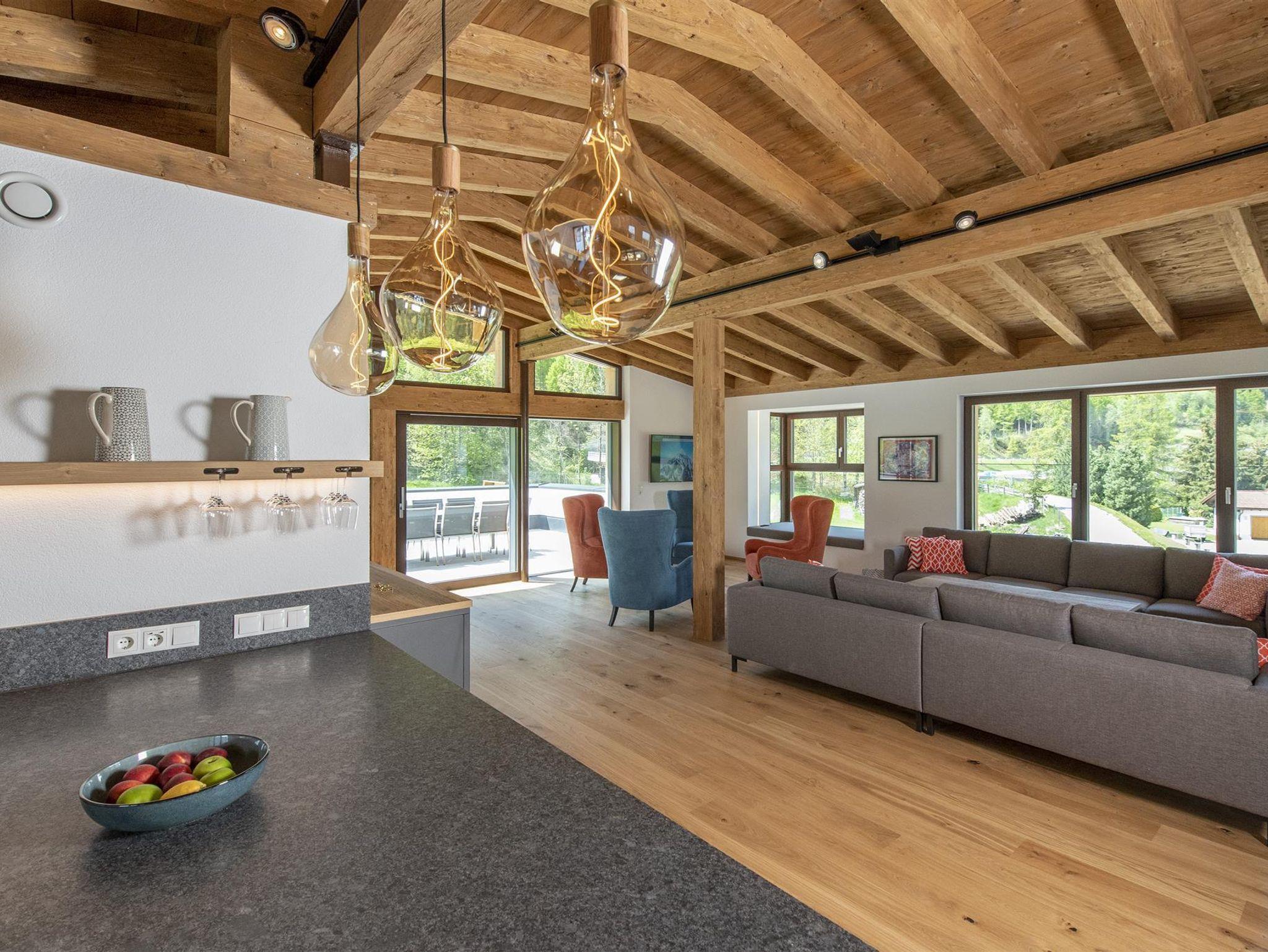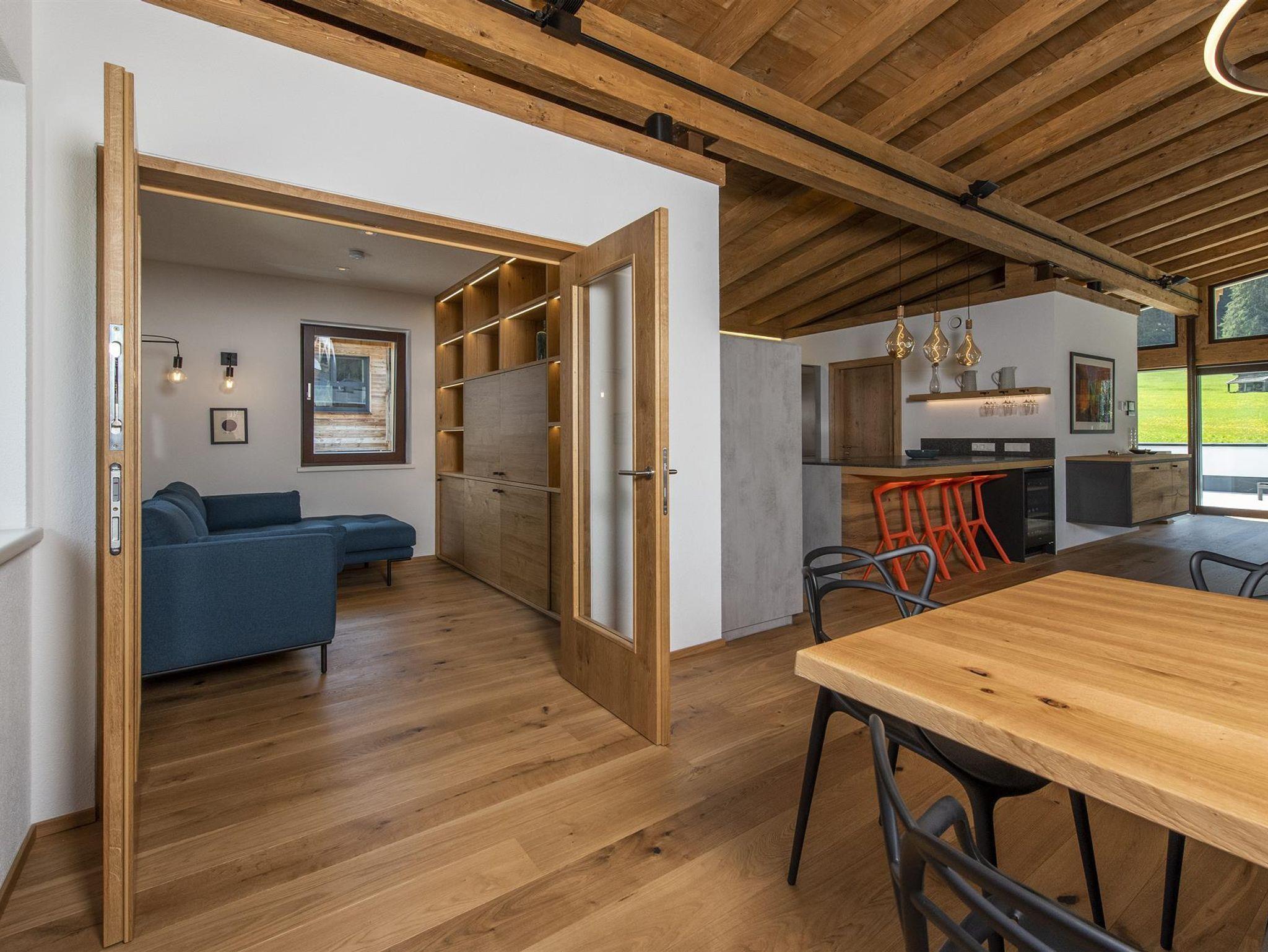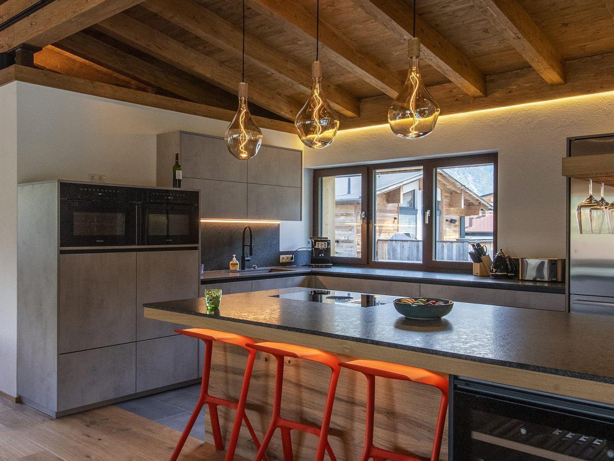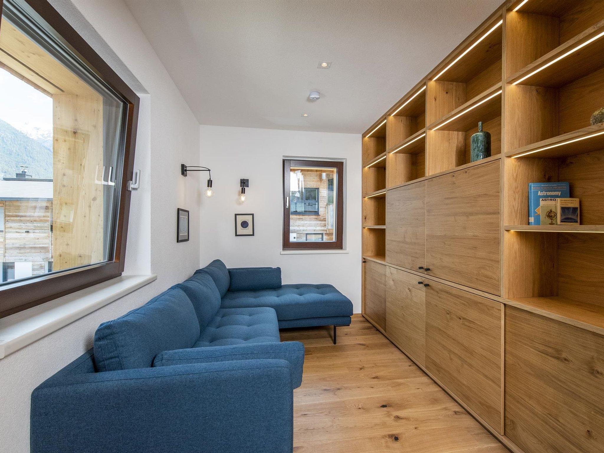 Der spektakuläre offene Wohn- und Essbereich ist schön hell und verfügt über einen offenen Kamin, einen Essbereich für 14 Personen, viele gemütliche Sitzmöglichkeiten, um die Erlebnisse des Tages mit Freunden und Familie zu teilen. Weiters sind hervorstehende Fenstersitze perfekt positioniert, um den atemberaubenden Ausblick zu genießen. Der Wohnbereich schließt an eine große Terrasse an, die einen ungestörten Blick auf den Berg Hoher Riffler bietet. Zusätzlich ist auch eine Bibliothek nebem dem Essbereich angesiedelt, um einen ruhigen und gemütlichen Rückzugsort zu bieten. Die state of the art Küche ist voll ausgestattet mit allem was Sie brauchen. Dazu zählen 2 Geschirrspüler, Induktionsherd, ein großer Kühl- und Gefrierschrank, eine Kaffemaschine, Barhocker und eine Speisekammer mit zusätzlichem Kühlschrank.