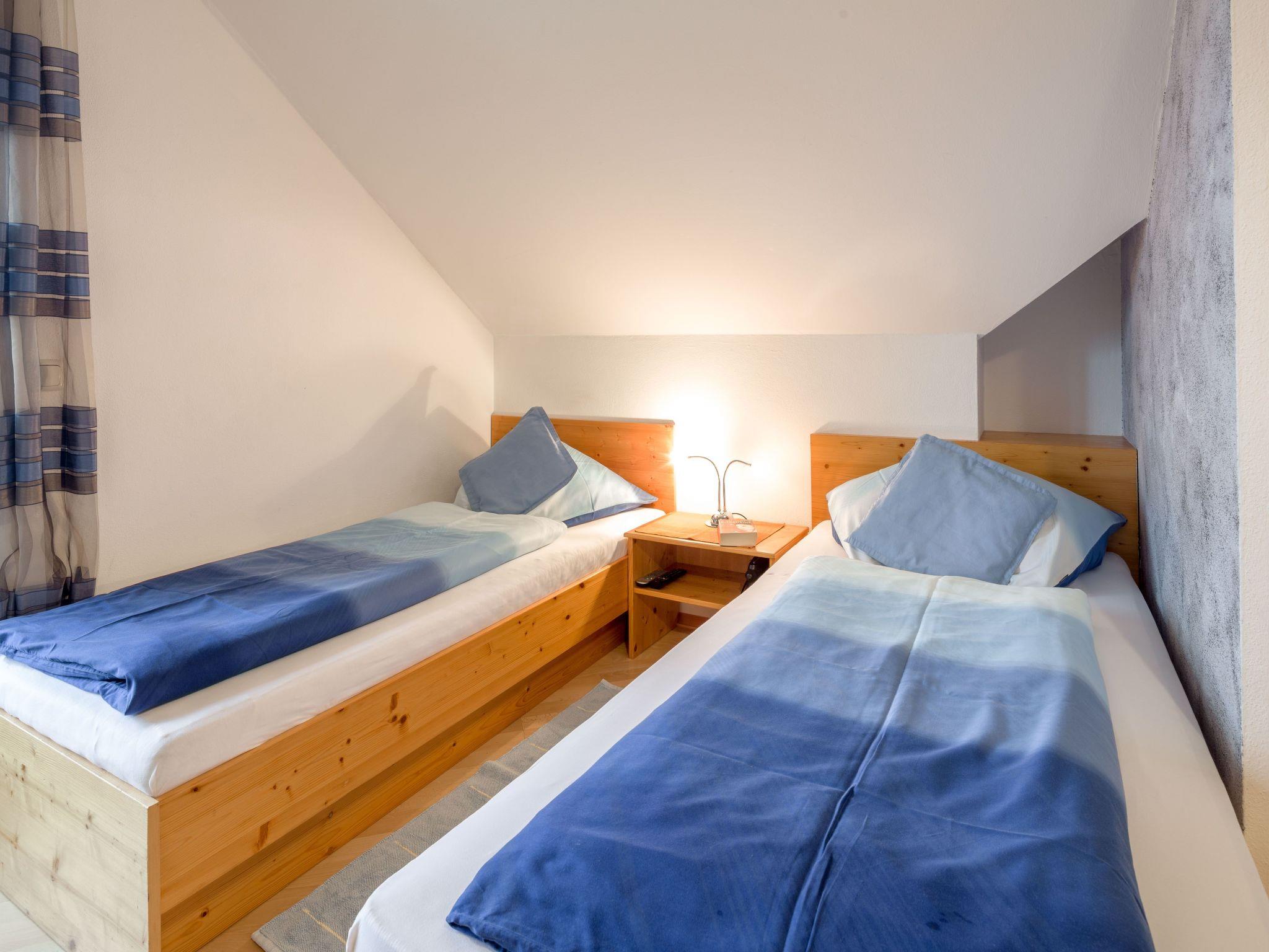 This 25m² studio for two people is in the attic of the house. It is charmingly furnished with solid wood furniture and provides modern amenities such as satellite TV, a safe and wireless Internet access. The apartment has a sleeping area with two single beds. The kitchen unit next to it is equipped with a two-ring hob, a capsule coffee machine, a fridge, a microwave and a kettle. The bathroom has a shower, washbasin and a hairdryer. The WC is separate next to the bathroom. The studio has underfloor heating.