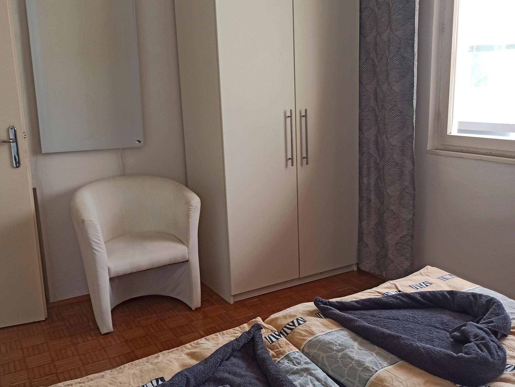 Im Schlafzimmer befindet sich ein großes Doppelbett (180 x 200) und ein Schrank. Bettwäsche ist vorhanden.