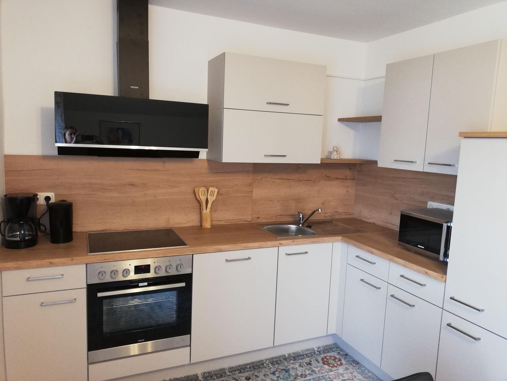 • Küche mit Backrohr, Herd, Mikrowelle, Kaffeemaschine und Geschirrspüler