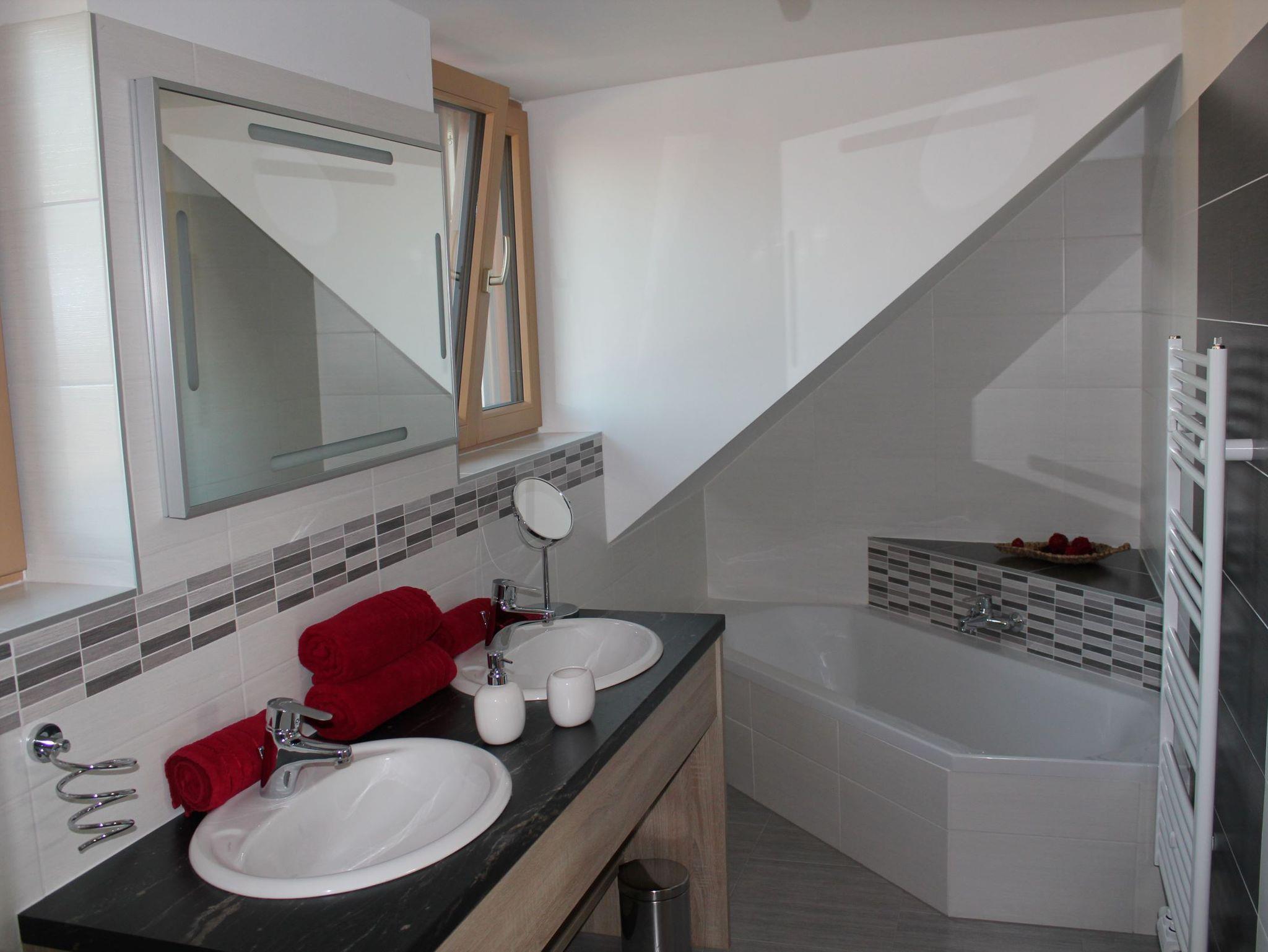 Dieses Zimmer verfügt zusätzlich zur Standardausstattung über ein Bettsofa für einen Erwachsenen oder zwei Kinder sowie einer Wellnessdusche einer großzügigen Badewanne, einen Doppelwaschtisch und einen Handtuchwärmer im Badezimmer.