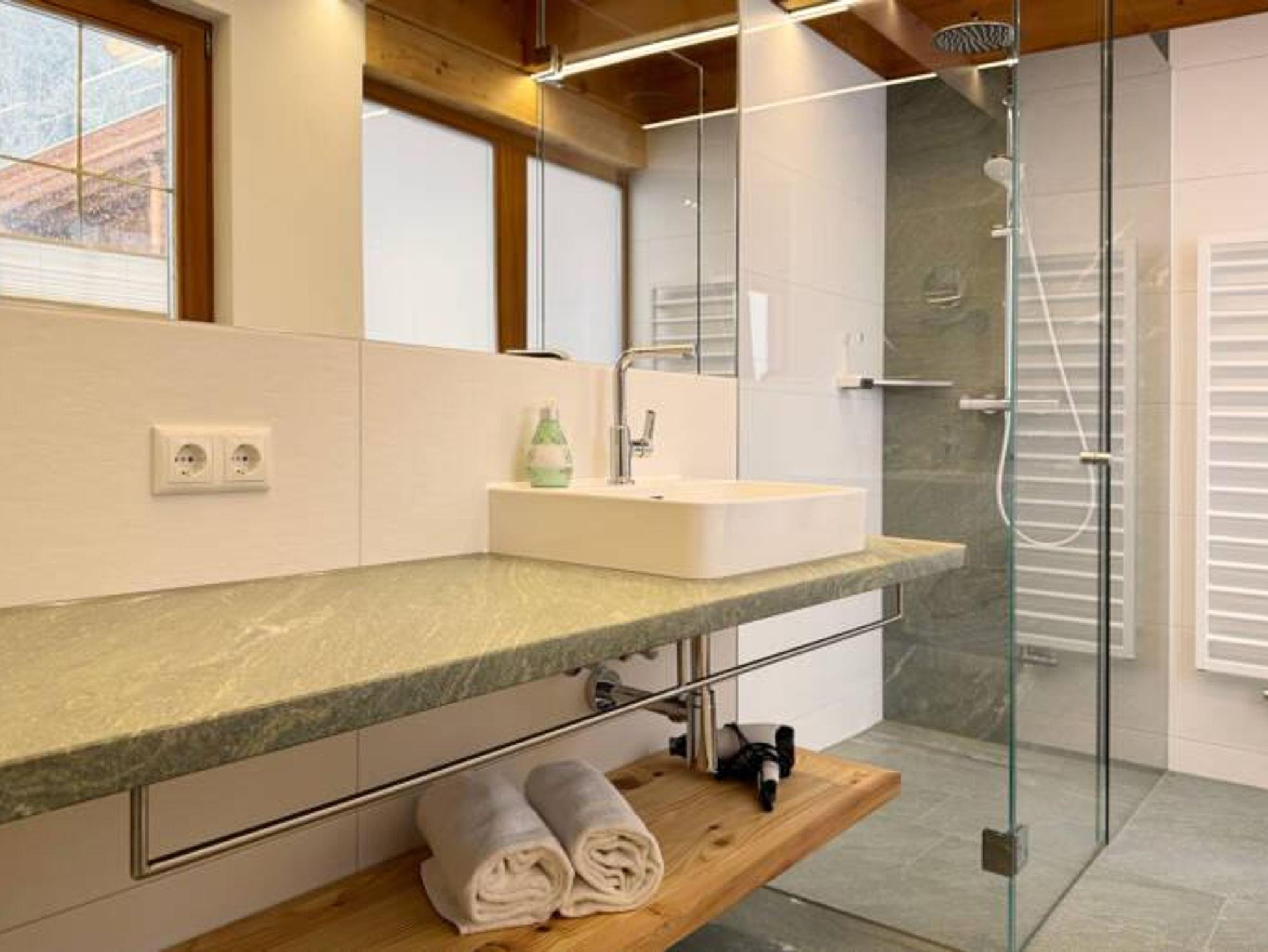 • Modernes Badezimmer, Naturstein, Fußbodenheizung, Fön