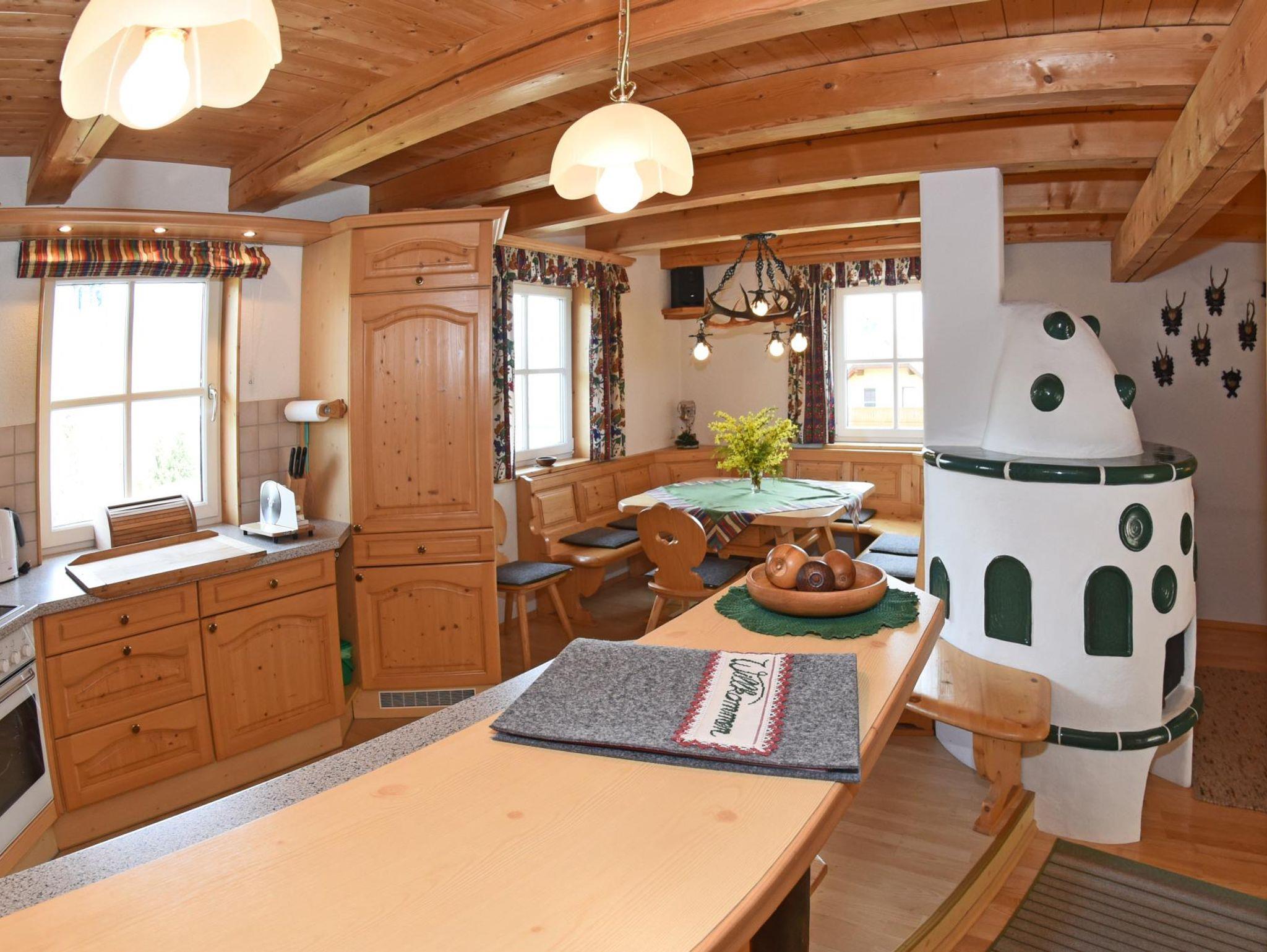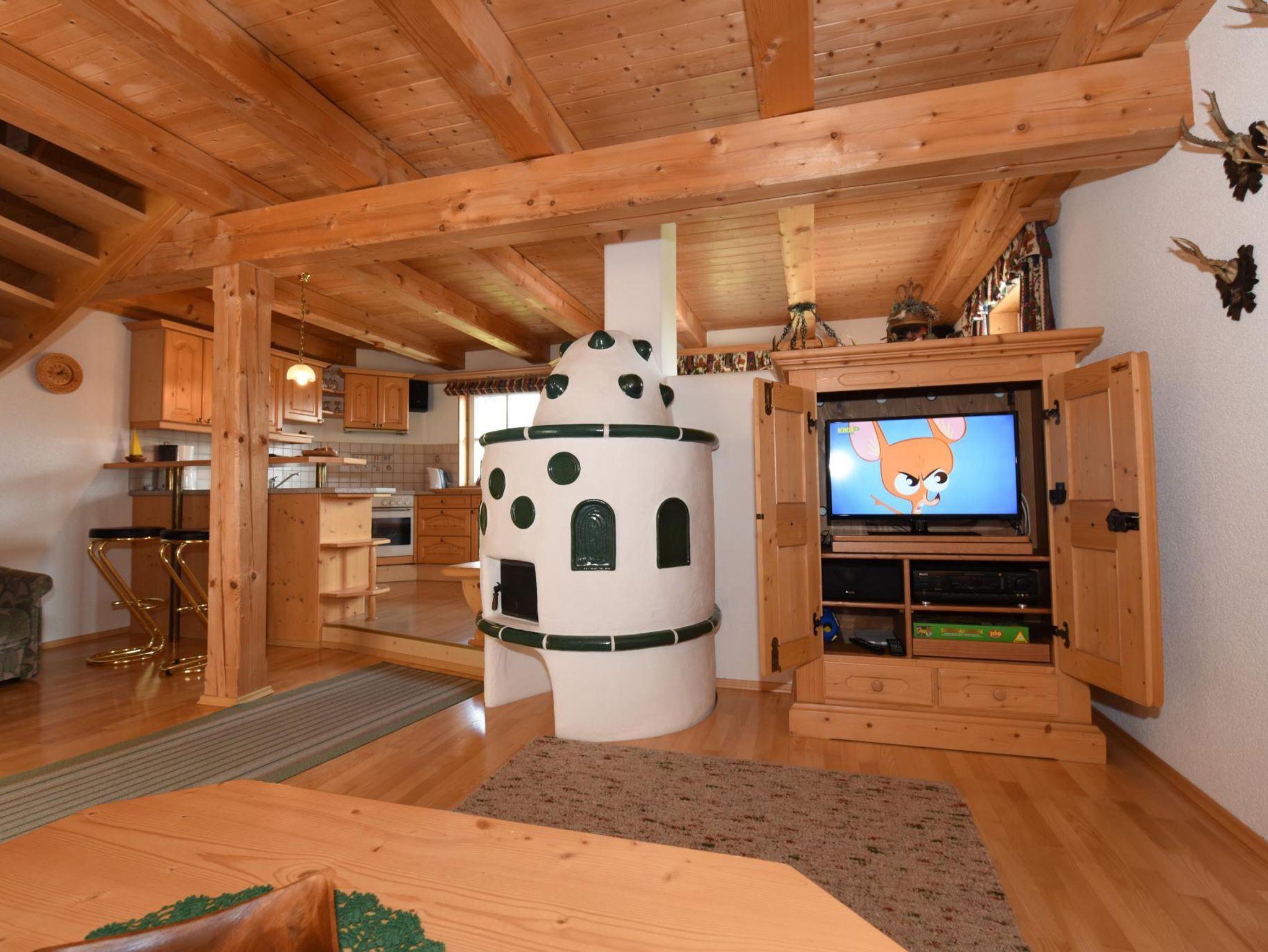 Das mit viel Holz ausgestattete ****Appartement für 2 - 6 (8) Personen bietet Ihnen einen Wintergarten mit Skischuhtrockner. Eine voll ausgestattete Küche mit E-Herd/Backrohr, Geschirrspüler, Kühlschrank/Eisfach, Wasserkocher, Toaster, Brotschneidemaschine. Einen Wohnbereich mit SAT-TV, Kachelofen (zentralbeheizt), Spielecke, Hifi-Anlage mit CD-Player. 1 WC im Erdgeschoß und ein Bad mit WC im 1. Stock mit Fußbodenheizung, Handtuchtrockner, Dusche, Fön, ausreichend Handtücher und eine Waschmaschine. Zwei Doppelbettschlafzimmer, wobei 1 Zimmer einen Balkon mit herrlichem Panoramablick bietet, sowie ein Etagenbettzimmer.