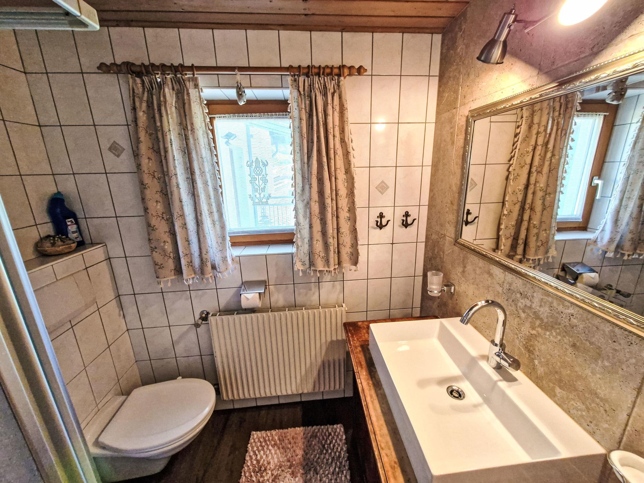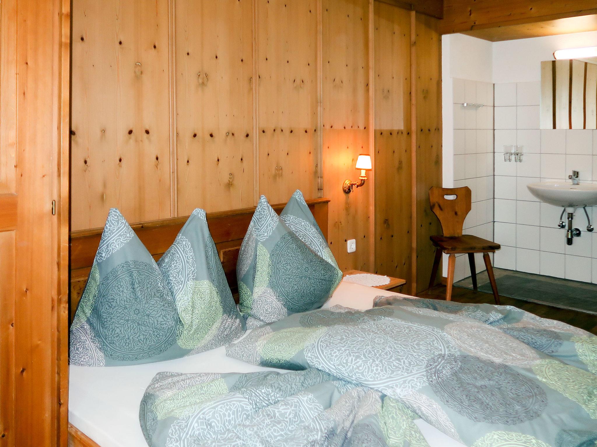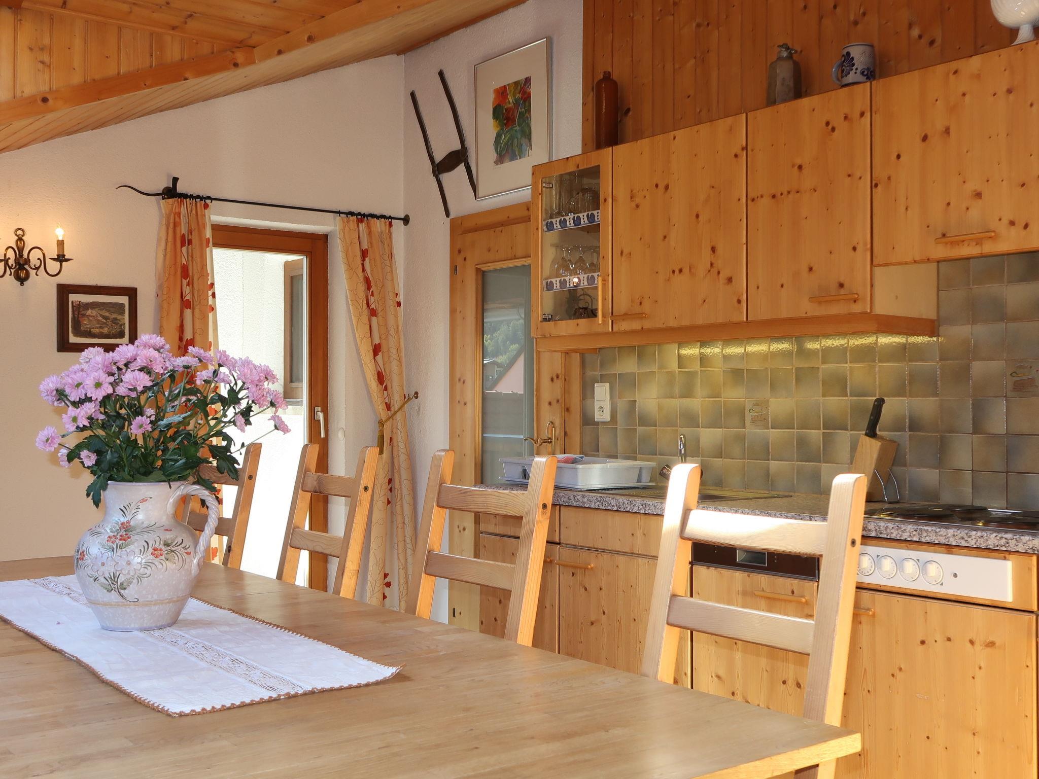 "Leo", 5-room apartment 115 m2 on 2nd floor, south-east facing position. Cosy and wooden furniture furnishings: small living room with satellite TV. 2 double bedrooms, each room with hand-basin. 1 room with 1 bed, 1 double bed and hand-basin. With sloping ceilings kitchen-/living room (4 hot plates, oven, dishwasher, toaster, kettle, microwave, electric coffee machine) with 1 bed, dining table, satellite TV, radio and CD-player. Exit to the balcony. 2 showers/WC, sep. WC, double hand-basin. Heating. Parquet floors. Balcony. Balcony furniture, barbecue. View of the mountains. Facilities: children's high chair, baby cot. Internet (WiFi, free). Please note: private entrance, smoke alarm.