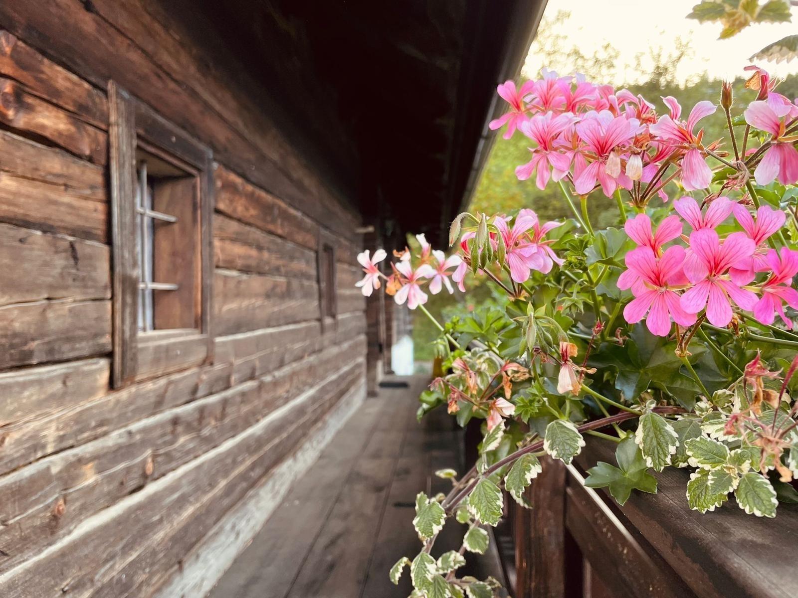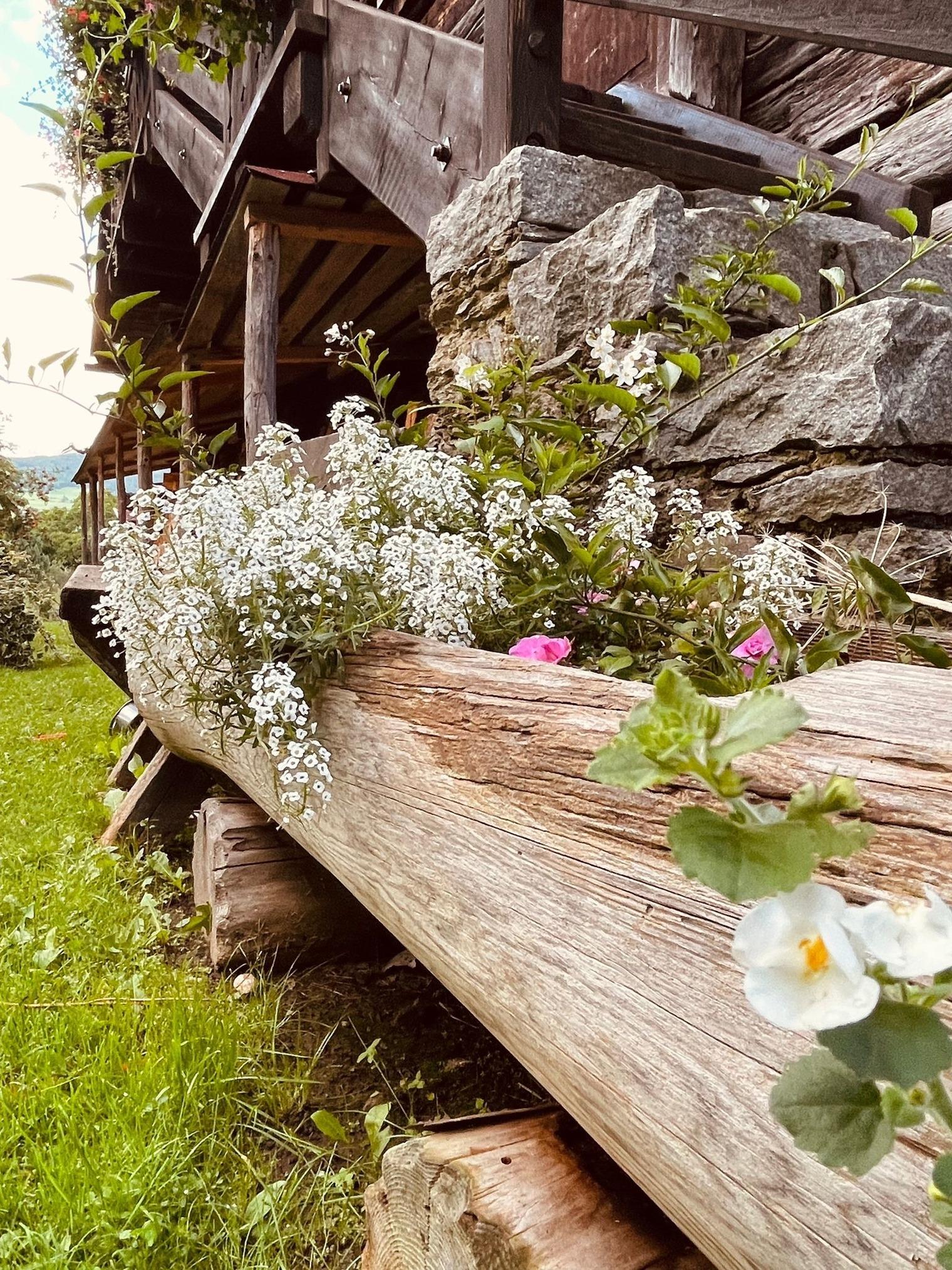 Der schöne Garten enthält an einem kleinen Bach eine große Sonnenterrasse, die mit vielen Sitz- und Liegeplätzen zum Verweilen einlädt; wobei die Durstigen sich vor dem Haus am Trinkwasserbrunnen laben können.