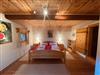 Die 120 qm große Ferienwohnung enthält ein geräumiges Wohnzimmer mit mehreren Sitzecken, Kachelofen, Smart-TV, Wanderkarten und Büchern.