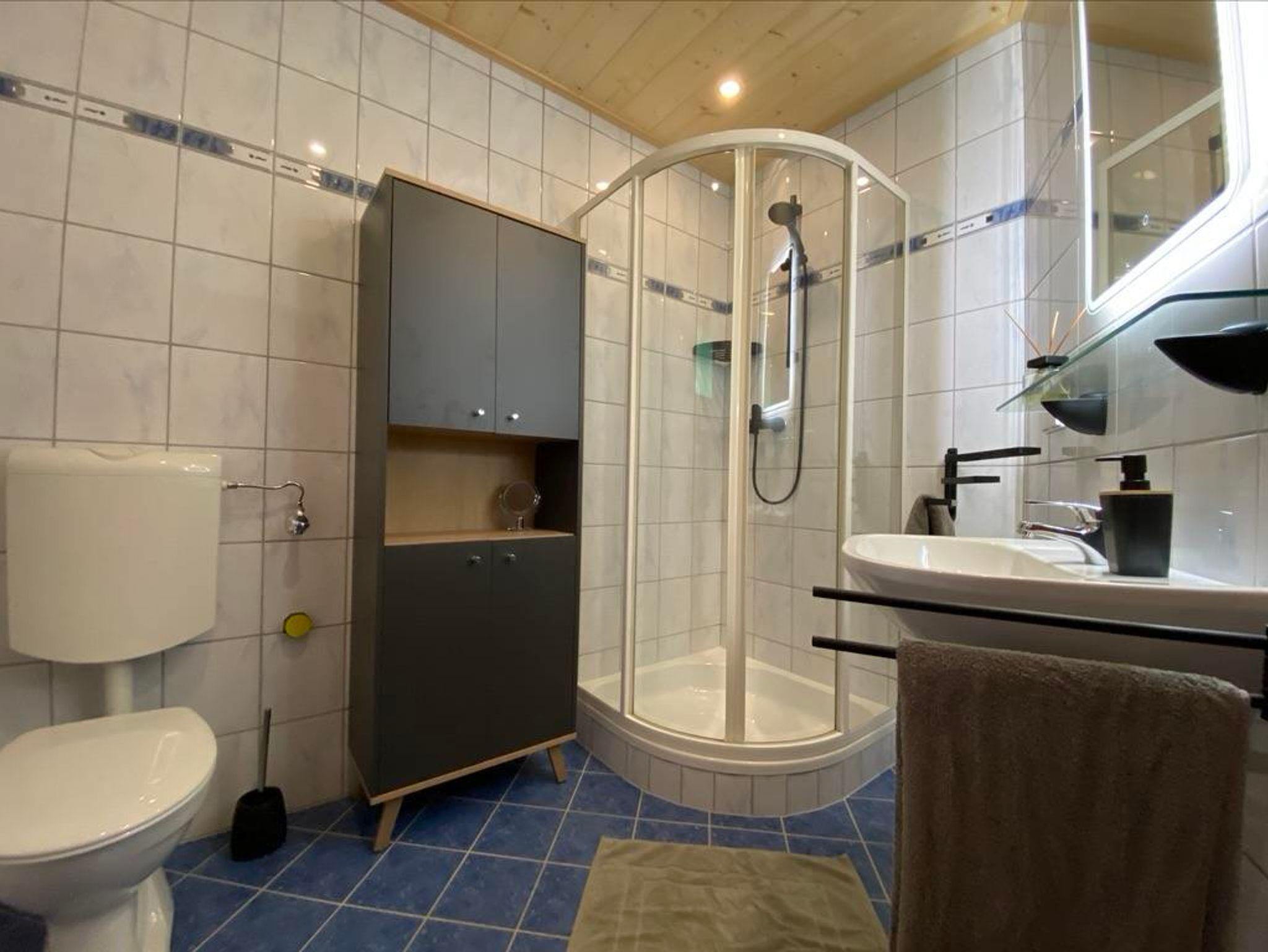 Badezimmer; das Badezimmer verfügt über eine Duschkabine, ein Waschbecken, ein Schrank, einen Haartrockner und eine Toilette. Badetücher sind inklusive.