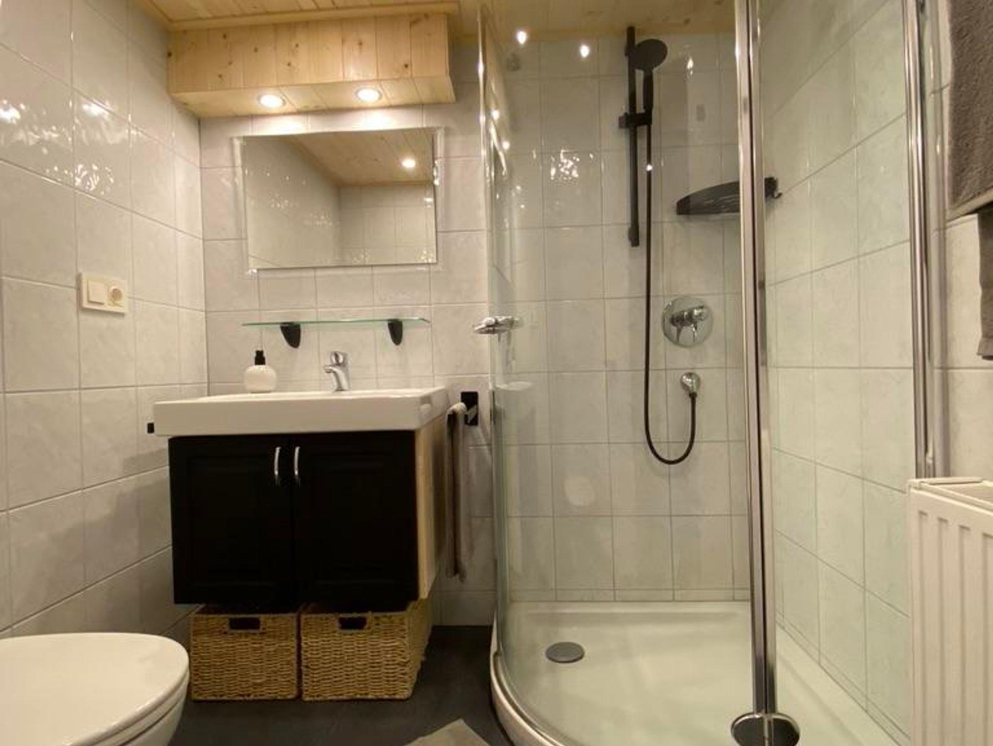 Badezimmer; das Badezimmer verfügt über eine Duschkabine, ein Waschbecken, einen Haartrockner und eine Toilette. Badetücher sind inklusive.