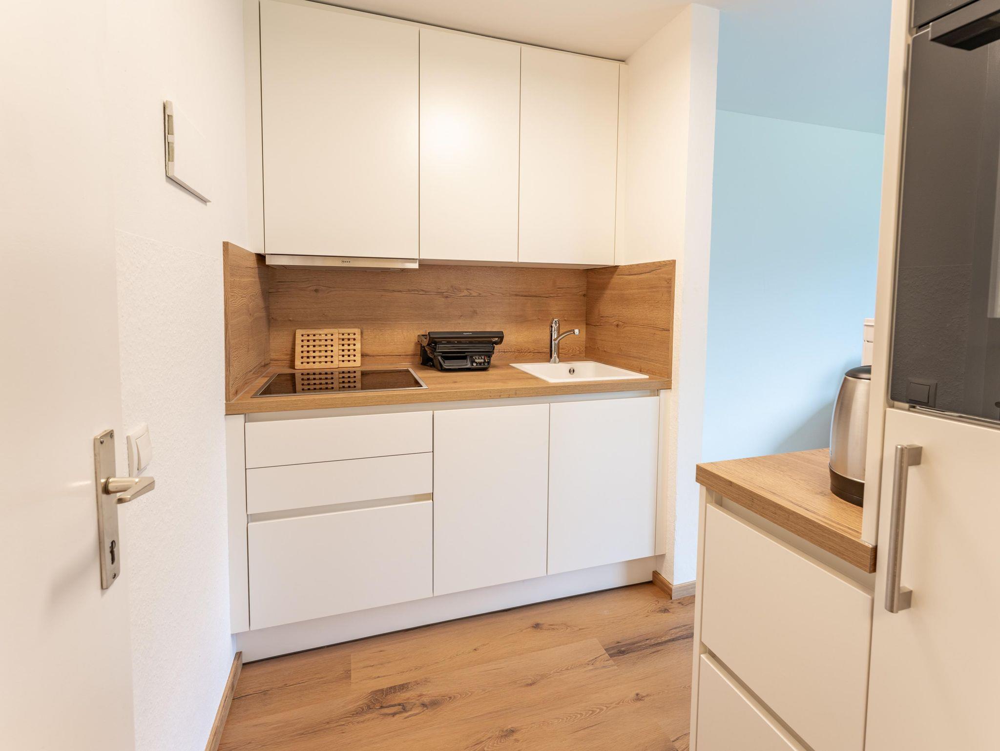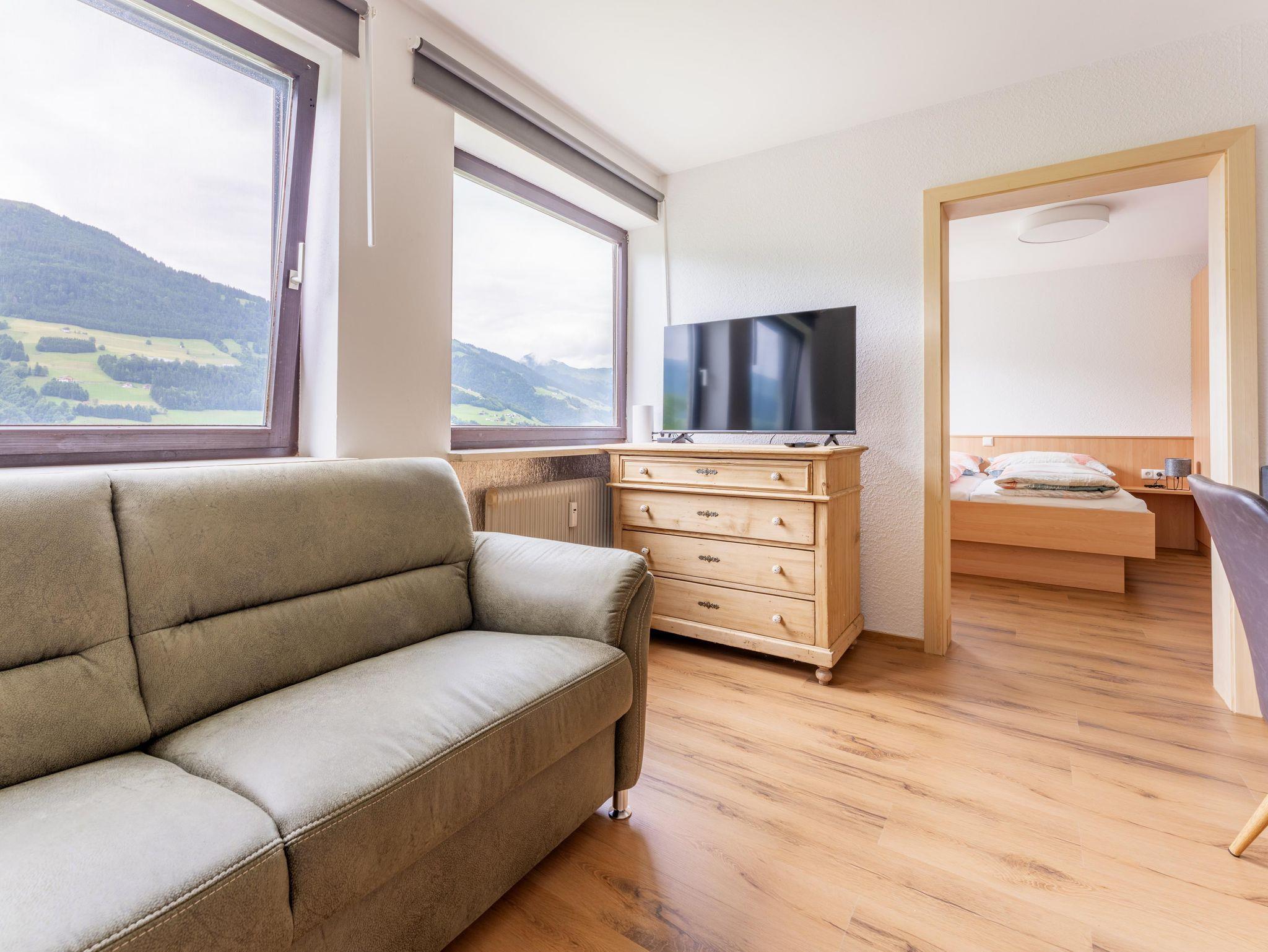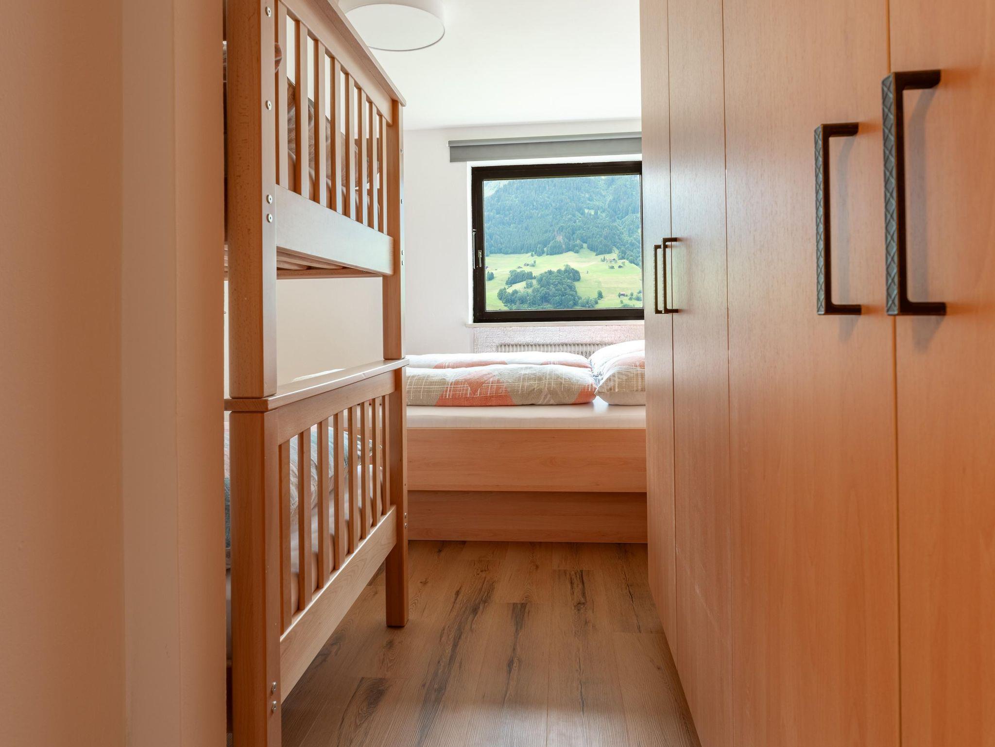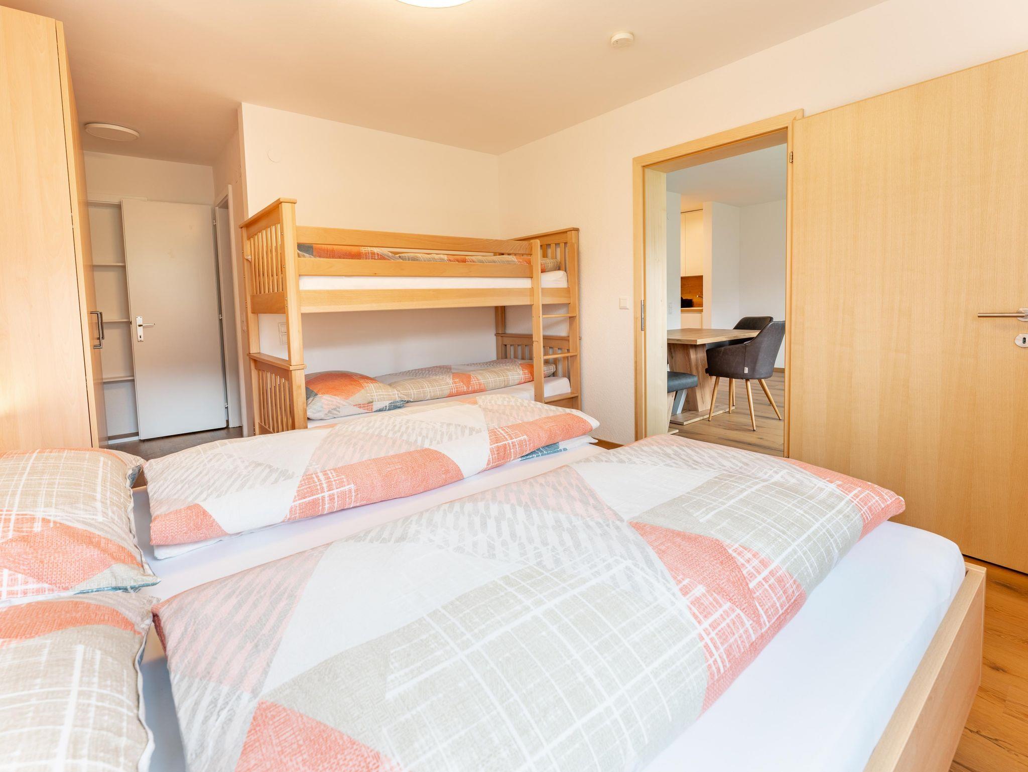 Beim Betreten des Apartments gelangt man in die voll ausgestattete Küche mit Filterkaffeemaschine, Wasserkocher, Kontaktgrill, Backofen, Kühlschrank und Geschirrspüler. Geschirr, Besteck und Gläser sind für jede Gelegenheit vorhanden. Neben der Küche befindet sich ein praktischer Hauswirtschaftsraum – ideal für Mülltrennung und zusätzlichen Stauraum. Der großzügige Wohnbereich lädt mit gemütlicher Couchecke und Fernseher zum Verweilen ein. Der angrenzende Esstisch bietet Platz für gemeinsame Mahlzeiten oder Spieleabende. Das geräumige Schlafzimmer ist ideal für Familien und mit Doppelbett, Etagenbett und viel Stauraum ausgestattet – perfekt, um nach einem aktiven Tag zur Ruhe zu kommen. Das minimalistische Bad bietet alles, was man braucht: Waschbecken, Dusche und WC. Das Apartment hat keinen eigenen Balkon, über das Treppenhaus ist jedoch ein Balkon mit Aussicht nutzbar. Es liegt zentral im Ortskern mit allen wichtigen Einrichtungen in unmittelbarer Nähe.
