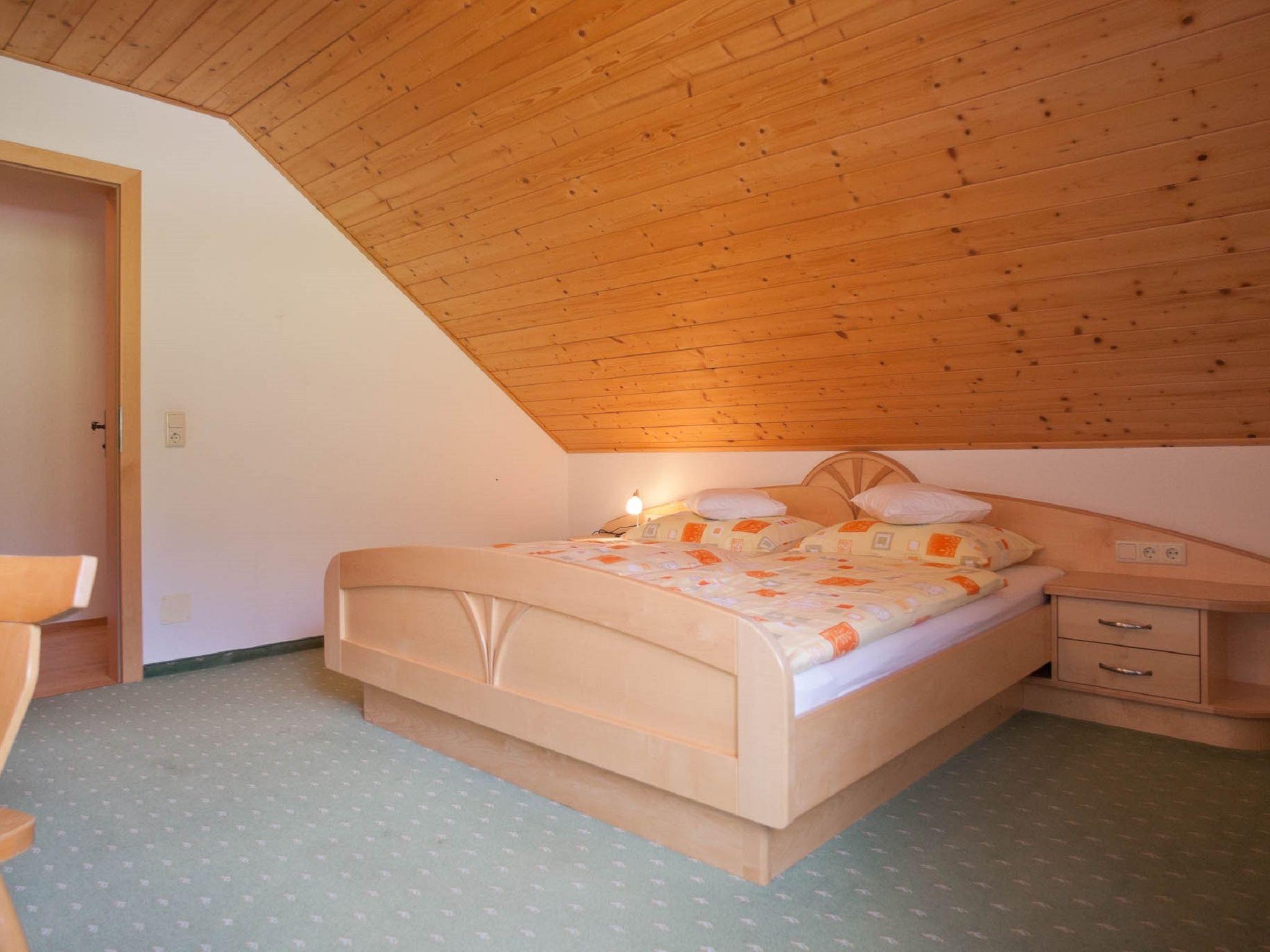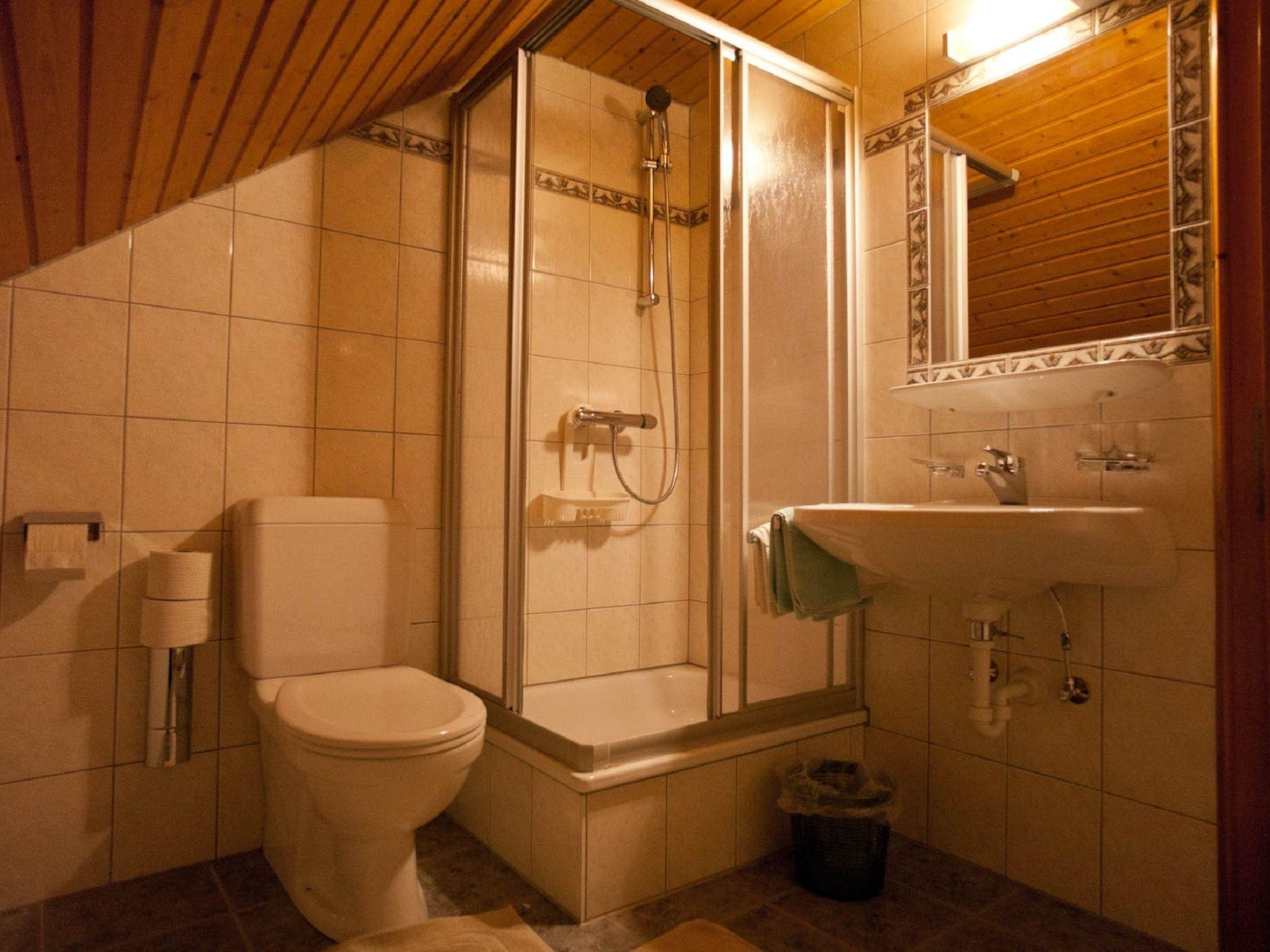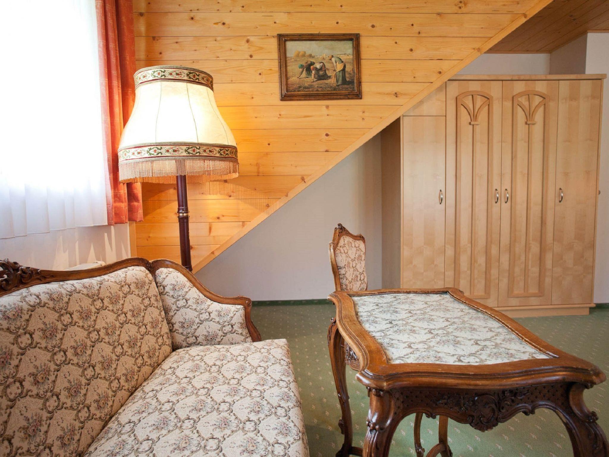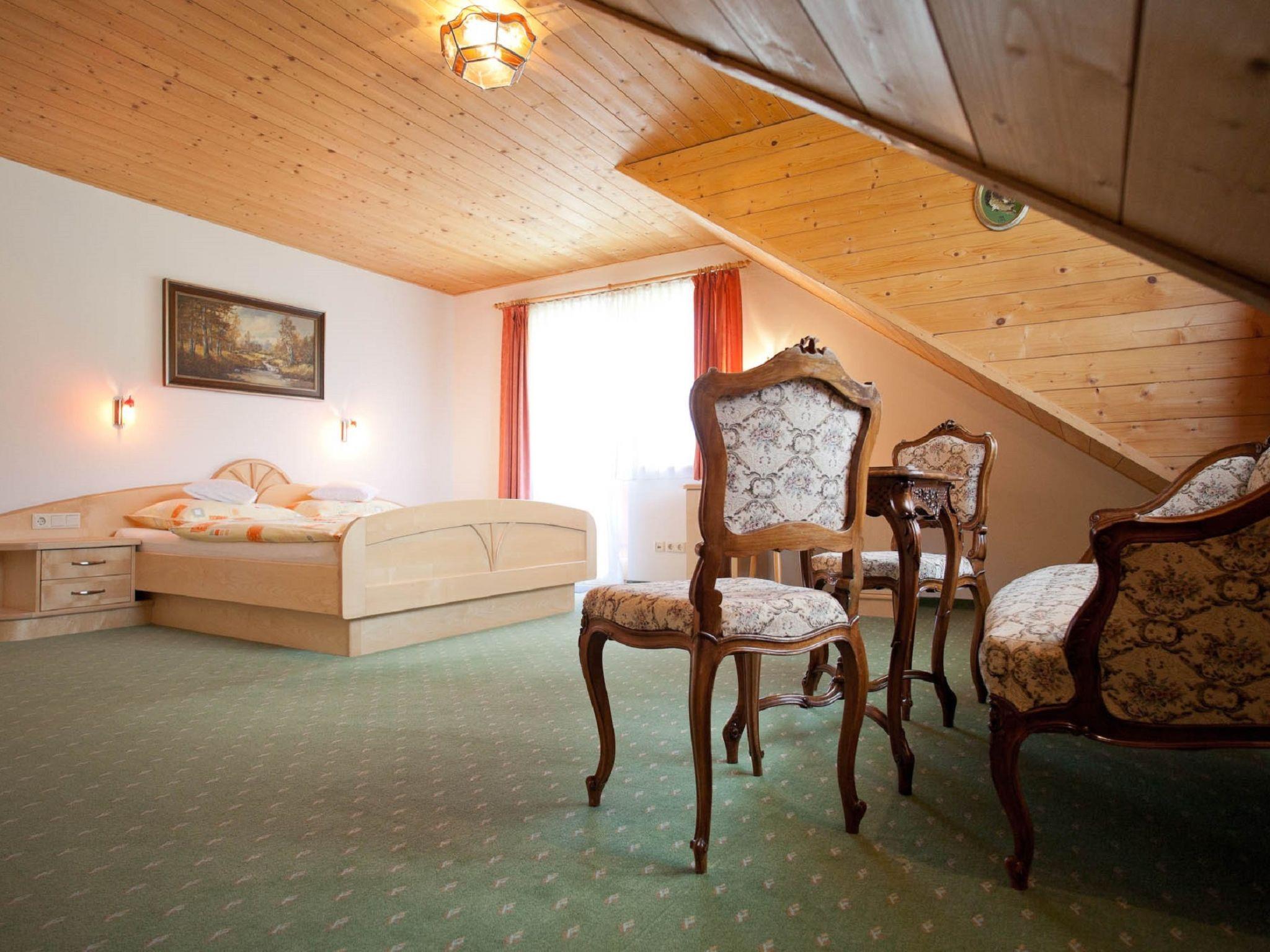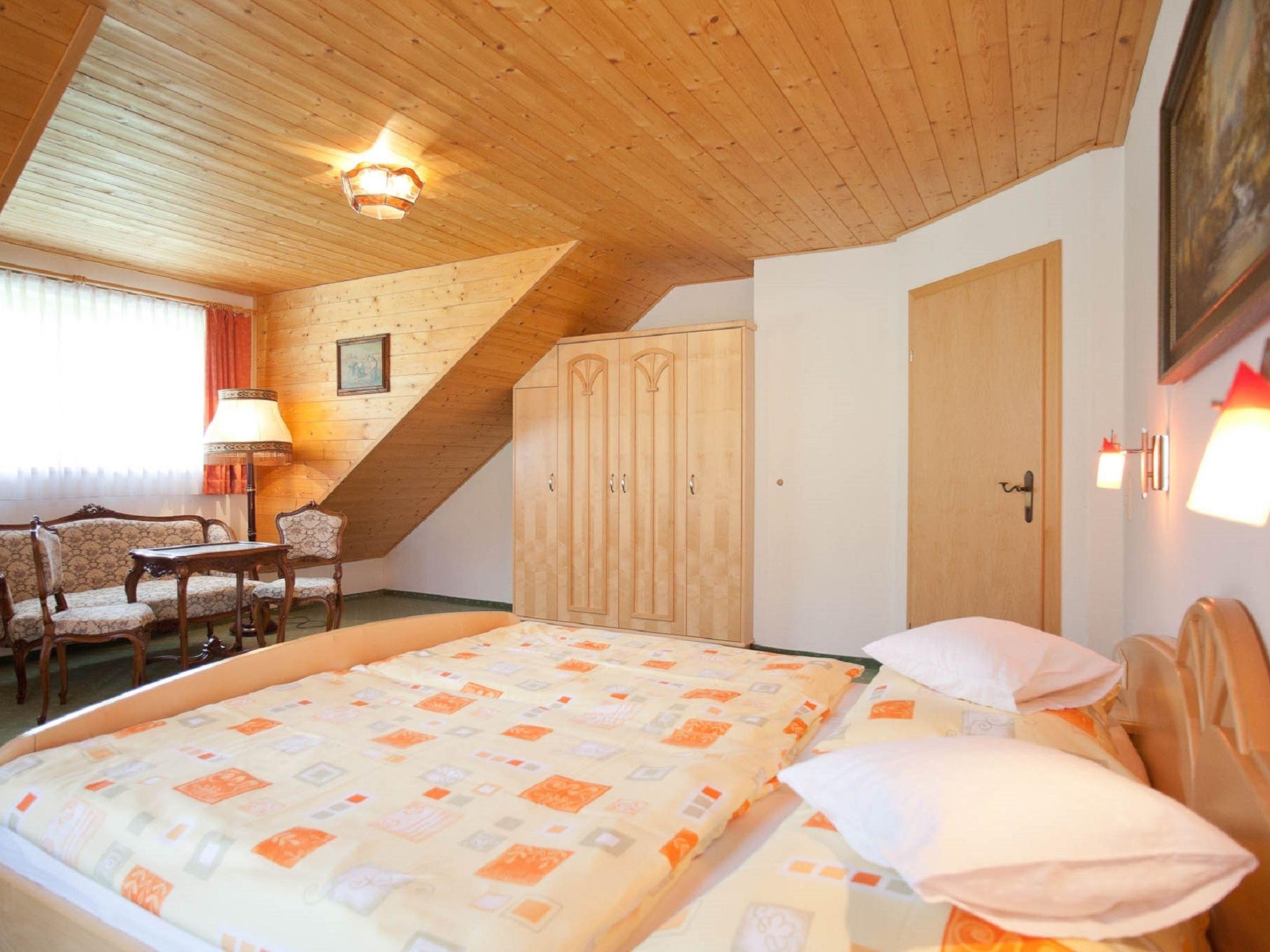 "Wohnung 5", 3-room apartment 90 m2, on the top floor. With sloping ceilings, practical and wooden furniture furnishings: 2nd upper floor: living room with dining table and satellite TV. 2 rooms, each room with 1 double bed. Exit to the balcony. Open kitchen (oven, 4 ceramic glass hob hotplates, toaster, kettle, microwave, electric coffee machine). Shower/WC, sep. WC. Wood heating. Parquet floors, carpet. Balcony. Very beautiful view of the mountains. Facilities: Internet (WiFi, free). Please note: non-smoking house. Maximum 2 pets/ dogs allowed. Smoke alarm, fire extinguisher.