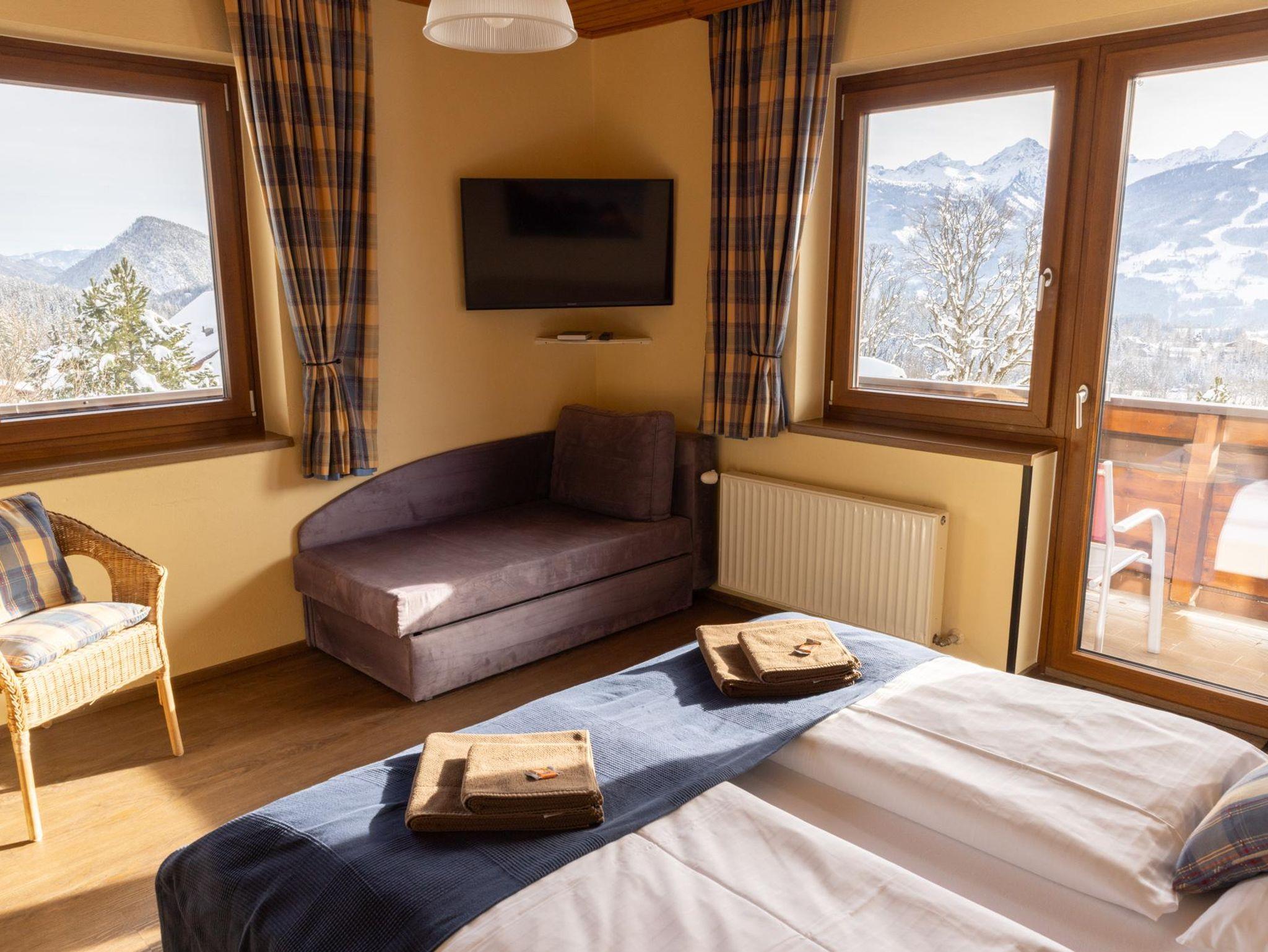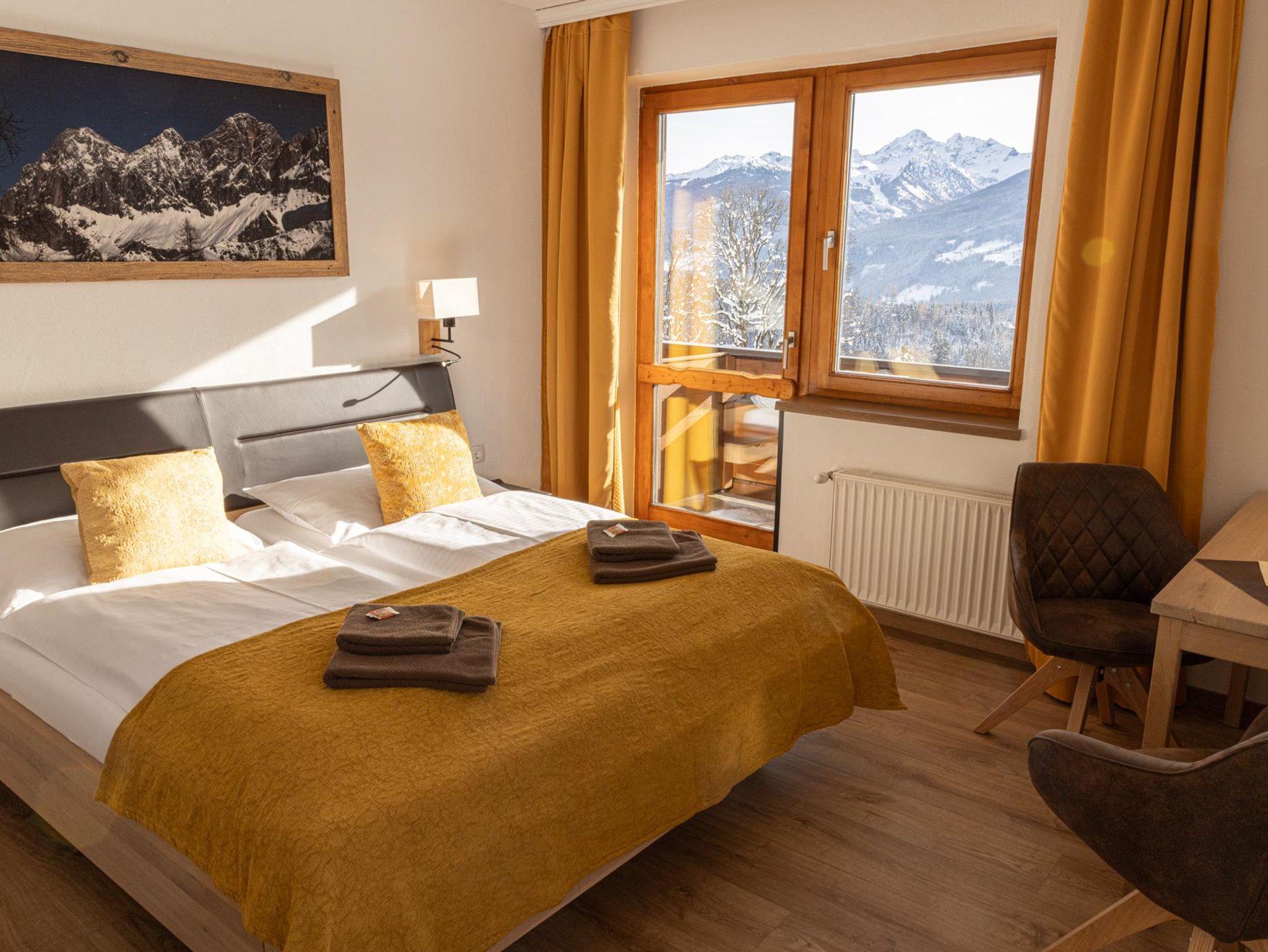 Komfortable und geräumiges Zimmer mit Bergblick.