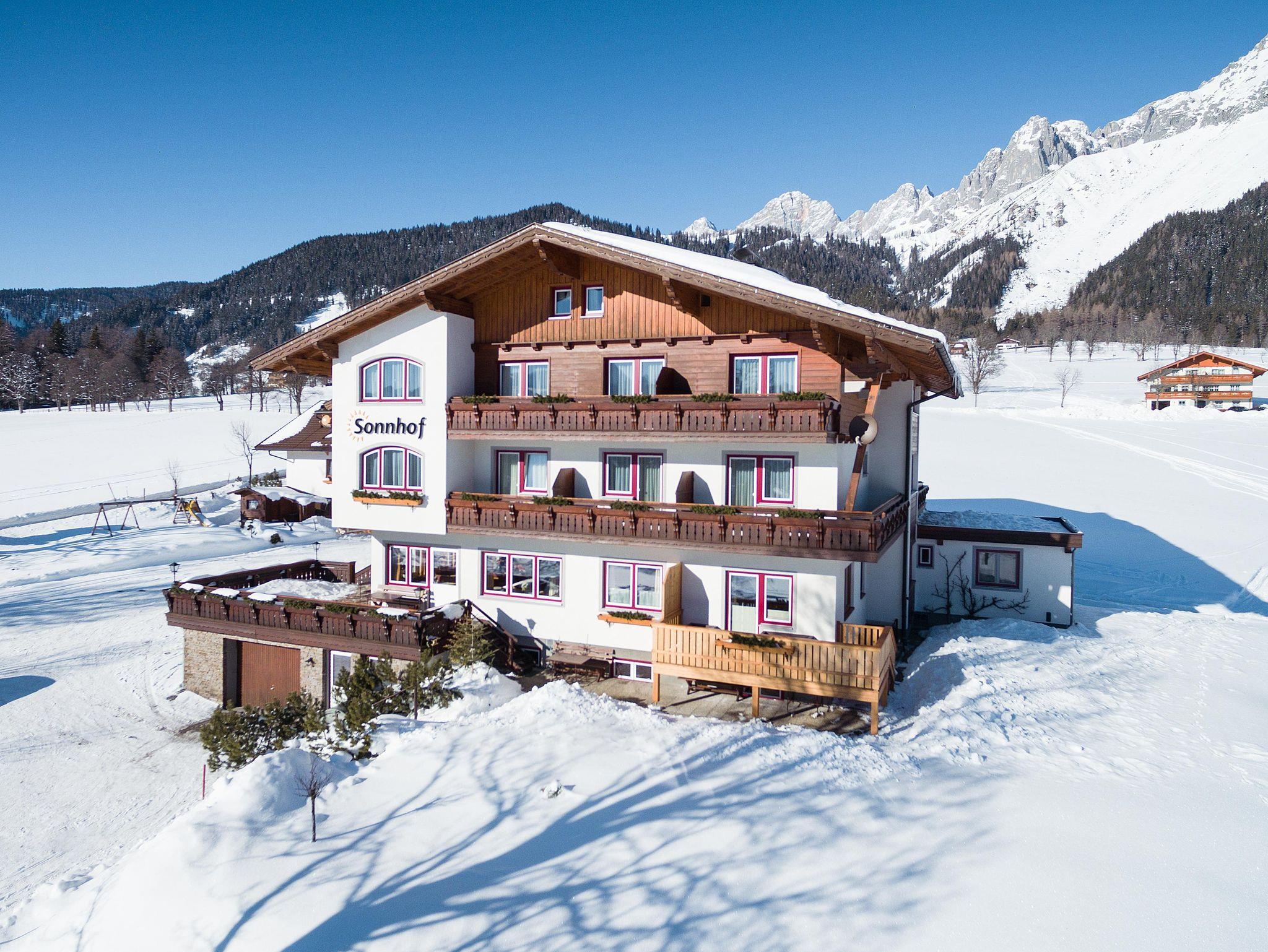 Bei uns am Sonnhof auf 1225 Metern Seehöhe vereinen sich Gastfreundlichkeit, Gemütlichkeit und Komfort. Unsere gemütliche Pension befindet sich zwischen Ramsau Ort und Rittisberg. Genießen Sie den Blick auf die Schhladminger Tauern (Planai, Hochwurzen, Reiteralm) und den Dachstein. Der Rittisberg und die anderen Skilifte in der Ramsau sind in unmittelbarer Nähe. Die Skiberge Planai, Hauser Kaibling, Reiteralm, Hochwurzen und Dachsteingletscher sind mit dem Auto oder Skibus in weniger als 15 Minuten erreichbar. Mit dem Ski Amadé Ticket stehen Ihnen weitere 870 Pistenkilometer zur Verfügung! Die Loipen von Ramsau am Dachstein, die Skischulen, Ramsau Beach, Rittisberg, Wanderwege am Ramsauer Plateau und Dachstein Almgebiet liegen nur wenige Meter von der Pension Sonnhof entfernt. In den Wintermonaten verwandelt sich Ramsau in ein wahres Winterparadies. Genießen Sie die klare Luft der Ramsauer Bergwelt und nutzen Sie die vielfältigen Winteraktivitäten. In etwa 20 Gehminuten erreicht man den Ramsauer Ortskern, wo sich auch das WM Stadion Ramsau am Dachstein sowie das Nordische Trainingszentrum befindet, stets begleitet durch das atemberaubende Panorama des Dachsteinmassivs. Wohnen Sie in neu renovierten Doppelzimmern, Familienzimmern oder Ferienwohnungen. Im Zimmer und Appartement: Balkon mit Bergblick, Flachbildschirm & Sat-TV (auch HD), WLAN for free, Safe, Telefon und Haarfön. Die Zimmer sind bequem mit dem neuen Etagenlift erreichbar! Lassen Sie sich von uns verwöhnen und genießen Sie unser reichhaltiges Frühstückbuffet. Hier am Sonnhof können Sie sich sowohl im Haus, wie auch außerhalb sportlich betätigen. Langlaufen, Skifahren, Wandern, Schneeschuhwandern, Skitourengehen, Nachtrodeln am Rittisberg, Baden im Hallenbad Ramsau (1 km), und Vieles mehr - das ist der Luftkurort Ramsau am Dachstein inmitten der Region Schladming - Dachstein. Immer einen Ausflug wert sind auch Filzmoos bzw. die Höhenloipe Rossbrand mit 360 Grad Rundumblick vor der Kulisse der Bischofsmütze im Salzburger Land. TIPP: Buchen Sie als Hausgäste im Sonnhof einen Skikurs (Alpin oder Langlauf) bei der Schischule Ramsau ! Entspannen Sie sich danach in unserer hauseigenen Sauna und tanken Sie wieder neue Energie. Ihre Gastgeber Familie Perner