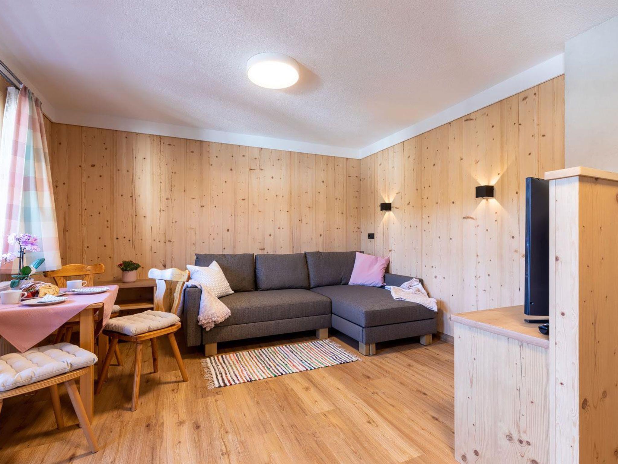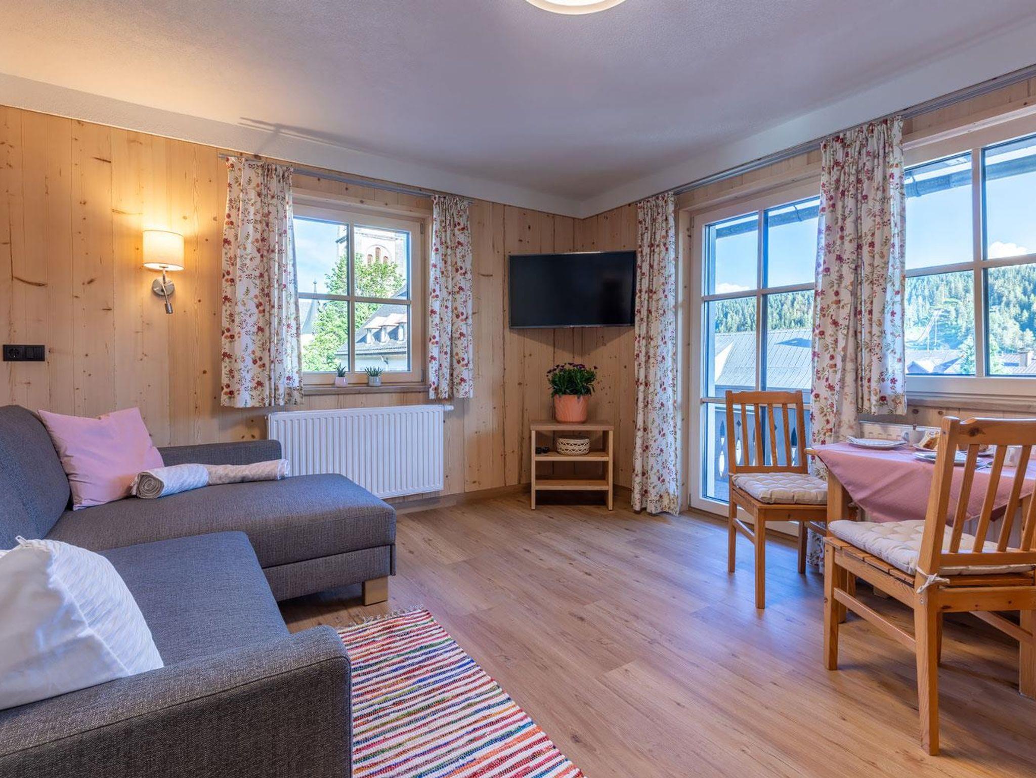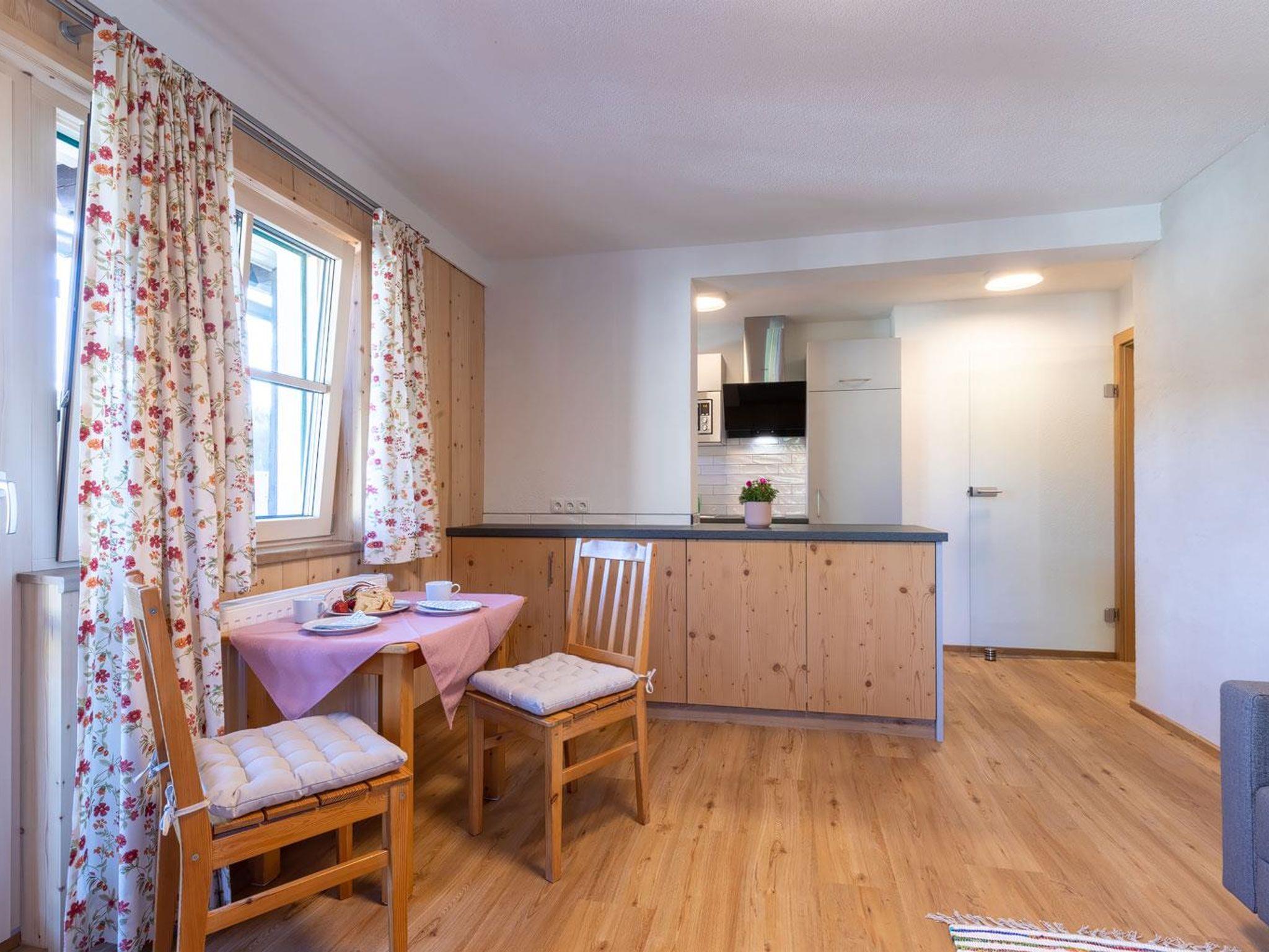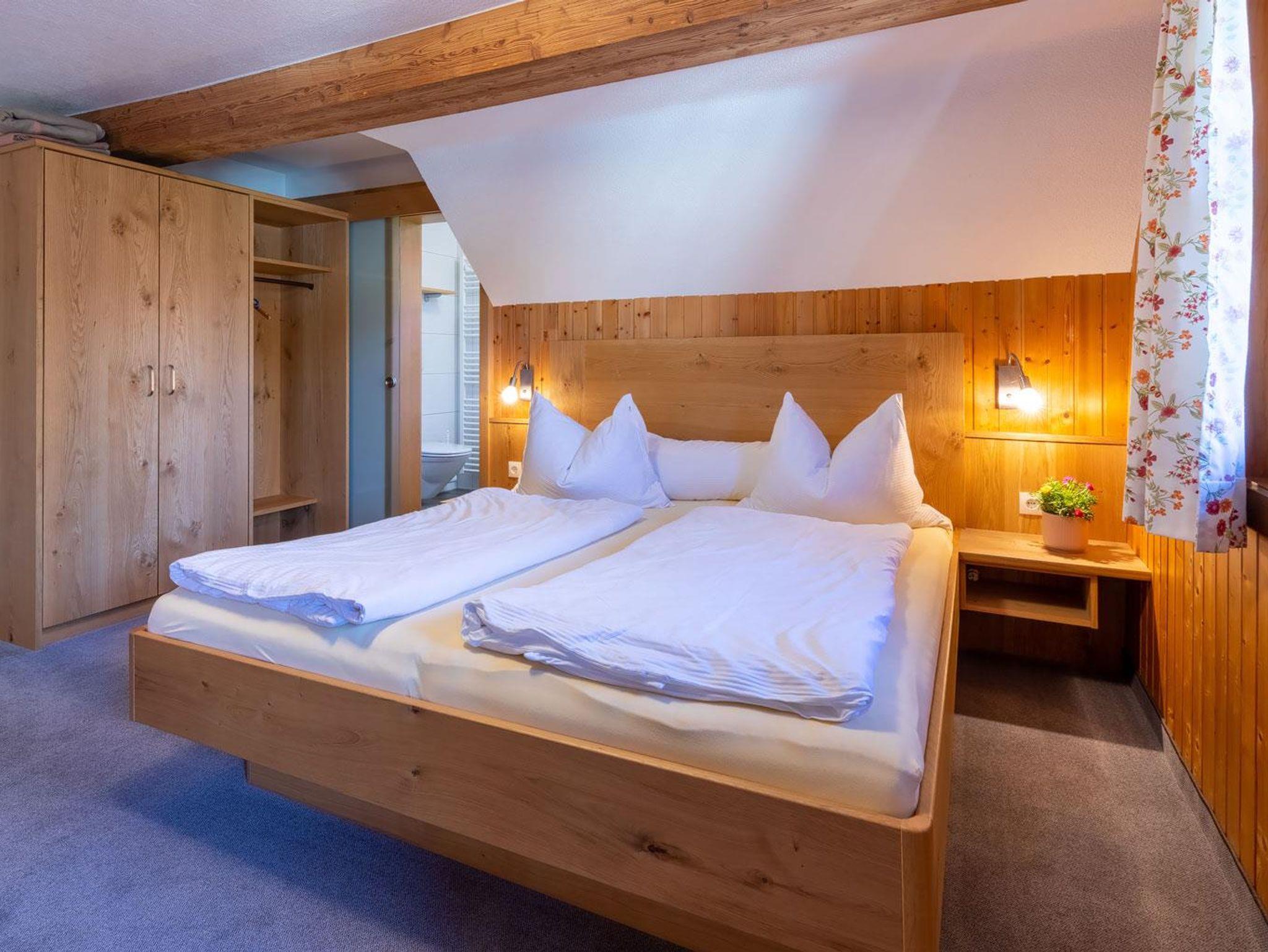 Unser Appartement III Edelweiß befindet sich im 1. OG und ist Richtung Süden/Osten ausgerichtet. Das Appartement ist nach der Renovierung 2021 eine sonnige und gemütliche Oase zum Ausspannen. Viel Holz und eine liebevolle Einrichtung laden zum Entspannen und genießen ein. Ein Doppelzimmer mit Holzboden und Holzmöbel, ein großzügiges Bad mit Dusche, separatem WC, geräumigem Vorraum runden das Highlight - die Wohnküche Richtung Süden mit Balkon (Süden und Osten) ab. Hier sind eine voll ausgestattete Küche mit Esstisch sowie ein gemütliches Sofa mit Fernsehecke untergebracht. Der helle, freundliche Raum und im Sommer der gemütliche Balkon laden zum Genießen ein.