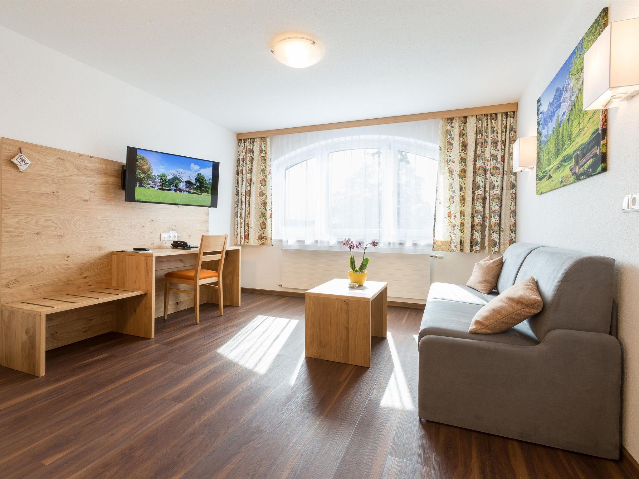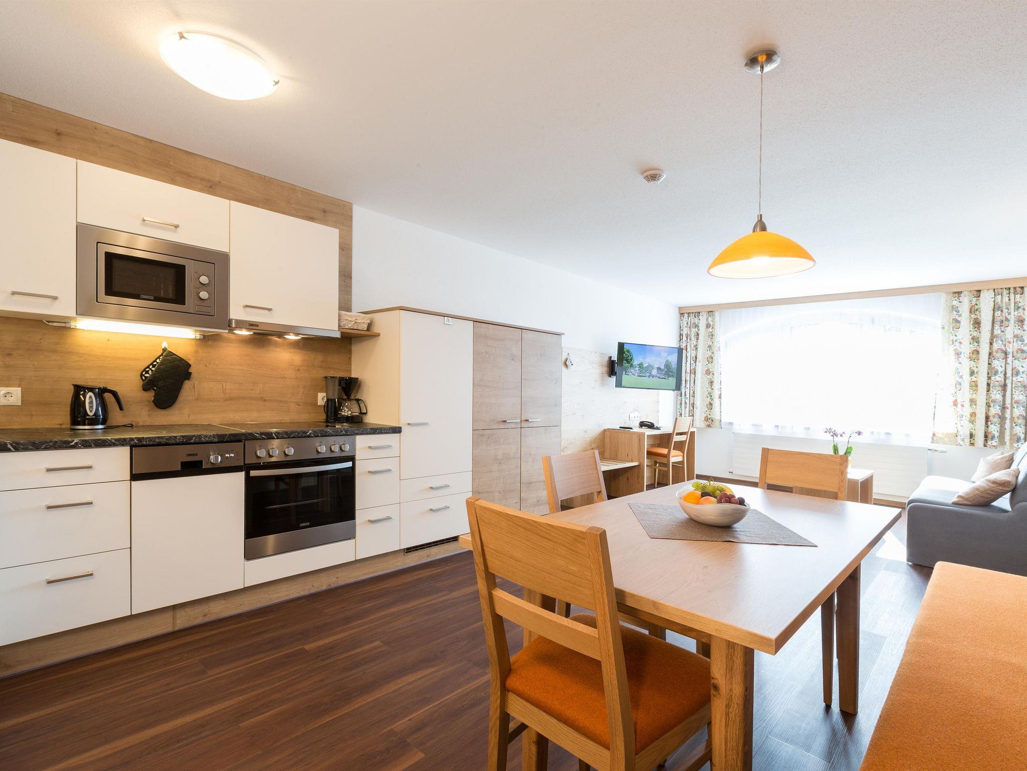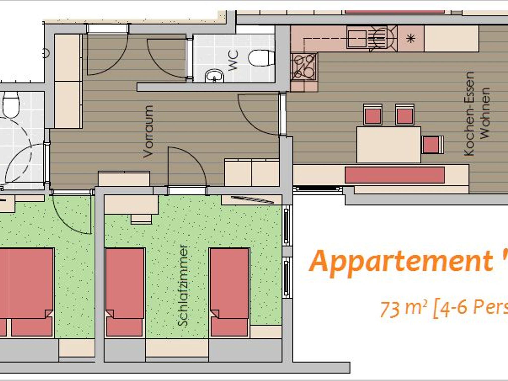 Unser Appartement SONNHOF bietet mit 73 m² für 4 - 6 Personen Erholung pur. Hier sorgen 2 charmante Schlafzimmer für erholsame Nächte (eines davon mit verschiebbarem Bett). Großzügiges, auch rollstuhlgerechtes Badezimmer mit begehbarer Dusche und WC. Zusätzlich steht Ihnen ein 2. WC im Vorraum zur Verfügung. Genussreiche Stunden erwarten Sie im gemütlichen Wohn-Esszimmer mit vollausgestatteter Küche – perfekt für gemeinsames Kochvergnügen. Balkon mit herrlichem Blick auf das Dachsteinmassiv. Standardbelegung: 4 Personen, maximal 6 Personen (Couchbett)