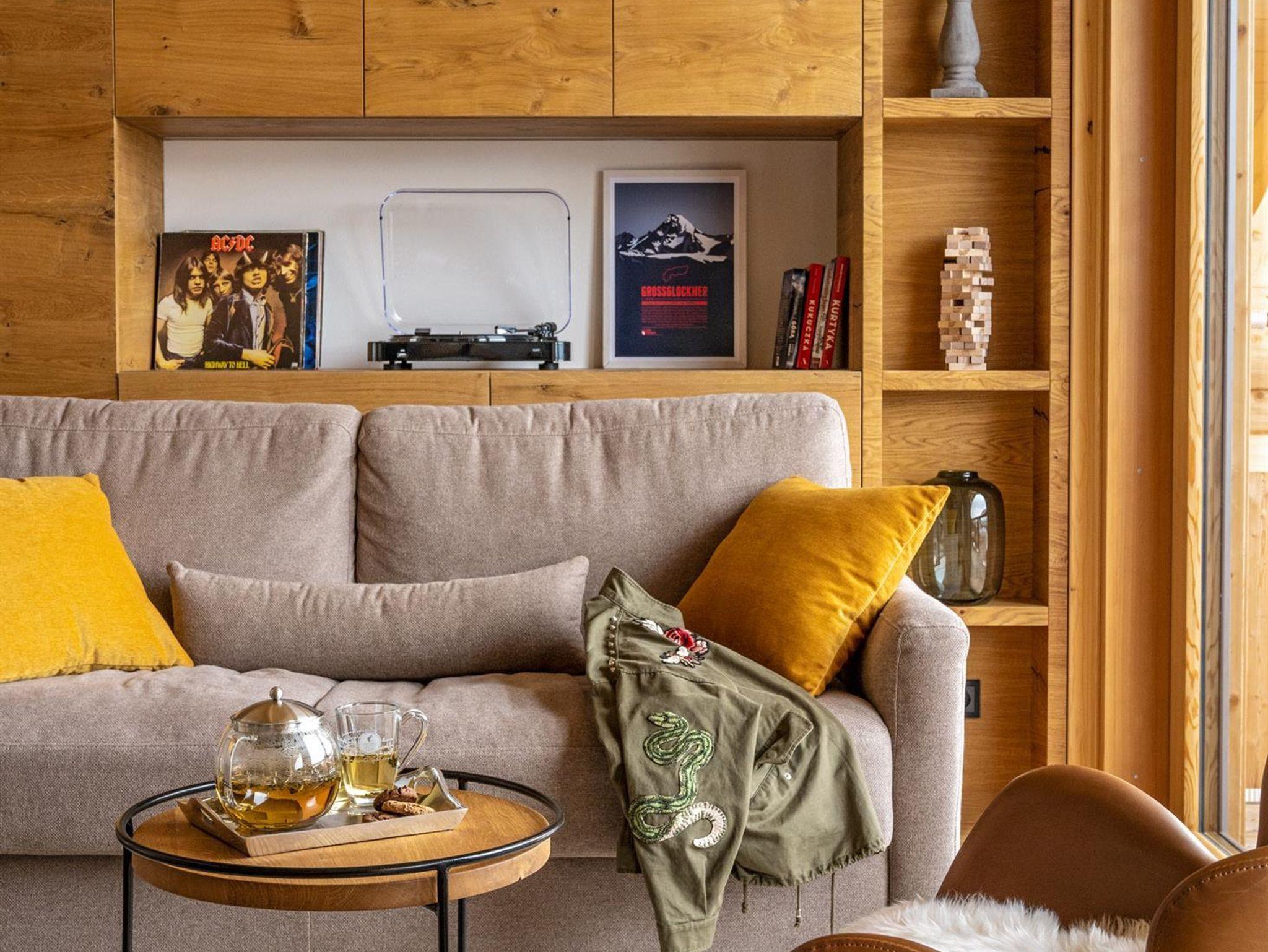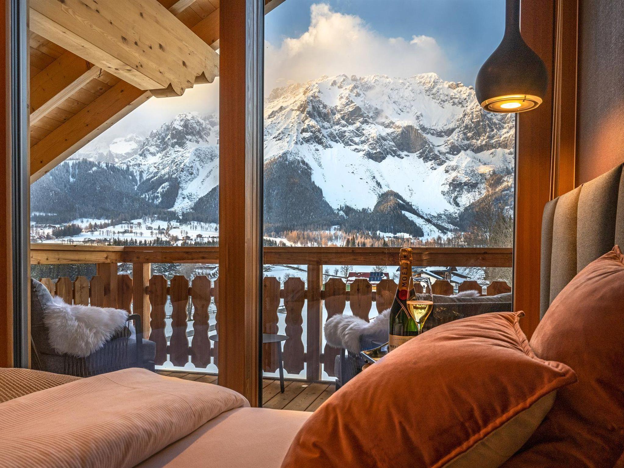 Hochwertigste Materialien treffen im Alpine-Cosmopolitan Design auf eine atemberaubende Aussicht auf das Dachsteinmassiv. Die Süd-West-Ausrichtung des Apartments bietet Sonne ganzjährig ab der Mittagszeit, im Sommer auch vormittags.