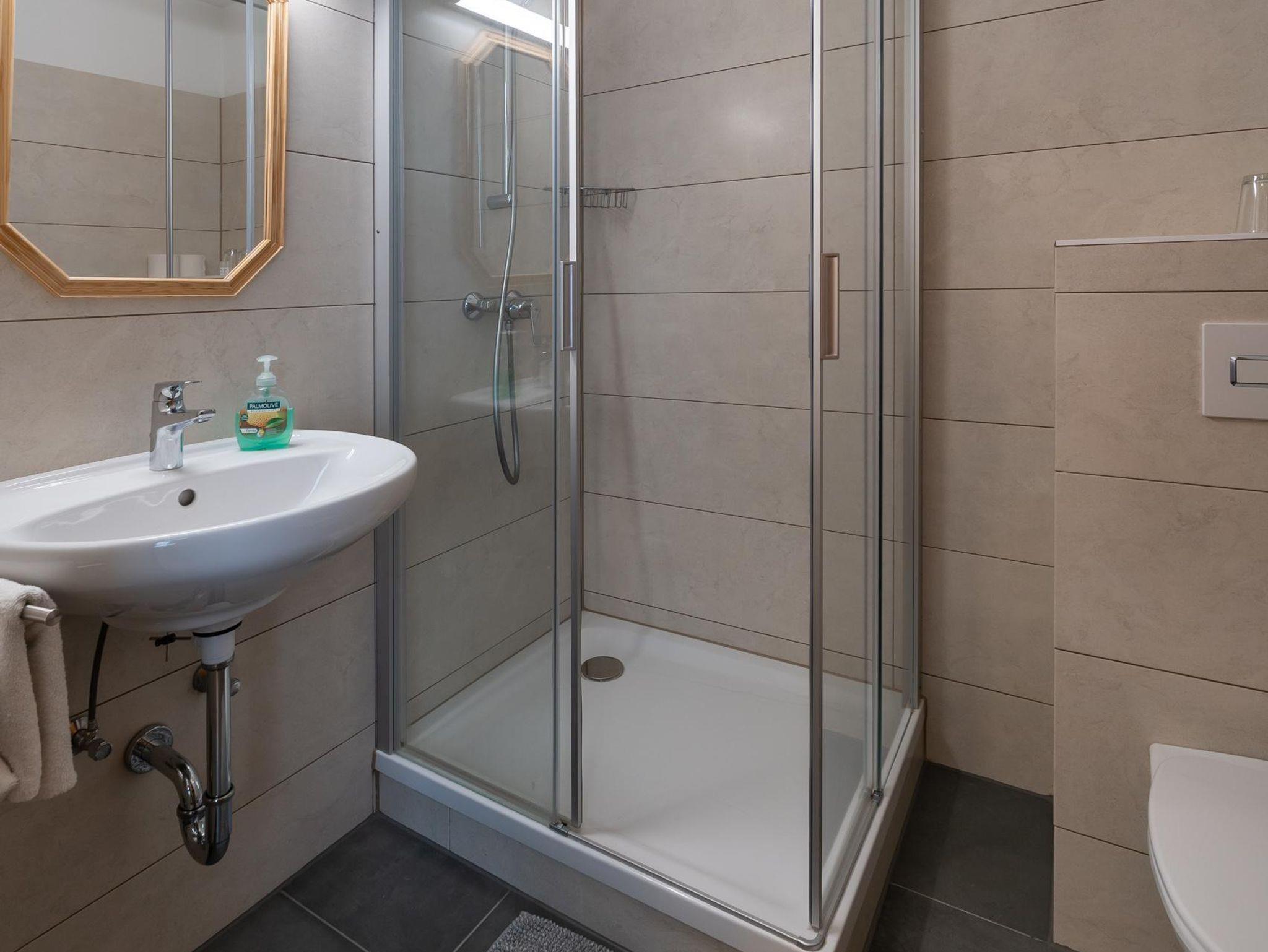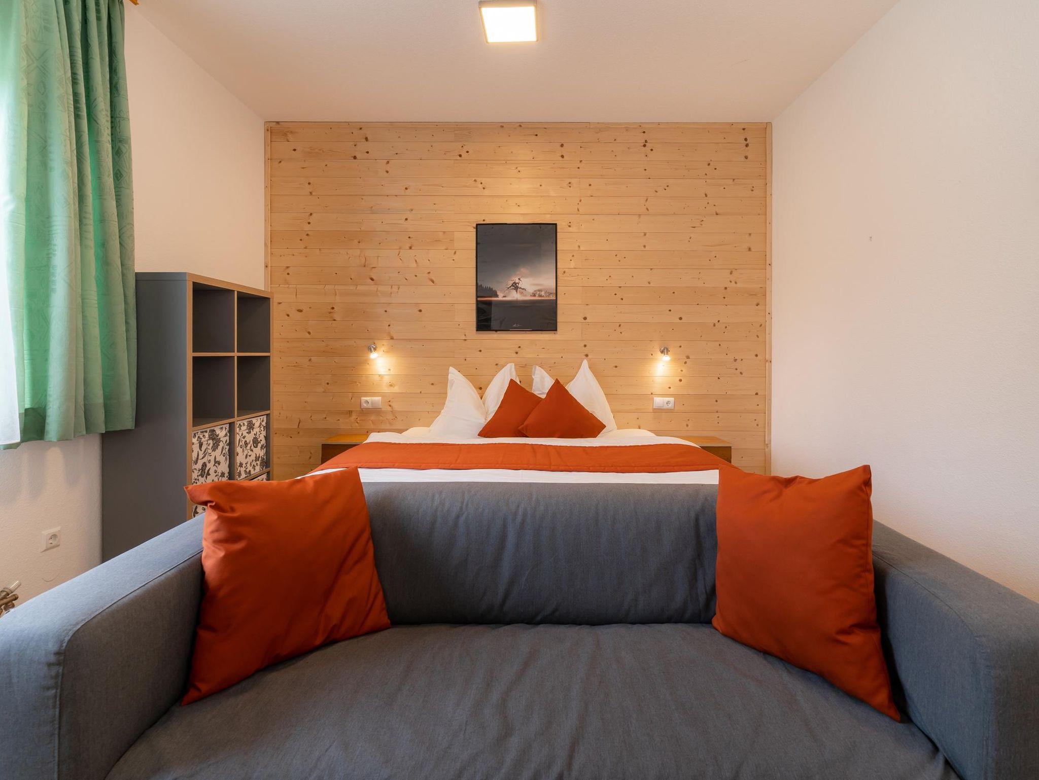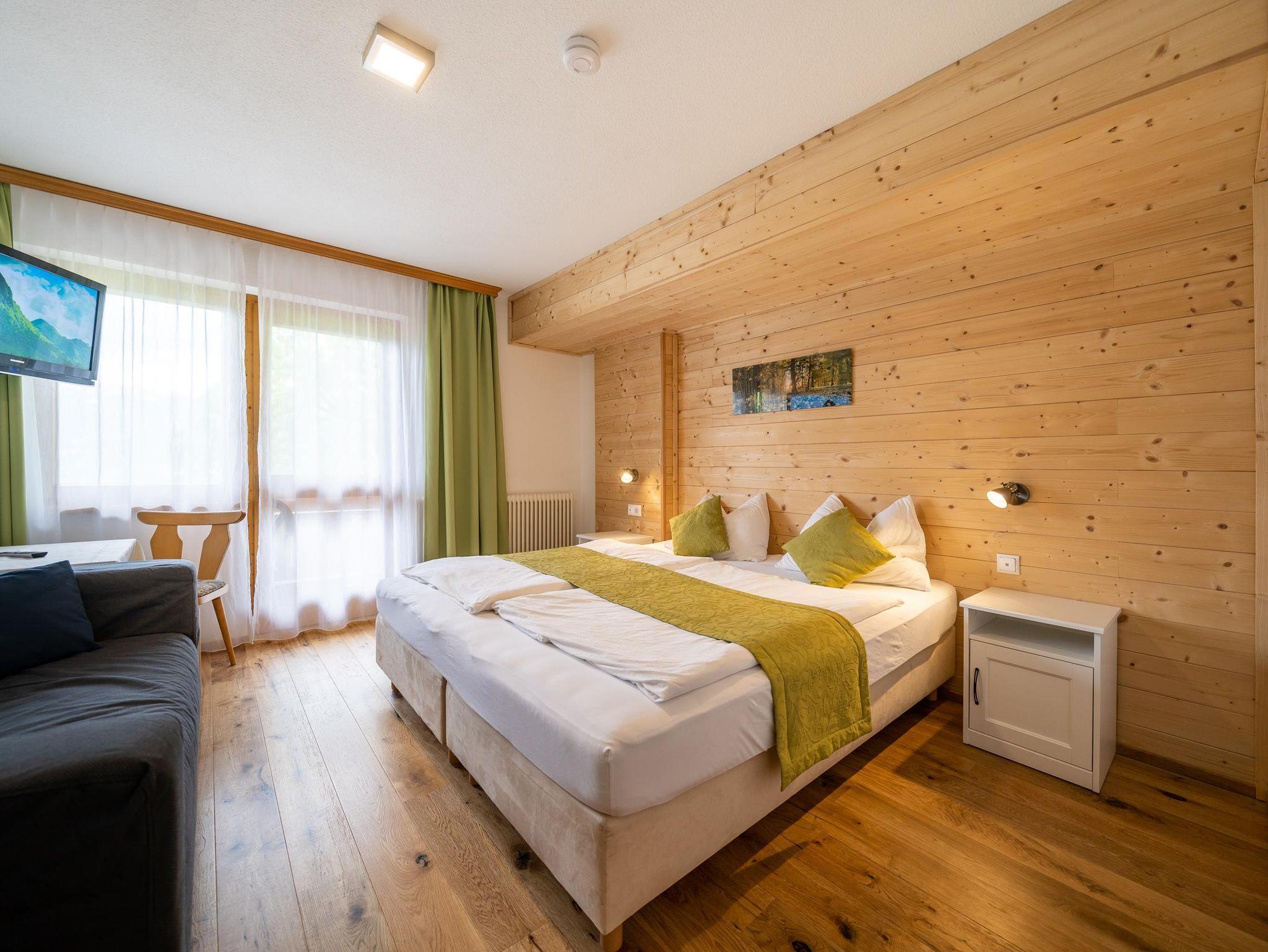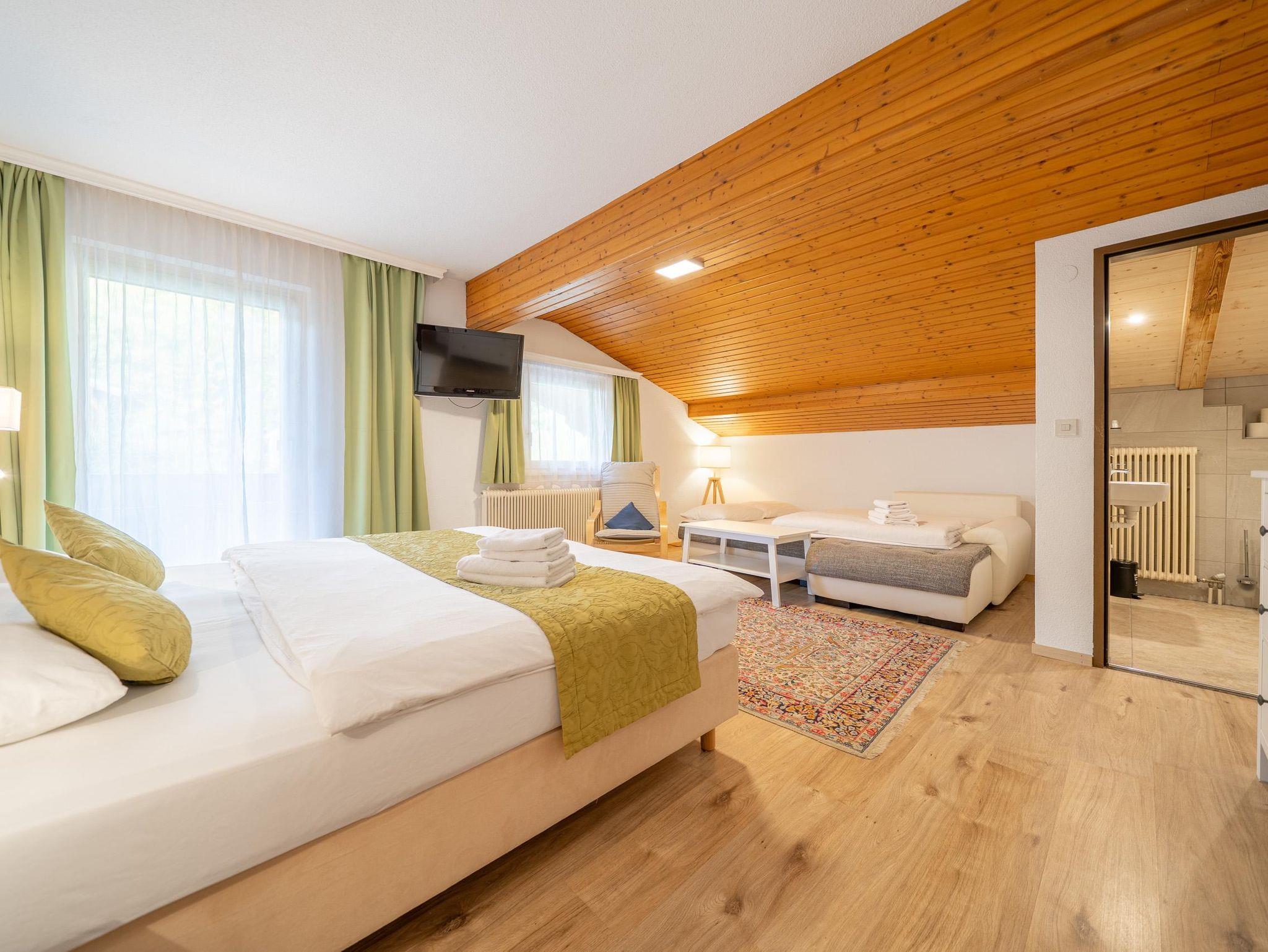 Das Zimmer ist komfortabel eingerichtet und bietet ein Doppelbett, Nachtkästchen, ein Sofa, einen Fernseher sowie ein Badezimmer mit Dusche und WC. Hier genießen Sie Ruhe, Komfort und eine traumhafte Aussicht – perfekt für erholsame Tage in den Bergen.
