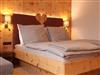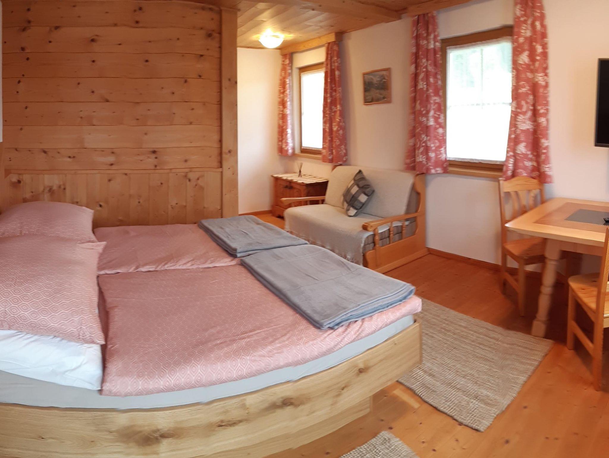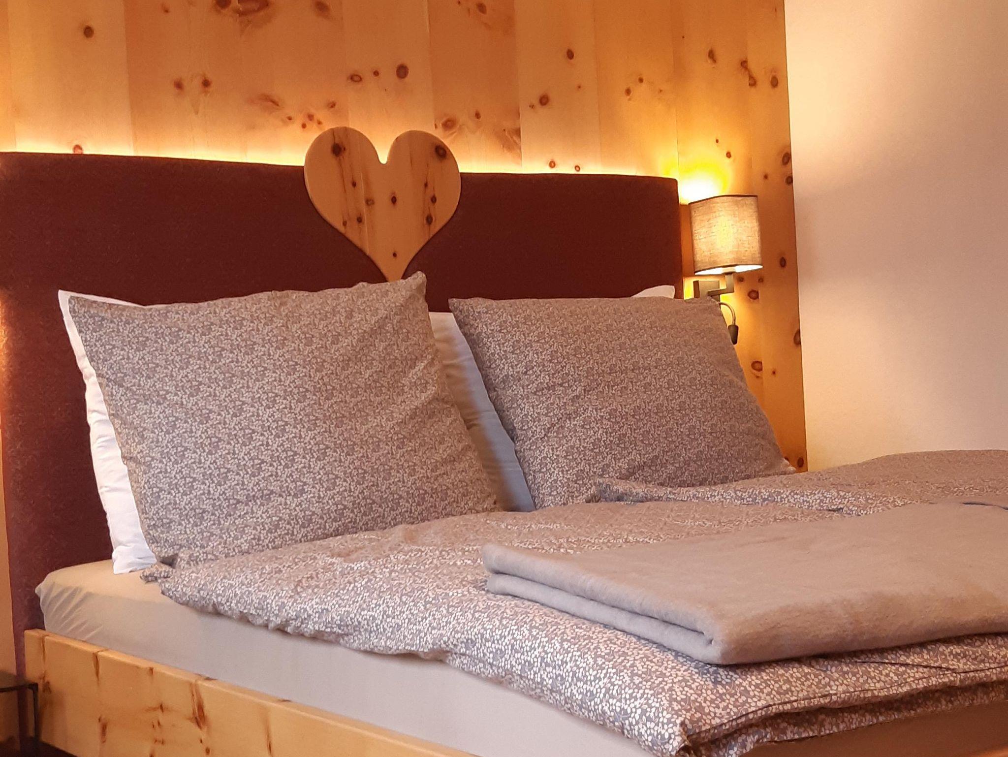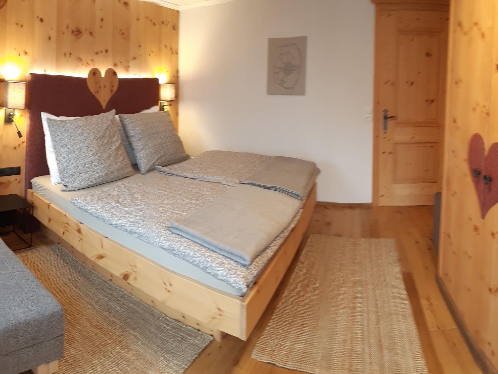 Das Zirbenzimmer aus Zirbenvollholz mit Doppelbett, Kleiderschrank, TV Gerät, ausziehbare Loung-Liege, Balkon, ein eigenes WC und Dusche mit Bodenheizung.