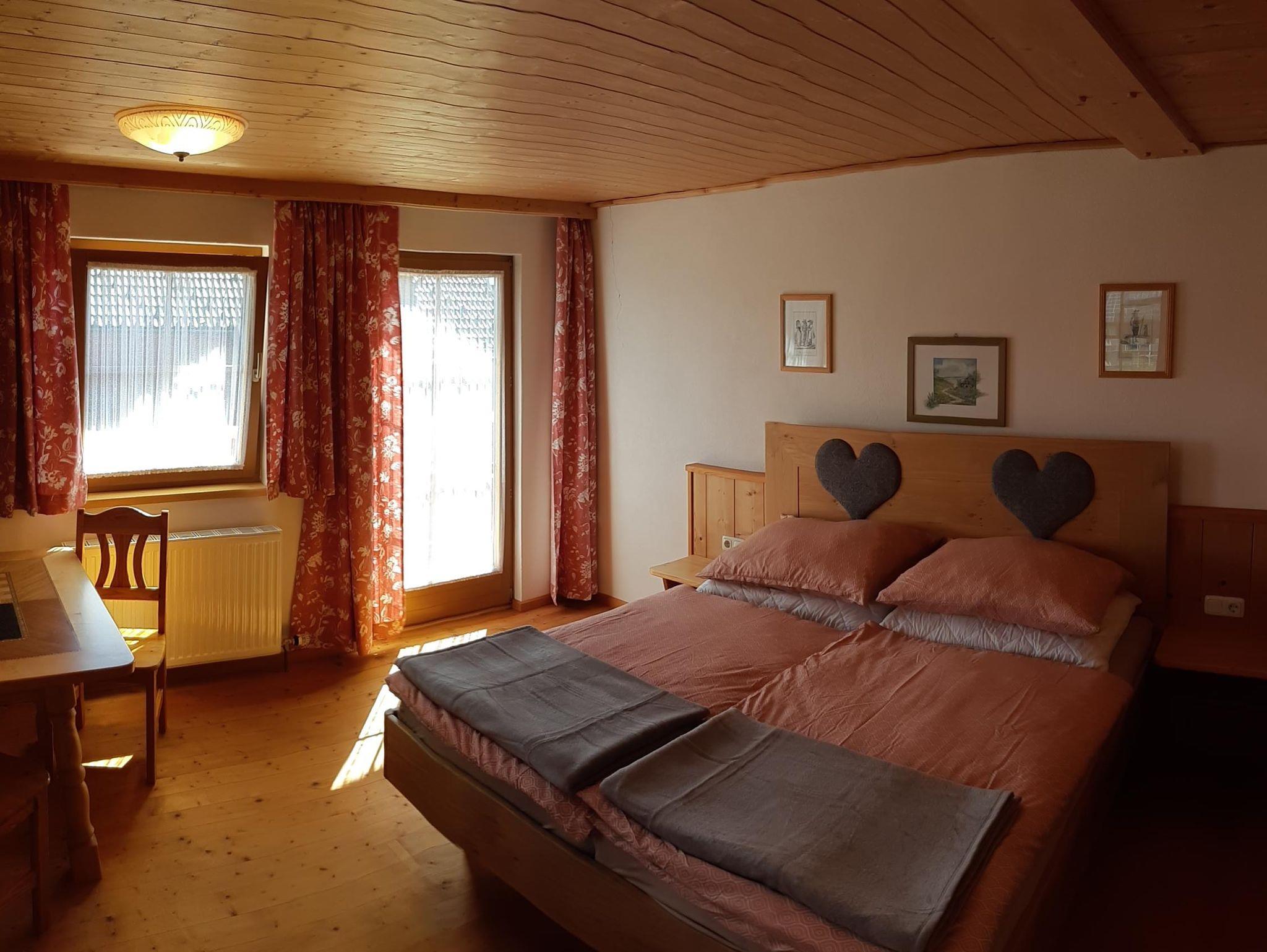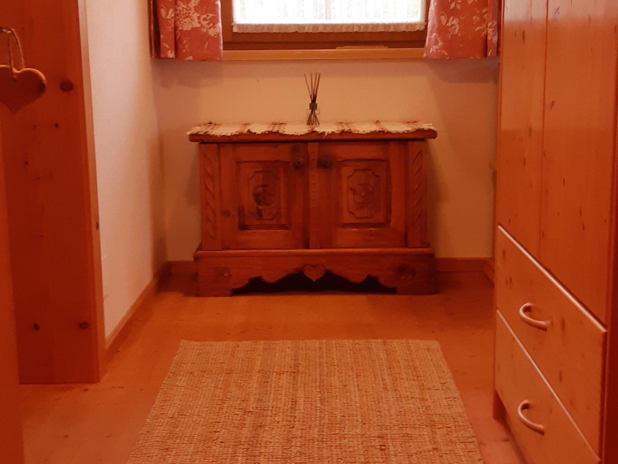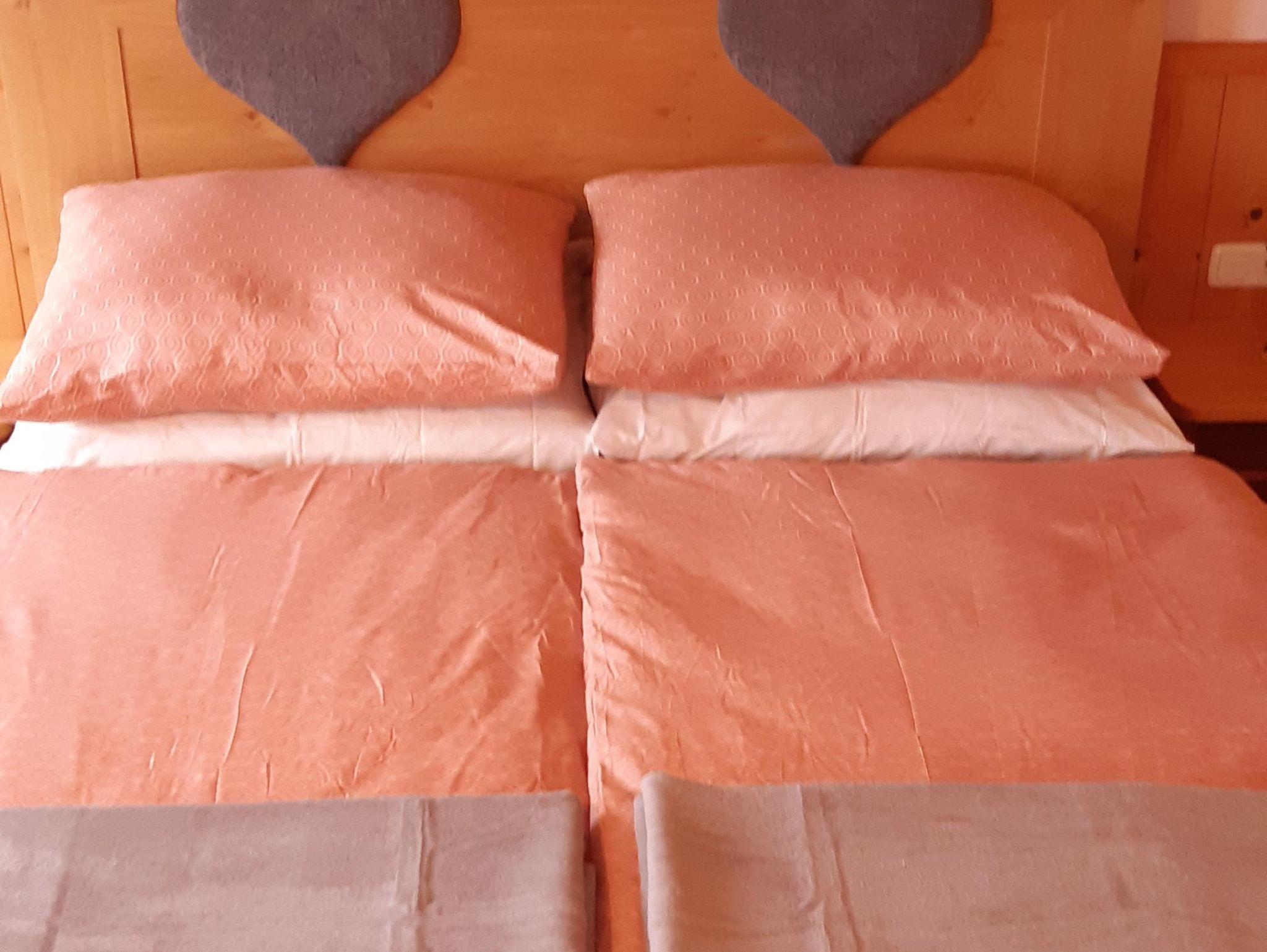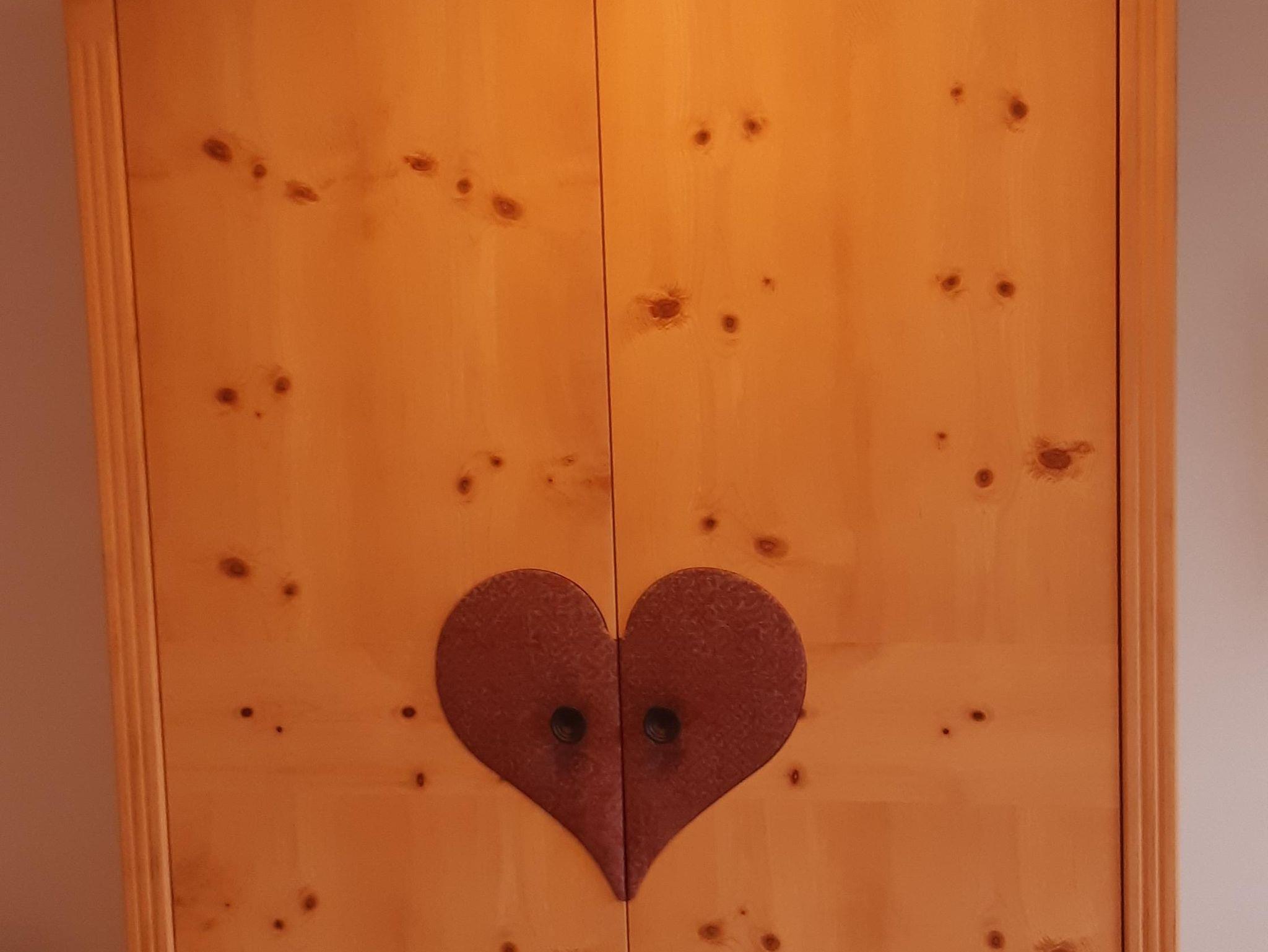 Das Zirbenzimmer aus Zirbenvollholz mit Doppelbett, Kleiderschrank, TV Gerät, ausziehbare Loung-Liege, Balkon, ein eigenes WC und Dusche mit Bodenheizung.